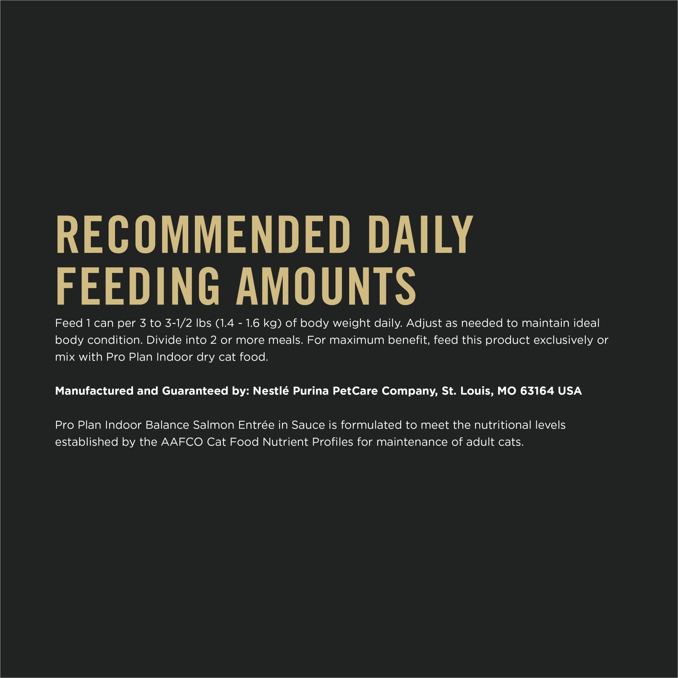 Your indoor cat has specific nutritional needs to help them be their healthy best, so answer those needs by feeding them Purina Pro Plan Indoor Cat Food Balance Grilled Salmon Entree in Sauce. You’ll love the fact that this weight-control cat food is skillfully crafted to provide your feline companion with complete and balanced nutrition for the maintenance of adult cats. Meanwhile, you’ll both love that this delicious canned cat food formula is made with real salmon to tempt your cat to her dish every time. To ensure your cat gets the essential nutrients her body craves, each mouthwatering serving of this Purina Pro Plan cat food recipe offers a plethora of nourishing ingredients, including 25 essential vitamins and minerals, plus the amino acid taurine. Also included in this moist cat food recipe is added fiber, which not only helps promote healthy digestion but also supports a healthy weight for cats. With its tempting taste and nourishing ingredients, this soft cat food formula is sure to become a staple of your feline’s mealtime routine. Indoor cats require a diet formulated to fit their daily nutritional requirements, so fill their dish with Purina Pro Plan Indoor Cat Food Balance Grilled Salmon Entree in Sauce at every mealtime.