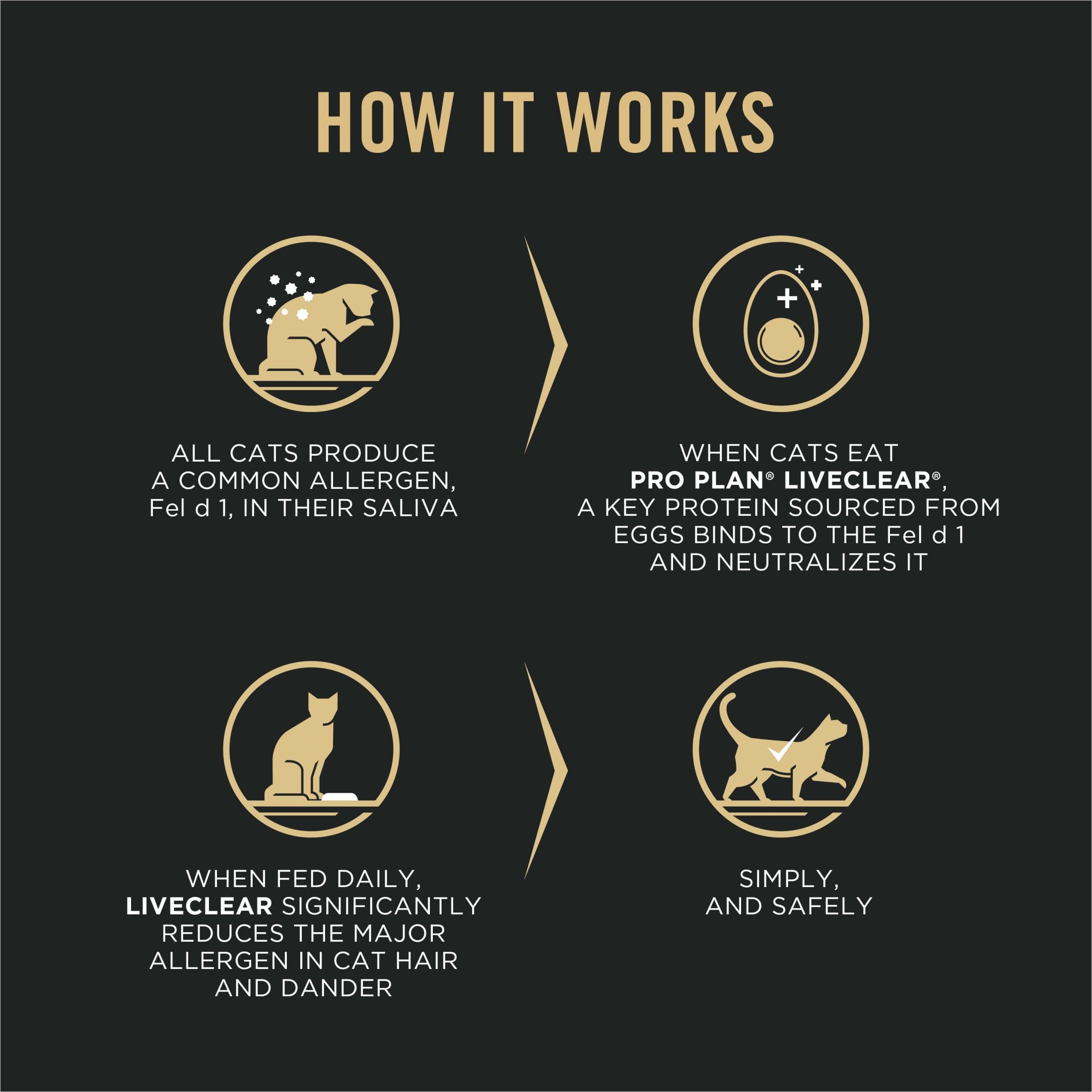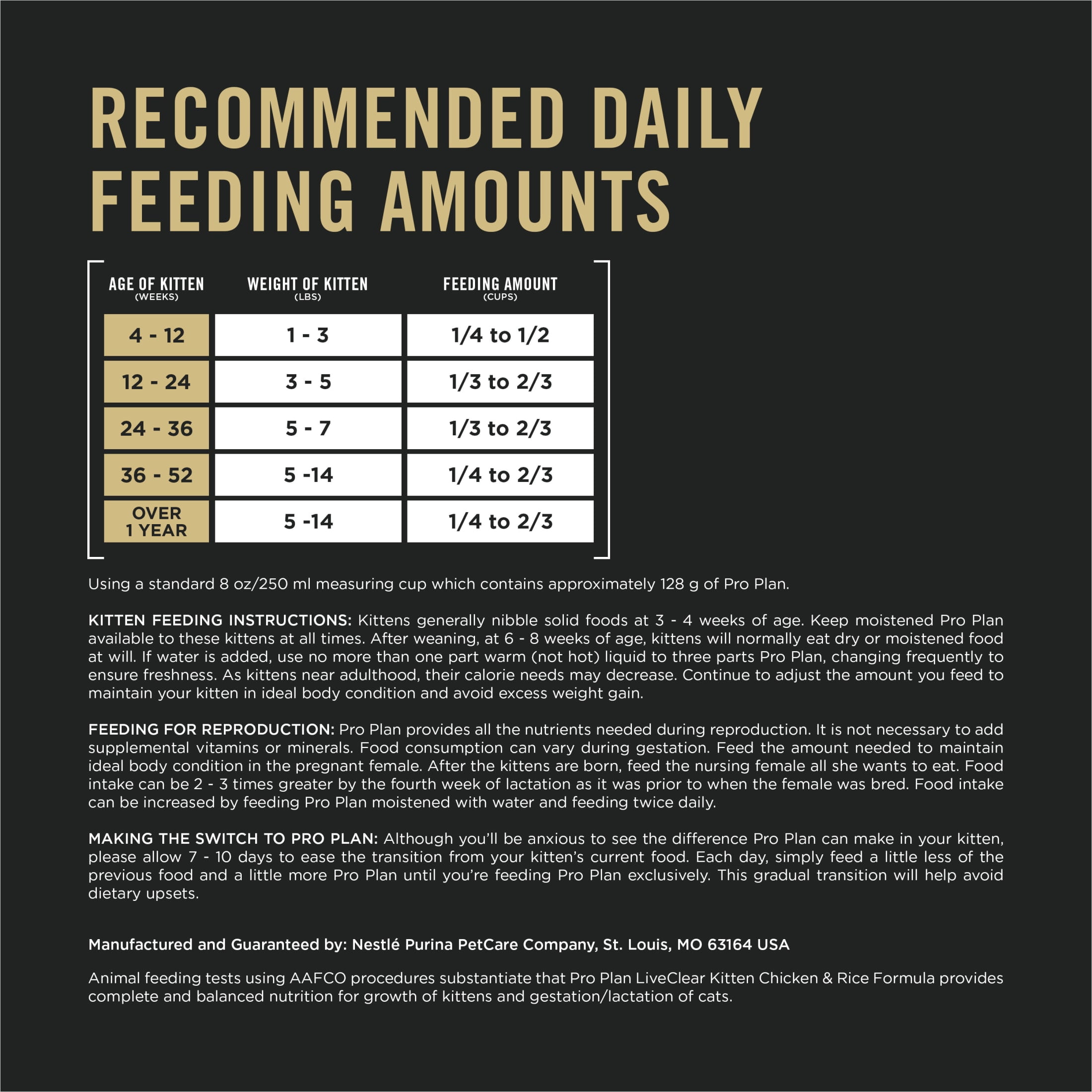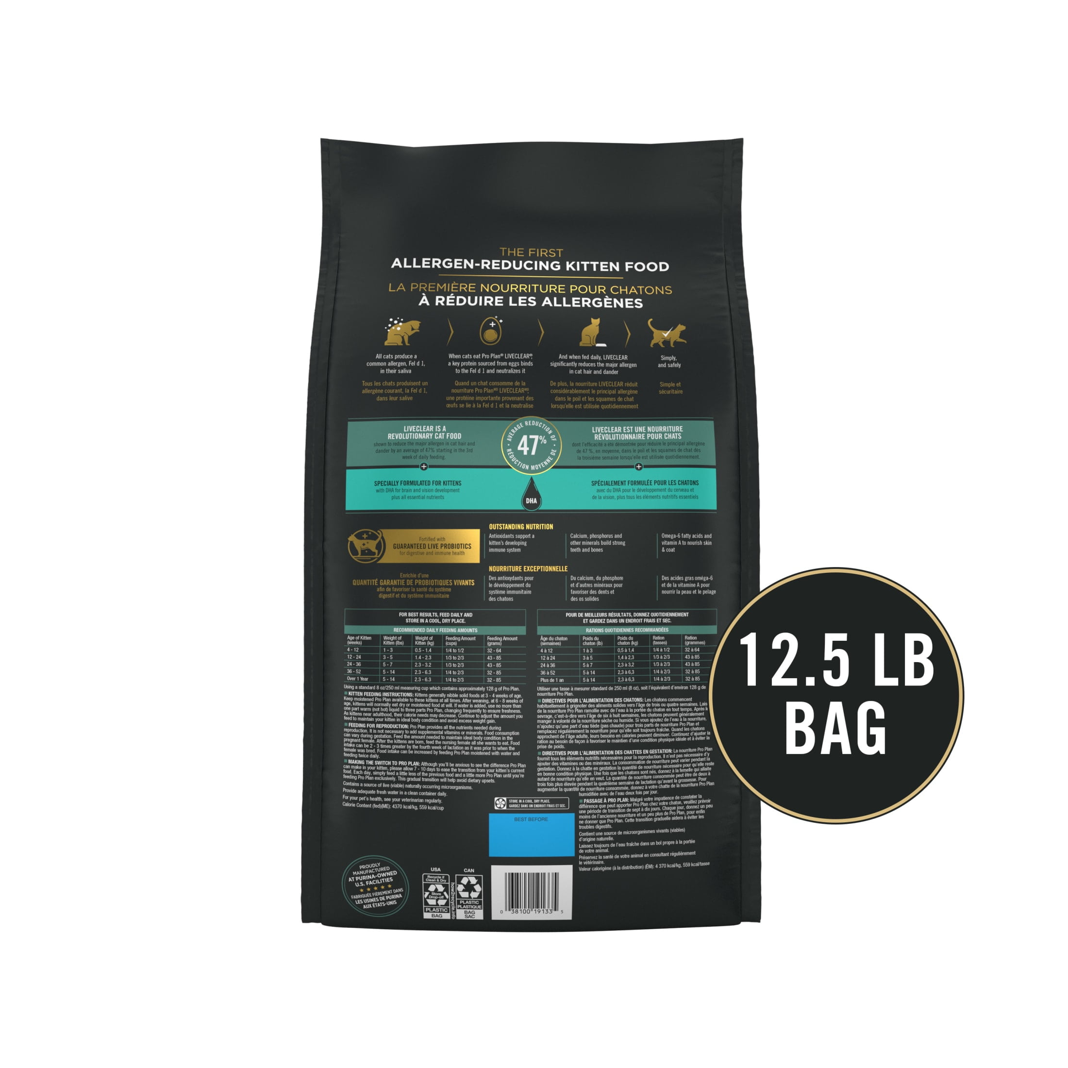 Purina Pro Plan Liveclear for Cats Up To 1 Year Chicken Rice, 12.5 lb Bag The first and only kitten food with the power to reduce cat allergens by simply and safely neutralizing Fel d 1 A common allergen in cat saliva, with a key protein from eggs Chicken and rice recipe Purina high protein cat food for kittens supports lean muscle development Safe and nutritious, this rice and chicken cat food is fortified with guaranteed live probiotics for cats to maintain digestive and immune health This dry kitten food includes calcium, phosphorus and other minerals to promote strong bones and teeth Spoil your pet with Purina products. Reward yourself with points on every purchase. Download the myPurina app today