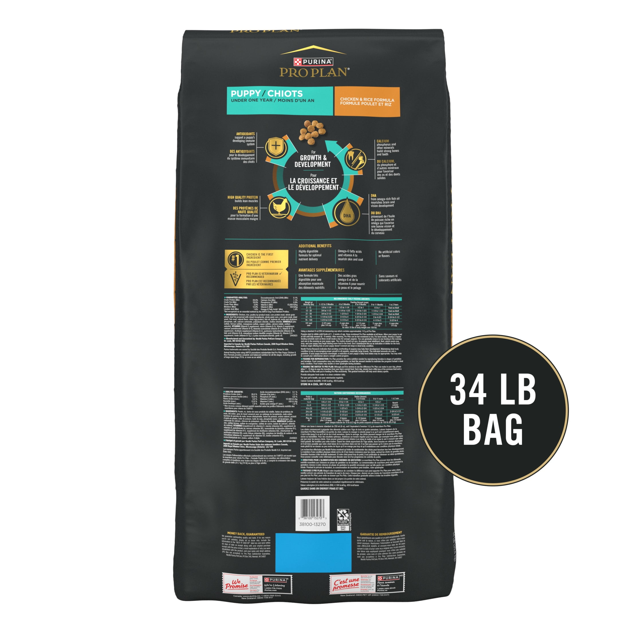 Purina Pro Plan Puppy Dry Dog Food, Lean Muscle Support, High Protein Chicken & Rice, 34 lb Bag DHA from omega-rich fish oil nourishes brain and vision development High quality protein builds lean muscles, with chicken as the first ingredient Antioxidants support a puppy’s developing immune system Calcium, phosphorus and other minerals build strong bones and teeth Vitamin A and omega-6 fatty acids to nourish skin and coat Spoil your pet with Purina products. Reward yourself with points on every purchase. Download the myPurina app today