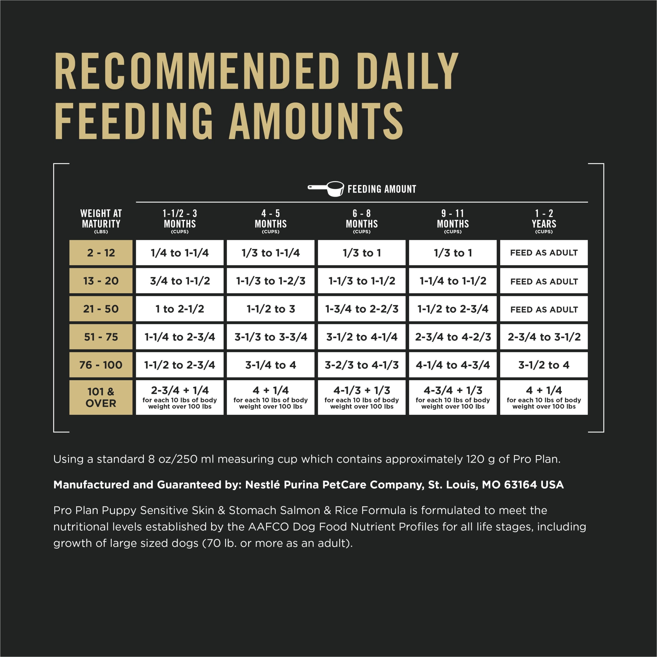Cater to your growing puppy’s unique nutritional needs during his first year of life with Purina Pro Plan Puppy Sensitive Skin and Stomach Salmon and Rice Formula dry puppy dog food. Purina carefully choses every high-quality ingredient in this wholesome dry dog food for puppies and use salmon as the first ingredient for a specific nutritional or functional purpose. DHA from omega-rich fish oil for dogs nourishes his brain and vision development, while omega-6 fatty acids and vitamin A make this an excellent dog food for healthy skin and a lustrous coat. A supply of antioxidants in each serving of this Purina Pro Plan salmon puppy dry food supports your growing puppy’s developing immune system, while calcium, phosphorus and other minerals help build strong bones and teeth. Purina fortifies this Purina Pro Plan with natural prebiotic fiber to nourish specific intestinal bacteria for digestive health and include easily digestible rice that’s gentle on the digestive system. Purina Pro Plan dog food for sensitive stomach and skin is made without artificial colors or flavors and without corn, wheat or soy. Serve your growing canine companion complete and balanced puppy nutrition with Purina Pro Plan Puppy Sensitive Skin and Stomach Salmon and Rice Formula dry puppy dog food.