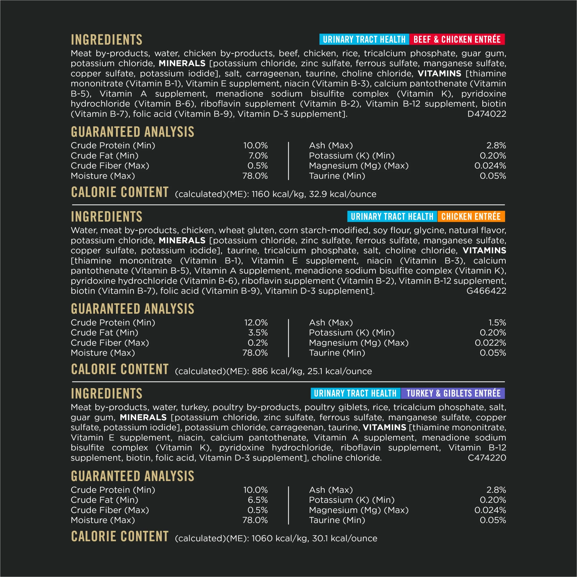 Treat your feline to a tempting variety of meals along with the extra care she needs with this Purina Pro Plan Urinary Tract Cat Food Wet Variety Pack Chicken, Beef and Chicken, and Turkey and Giblets. Three distinct high protein wet cat food entrees give you a way to make mealtime interesting, and each formula is made with real beef or poultry plus other high-quality ingredients for a taste cats love. Every pate cat food and gravy cat food variety in this urinary cat food collection is formulated to help maintain your cat’s urinary tract health by reducing urinary pH and providing low dietary magnesium. Purina’s highly digestible adult Purina Pro Plan wet cat food formulas promote optimal nutrient delivery and include 25 essential vitamins and minerals plus taurine, an amino acid critical for feline heart health. You’ll love that these urinary cat food recipes are made without any artificial preservatives and are proudly manufactured in Purina-owned facilities and that you can try them risk-free. Purina knows that you make careful decisions about the foods you serve your cat. With over 90 years of experience pushing pet nutrition forward, Purina is a trusted leader in the pet nutrition industry. Each batch of Purina’s dog or cat food undergoes regular checks to monitor safety and quality throughout the manufacturing process. Purina’s formulas meet or exceed industry standards. Order a Purina Pro Plan Urinary Tract Cat Food Wet Variety Pack Chicken, Beef and Chicken, and Turkey and Giblets to deliver the high-quality nutrition your feline friends deserve.
