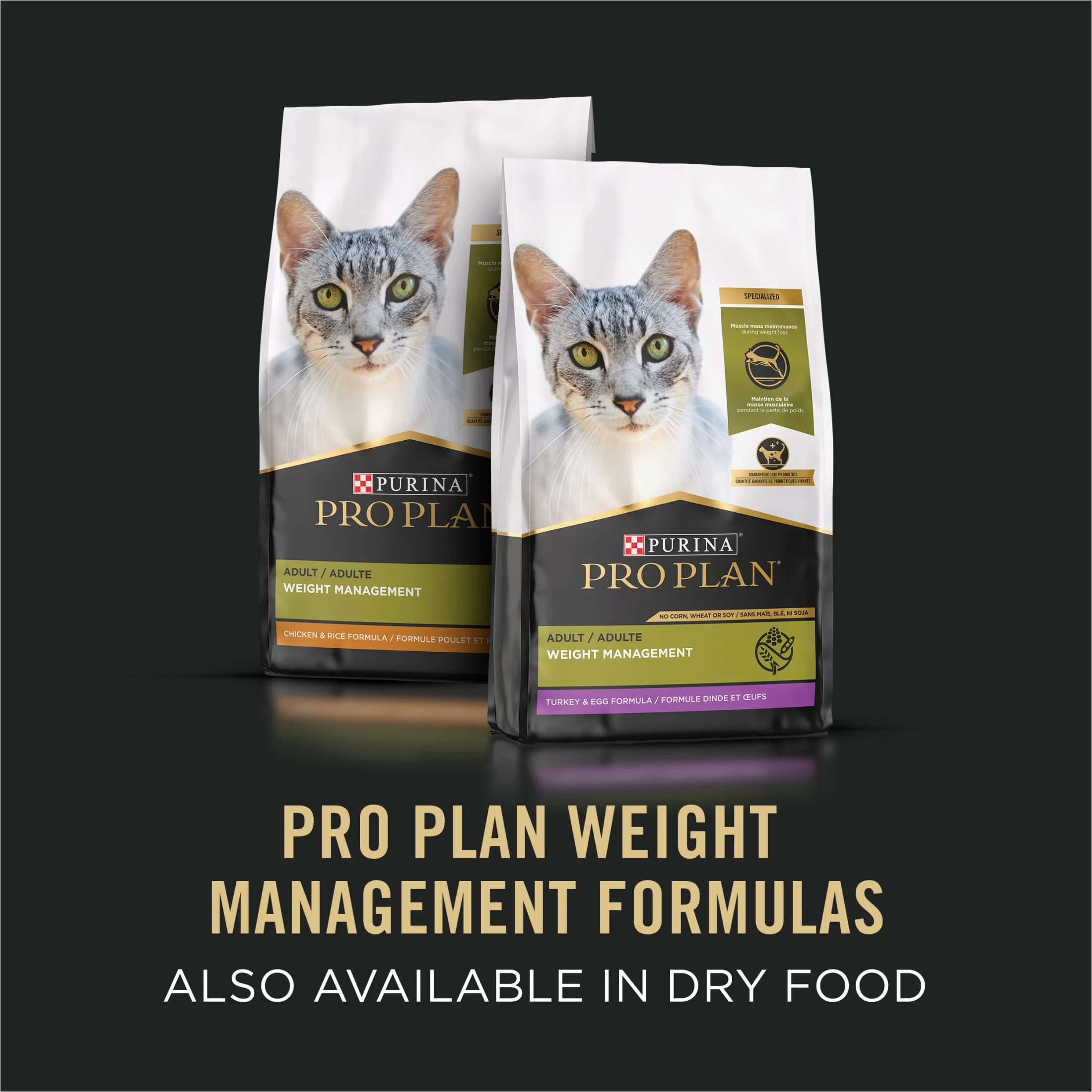 Purina Pro Plan Weight Management Wet Cat Food Turkey Rice, 3 oz Cans (24 Pack) High protein cat food maintains muscle mass during weight loss and is made with real turkey for a taste cats love Weight control cat food has 10 percent fewer calories than Pro Plan Adult Complete Essentials Classic Entree With Turkey and Vegetable Adult cat food includes antioxidants for a healthy immune system, and vitamin A and taurine support healthy vision No artificial colors or preservatives in turkey cat food formula with 25 essential vitamins and minerals plus taurine, an amino acid Weight management cat food proudly manufactured in Purina-owned facilities Spoil your pet with Purina products. Reward yourself with points on every purchase. Download the myPurina app today