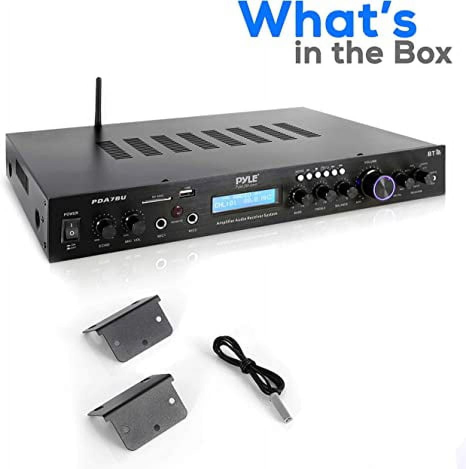 WIRELESS STREAMING: The receiver rack mount features a premium built-in Bluetooth 2.1 wireless streaming receiver. Making the receiver compatible with all your favorite devices, like iPhone, Androids, tablets, etc. It has a wireless range of 30’ plus. CONNECT TO EXTERNAL DEVICES: The rack mount home theater amp features USB flash and SD memory card readers, as well as a 3.5mm aux input jack and multi-source RCA audio input connectors. HOME STEREO AMP: The rack mount home theater amp is a complete sound system. It acts like an FM radio with a digital LCD display with ID3 tag readout displaying each song title. Also features a 2.1 channel audio amp design. RELIABLE & DURABLE: The home theater receiver is made of heavy-duty metal and aluminum alloy panel to protect your gear for years to come. The package includes sturdy removable rack mount brackets for trustworthy and easy installation. WHAT’S IN THE BOX: The audio receiver rack mount comes with everything you need to get started. This exclusive bundle from Pyle features our top-of-the-line amplifier receiver, wireless remote control, detachable hardware rack mounts and FM antenna.