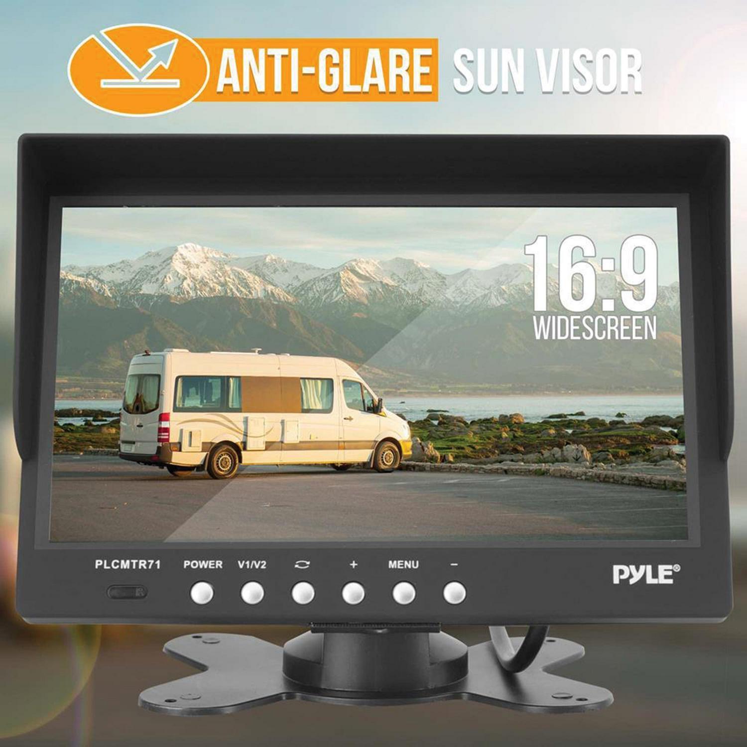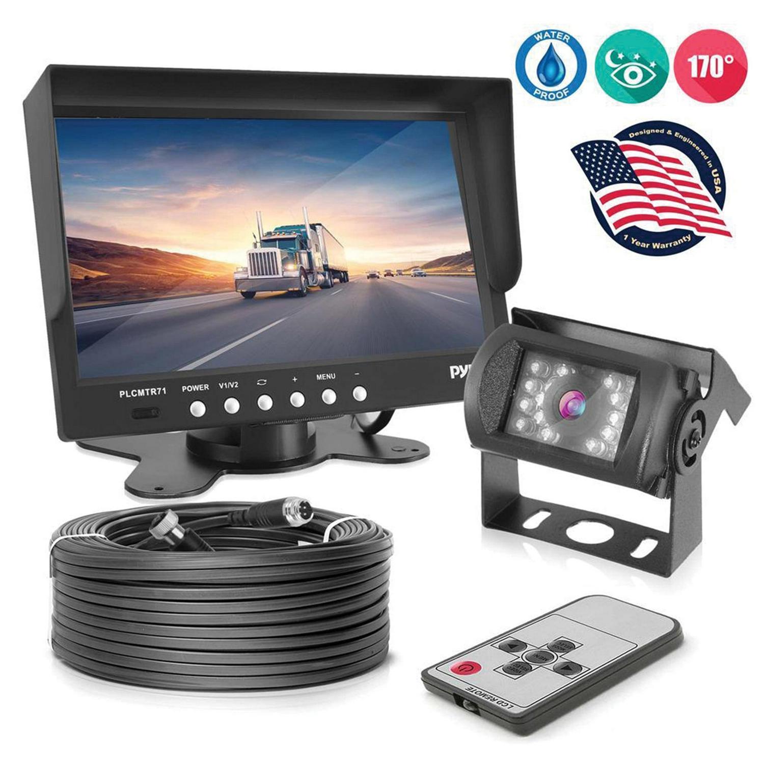 The Pyle PLCMTR71 7 in. Weatherproof Backup Camera System with IR Night Vision Camera comes equipped with everything you need to add an extra set of eyes when driving and parking. This kit comes equipped with LED-lighted IR night vision illumination camera, color LCD monitor, 50 ft. connection cable, remote control, wiring harness and universal monitor mount. This system is designed for your bus, trailer, van, truck, big rig or other vehicle with 12-volt/24-volt systems. Additional features include antiglare monitor sun shade, widescreen video display, auto image adjustment and more.