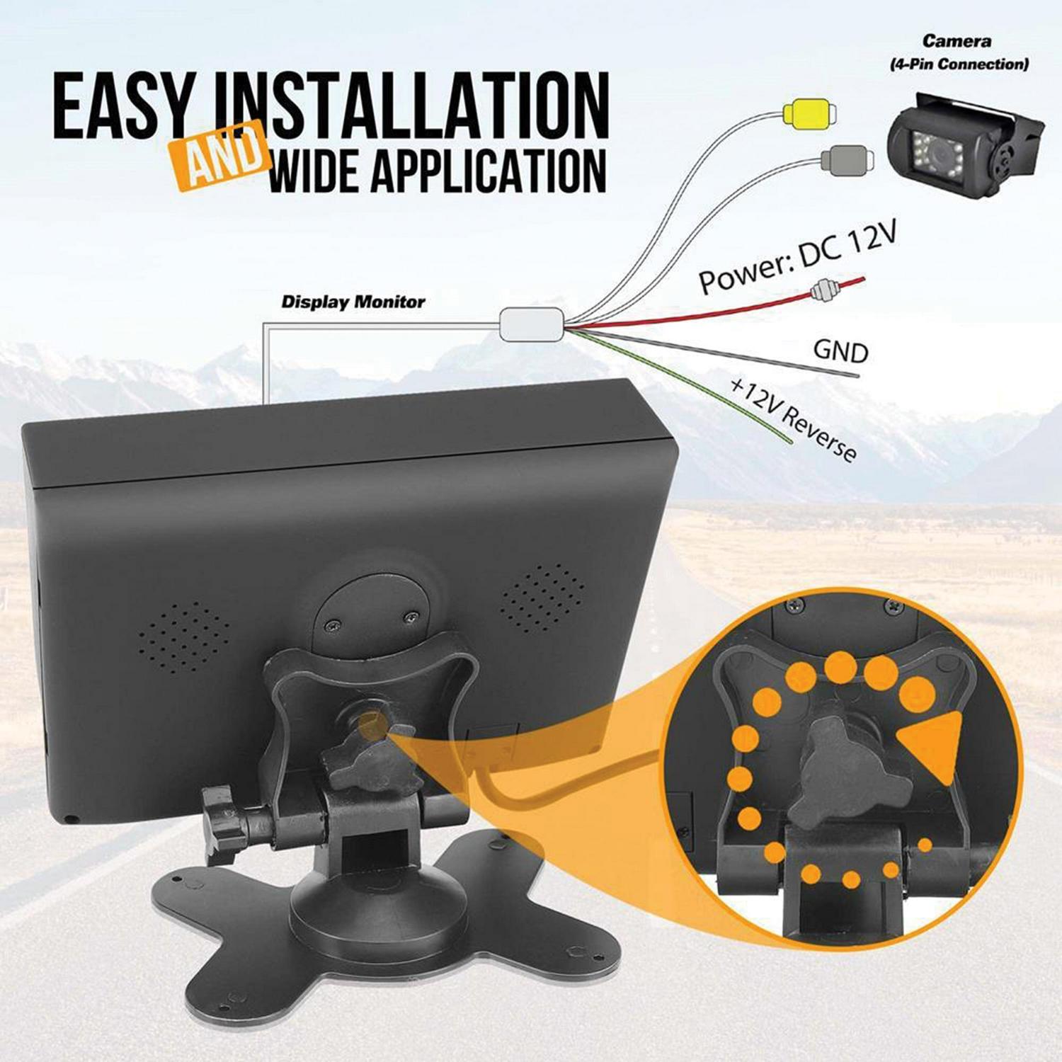 System includes: Universal, commercial-grade camera & LCD monitor, Designed for car & truck dual-DC 12V & 24V systems, Universal stand/mount, 4-pin 50ft connection cable, Power & wiring harness, Remote
