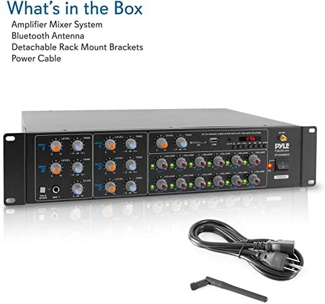 Wireless Bluetooth 6-channel amplifier provides stage, studio, at-home, or office entertainment Multi-zone audio control system boasts 6000 watts of max power with 4 to 8 ohms Hassle-free pairing and compatible with all of your favorite Bluetooth-streaming devices Front panel controls with input mode selector, independent channel controls, and LCD display Includes amplifier mixer system, Bluetooth antenna, detachable rack-mount brackets, and power cable RCA (L/R) input connectors, USB/SD, and Aux inputs; USB port doubles as a charging port 3 built-in 0.25-inch mic jacks (2 rear, 1 front) with talk-over function, and voice priority level control 6 pairs of speaker binding post output connectors and an RCA (L/R) output Short circuit and overload protection keep your device safe while in use Wireless range: Up to 30 feet Max power output: 12-CH x 500-watt at 4 ohms RMS power output: 12-CH x 250-watt at 8 ohms Frequency response: 20Hz-20KHz Signal-to-noise ratio: Greater than 81dB T.H.D.: Less than 0.1 percent File type compatibility: MP3/WMA/WAV/FLAC Maximum USB/SD support: 64 GB Power cable length: 4.9 feet Power supply: 115/230 volts, switchable Color: Black Dimensions (L x W x H): 18.89 x 11.22 x 3.93 inches Weight: 16 pounds Manufacturer warranty: 1-year warranty