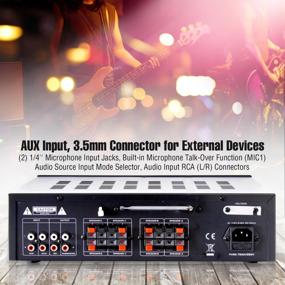 This 500-watt amp brings music to the living room with crystal clear clarity. With plenty of inputs, you won’t find this amplifier lacking. It features a built-in FM radio with digital LCD display. It’s equipped with RCA inputs on the back and two ¼” mic jacks on the front, so you can turn this amp into a karaoke machine – even add an echo effect. Easily adjust the volume, balance, treble, bass on the master output for total control of your sound. Remote is already included. Runs on 110 and 220 V AC.