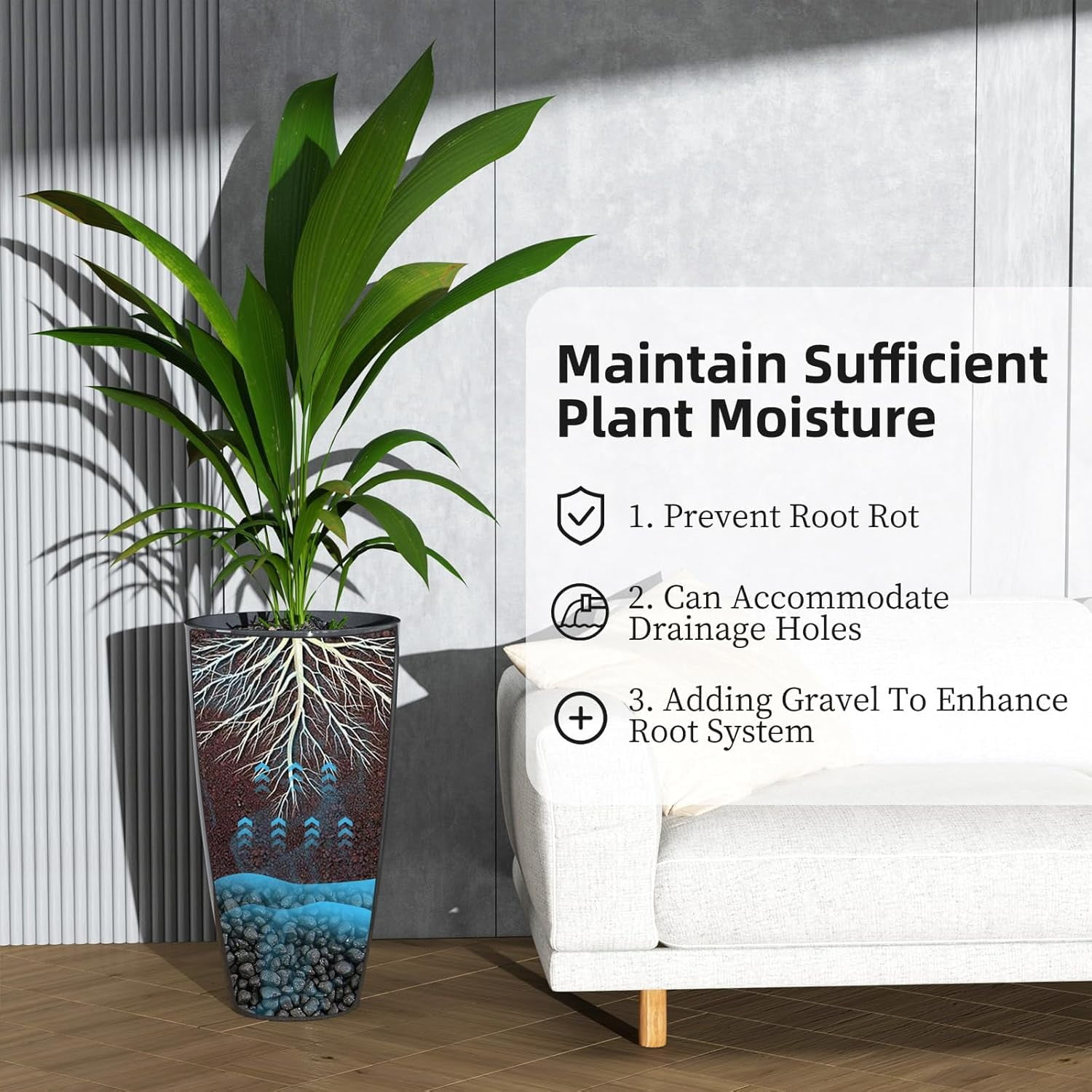 Large outdoor flower pots are made of high-quality recycled plastic and natural stone powder, which will not fade in sunlight. High quality materials make the pot less likely to deform or break, making it durable
