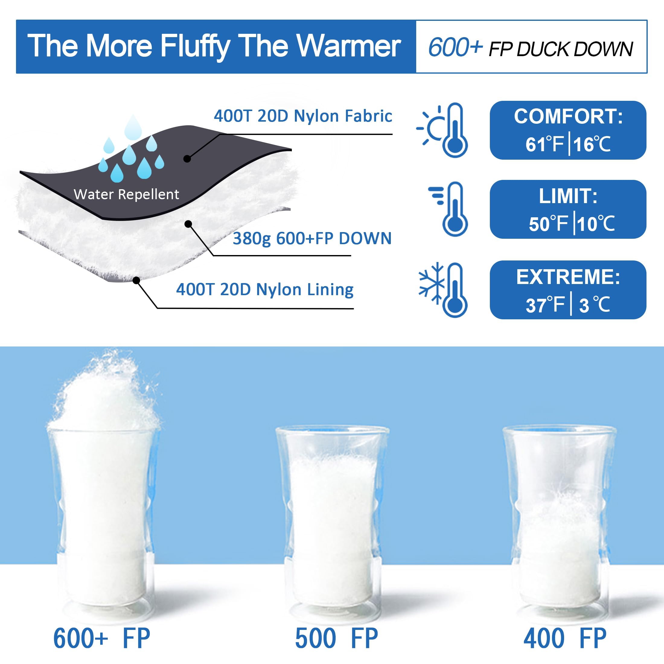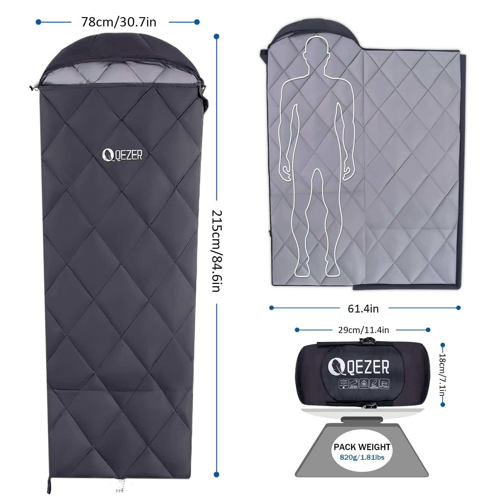 【LIGHTWEIGHT & COPMPACT】Ultralight sleeping bag weighs only 1.81lbs, package size only 11.4″ x 7.1″, it’s about half the weight and volume of a polyester sleeping bag! Very space saving! Each compact sleeping bag comes with a compression sack, suitable for camping, backpacking, hiking, expeditions, mountaineering, travel. 【KEEP WARM】Filled with 380g 600+ Fill Power selected premium duck down, the down sleeping bag keeps you stay in warm and dry. Pure natural and healthy material, fluffy and soft, no odor or impurities. Comfort temperature: 50°F-61°F(10°C ~ 16°C). Double zipper and windproof strip design prevent cold air from entering. Mummy sleeping bag head shape fits the head better and keeps warm, the lower body is rectangular, you can move foots freely. 【 LARGE SPACE】The use size of our adult sleeping bag is 30.7″x84.6″, more spacious than normal sleeping bags! The foot zipper can be opened for good ventilation. 【 DURABLE & LONG LASTING】400T 20D high-density nylon fabric, anti-moisture, anti-tear, anti-drilling, high-quality zipper is very smooth to use, the design of the diamond grid makes the down distribution more even, well-made, high-density quilting prevents the down from coming out. 【 SATISFACTION GUARANTEE 】QEZER always provides our customers with the best sleeping bag products and services with premium down. If you have any product questions, please contact us, we will respond sincerely and do our best to keep you satisfied. Package Contain: 1 x sleeping bag 1 x compressible bag Fit for People: Up to height 185cm and weight 110kg Weight: 1.81 lbs( about 820g) Package Size: 11.4″ x 7.1″ inch Comfort temperature: 50°F-61°F(10°C ~ 16°C ) Extreme temperature: 37°F (3°C)(this temperature is not warm) Down Filled: 380g 600FP Duck Down Outer and Lining Material : 400T40D Nylon
