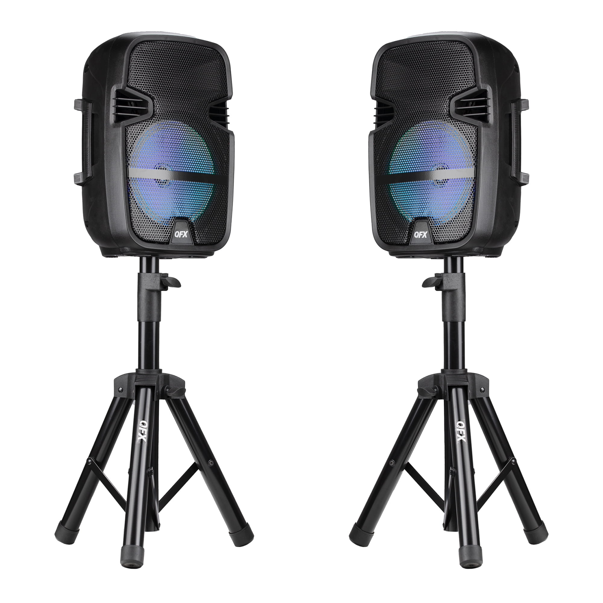 QFX PBX-808TWS Dual 8-Inch Portable Bluetooth PA Speaker System with Stands, Wired Mics, Remotes, USB/FM/TWS/LED