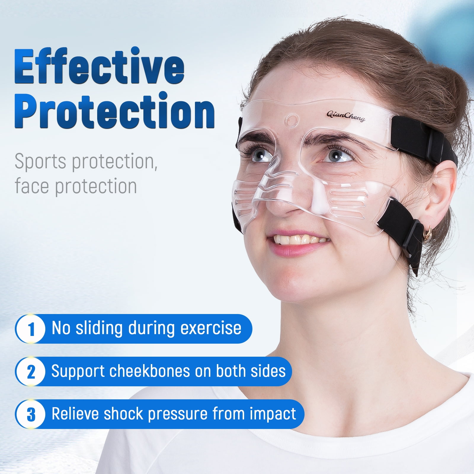We have partnered with a large group of professional top athletes and sports therapists to provide them with a range of sports protective equipment that allows athletes to recover faster, prevent injuries and improve athletic performance during training and competition. All products are rigorously developed and tested. Qiancheng L5-S Clear Nose Guard:Designed for children and teenagers. Crack-proof and shatter-proof nose protector with adjustable safety belt and soft silicone pads to make the nose protector fit your face better, with non-slip cushioning. Breathable even when you sweat. You will not feel the weight of the nose guard when you wear it on your face. Put it in the carrying bag, use it anytime and anywhere, and wash it with water after use. Qiancheng nose mask helps to protect your face from Nasal, brow bone, orbital, cheekbones, zygomatic, maxillary injuries. Used as a post-operative nose protector or a broken nose or fracture protector. Perfect for basketball, football, volleyball, soccer ball, baseball, water polo, cheerleading and any other sports that can cause facial injuries. A variety of sizes to meet different ages/face shapes and fit your face better.