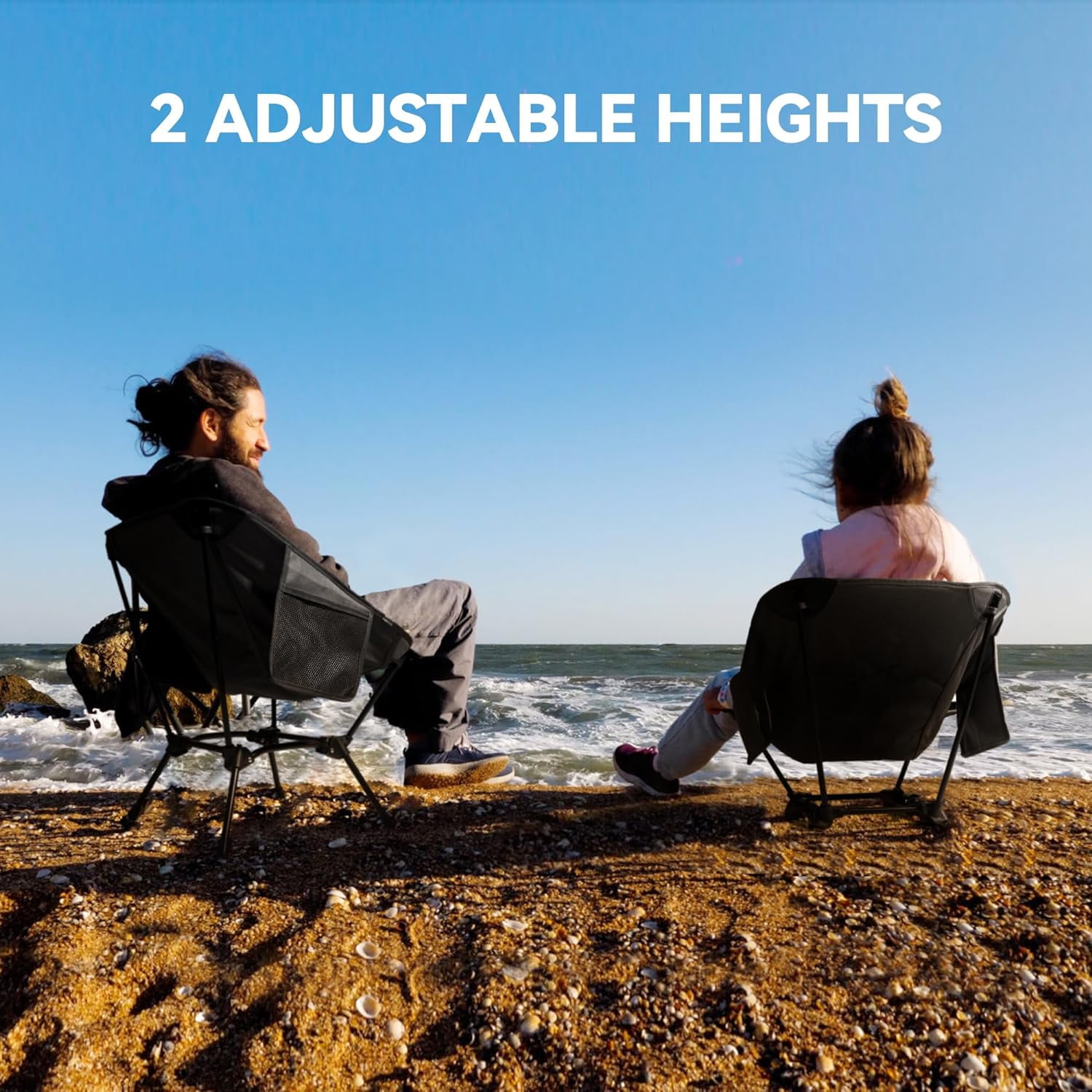 MATERIAL Crafted from highly stretchable 600D Oxford fabric with reinforced double seams, this chair provides stable support for endless leisure time. Enjoy unparalleled comfort no matter where you are. SIZE Unfolded, the chair measures 16.5″ (L) x 16.5″ (W) x 25.6″ (H), with a moon-shaped deep seat for ultimate relaxation. When folded, it compacts to 14.5″ (L) x 5.5″ (W) x 5.5″ (H), making it easy to carry on your back or while cycling. Despite its compact size, it supports up to 330 lbs. PORTABLE The adjustable bracket allows you to choose between two heights. Equipped with a storage bag, transportation is a breeze, letting you take comfort wherever adventure calls. EASY TO SET UP Our tip-proof foldable chair is an outdoor solution that you can set up in just 5 seconds. Our high-back camping chair poles basically pop into place on their own. Then, the fabric seat cover fits just over the 4 poles. Two velcro straps help to fold up quickly so you can tie the poles together on one side first and then the other side.