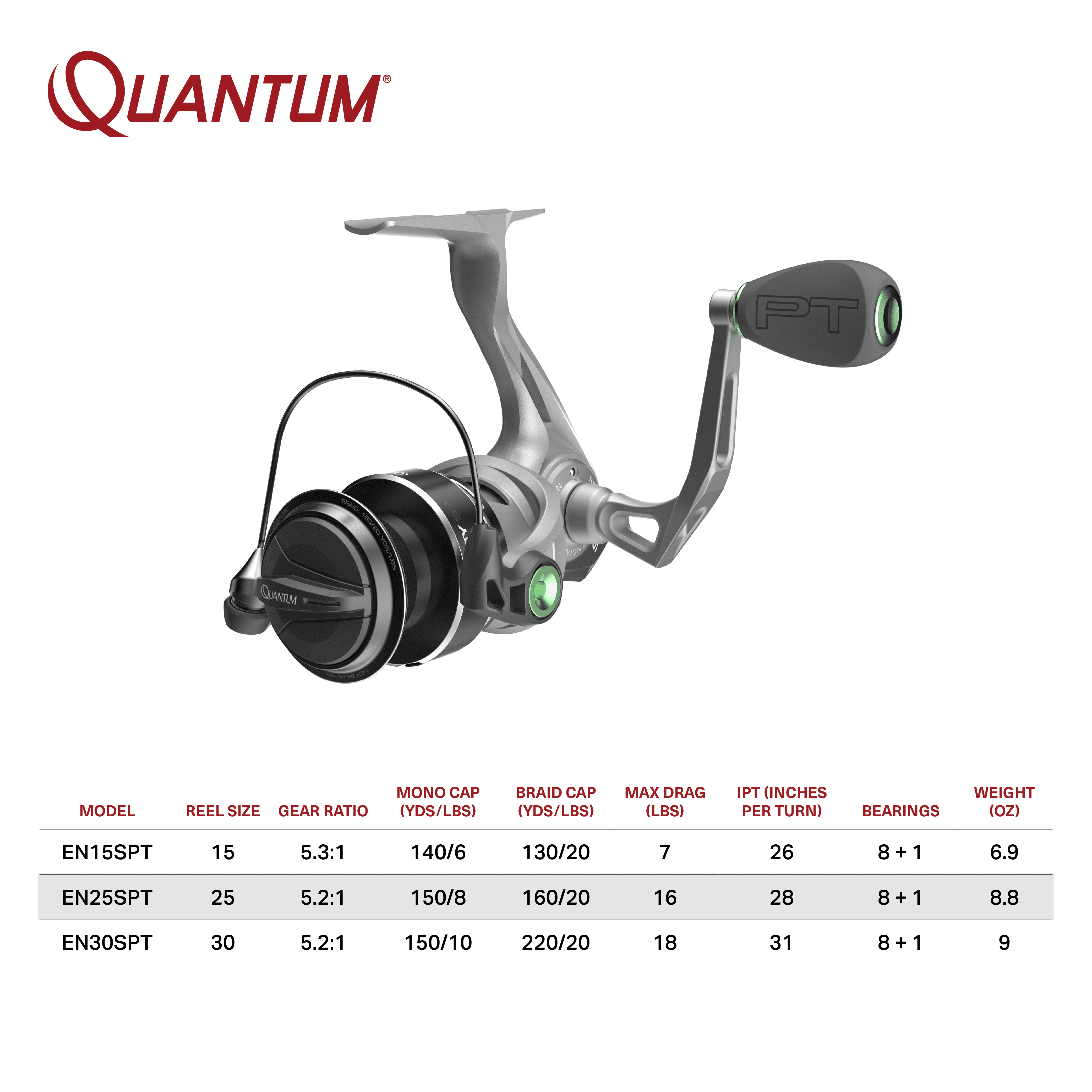 ULTRA-DURABLE PERFORMANCE: Boasting a boatload of performance tuned features, this Energy S3 size 25 spinning reel is constructed with an R·E·D aluminum unibody design and a forged and machined double-anodized spool that’s always in its element. The EVA handle knobs were designed with your comfort in mind so you can continue reeling in those fish for hours TROUBLE-FREE USE: The Quantum Energy reel is coated with saltguard protection and features 8 + 1 bearings (8BB, 1RB) and a continuous anti-reverse clutch that provides immediate hooksets delivering super smoothness and sleek function for any application. It is fitted with a changeable right- or left-hand retrieve and utilizes maxcast 2. so the line comes off the lip in tight coils reducing friction from the rod guides for longer, more effortless casts SUPERIOR DESIGN: This spinning reel features a 5.2:1 gear ratio and a 28 IPT for a fast and consistent retrieve. The ceramic carbon drag system can hold up to 16-pounds of max drag and the NiTi indestructible titanium bail was designed with top performance in mind giving you the ultimate design and strength to reel in those big fish VERSATILE USE: With a mono capacity of 15/8 yds/lbs and the ability to hold up to 16-yards of 2-pound braided line, this reel is for light to medium species such as panfish, trout, walleye and bass! You’ll be fishing at your best with the Quantum Energy in your hands ROCK-SOLID PROTECTION: All Quantum gear is protected for a rock-solid 5-years from original date of purchase against defects in workmanship and/or materials. Engineered for real-world performance, your Quantum fishing rods, reels, and combos are guaranteed to work as hard as you do, year after year