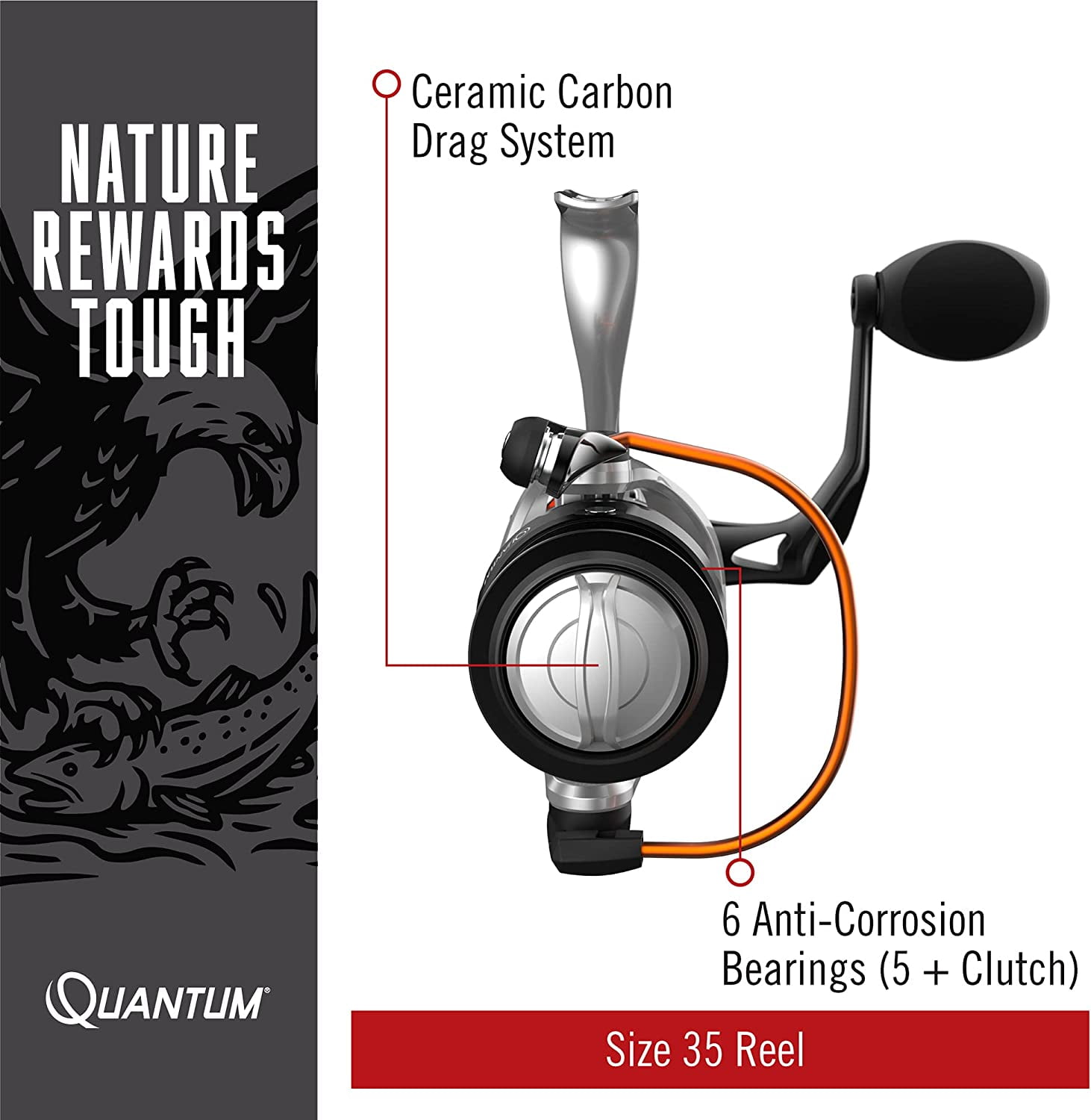 ULTRA-DURABLE PERFORMANCE: Long after its competitors fizzle out the Reliance size 35 spinning reel performance is designed with a durable aluminum body, forged aluminum spool and sturdy one-piece K-alloy handle, to keep on fighting TROUBLE-FREE SALTWATER USE: Quantum Reliance reel features saltguard protection and 6 anti-corrosion bearings (5 + 1) to take on any fish in any element, equally at home in freshwater or saltwater. The roller bearings provide instant anti-reverse for immediate hooksets and super smooth performance for any application WATER-TIGHT SEAL: Ready to go in all elements including rain, sleet or high winds, thanks to the water resistant fully sealing and maintenance free design that protects the reel’s bearings, gears and other critical components from water corrosion, sand and wear SUPERIOR DESIGN: This spinning reel is constructed with an SCR aluminum body and CFLF rotor, 6.2:1 gear ratio and 36 IPT for a smooth and consistent retrieve. The reel features the convenience of a changeable right- or left-hand retrieve. The ceramic carbon drag system can hold up to 22-pounds of max drag giving you the ultimate in design and strength to reel in your prize catch ROCK-SOLID PROTECTION: All Quantum gear is protected for a rock-solid 5-years from original date of purchase against defects in workmanship and/or materials. Engineered for real-world performance, your Quantum fishing rods, reels, and combos are guaranteed to work as hard as you do, year after year