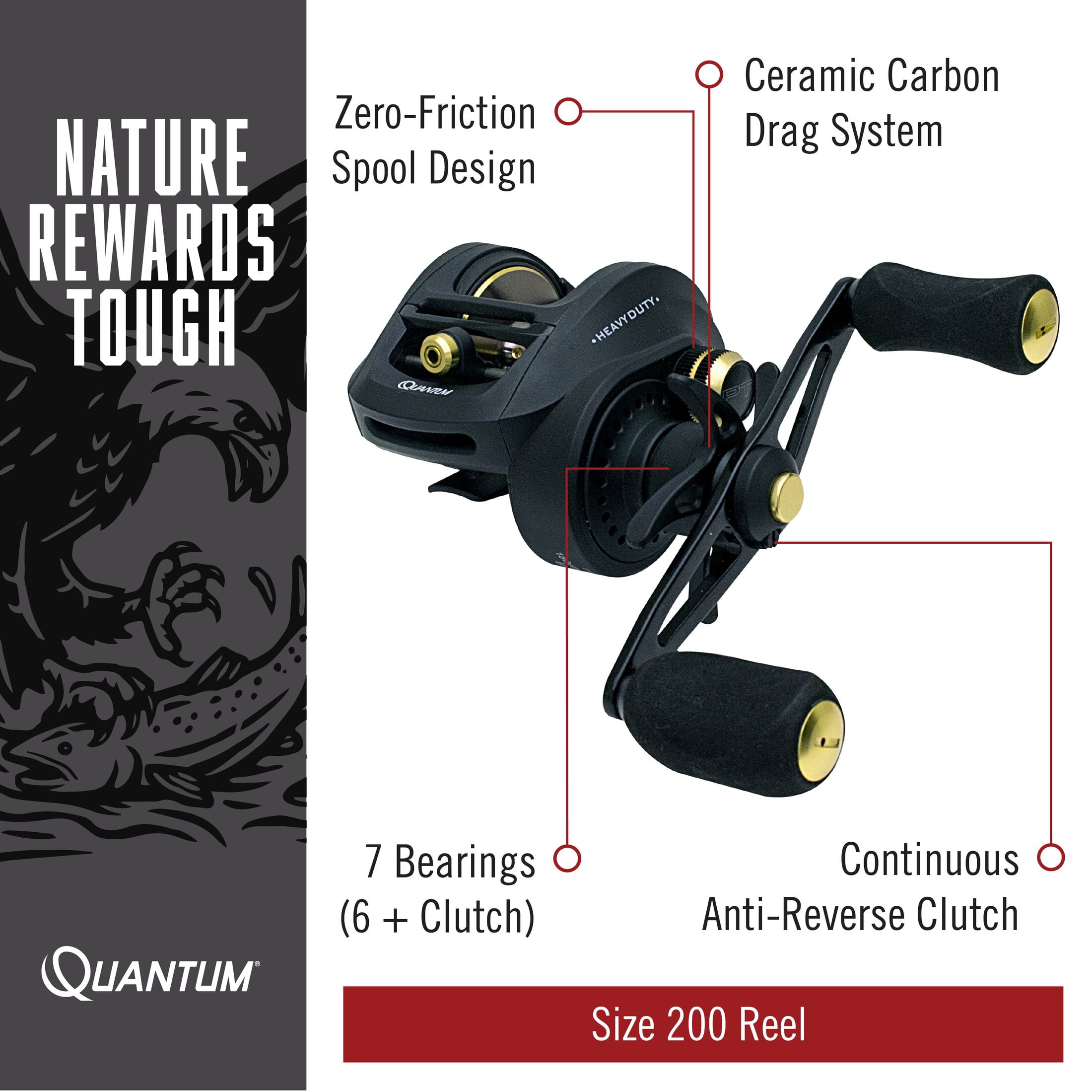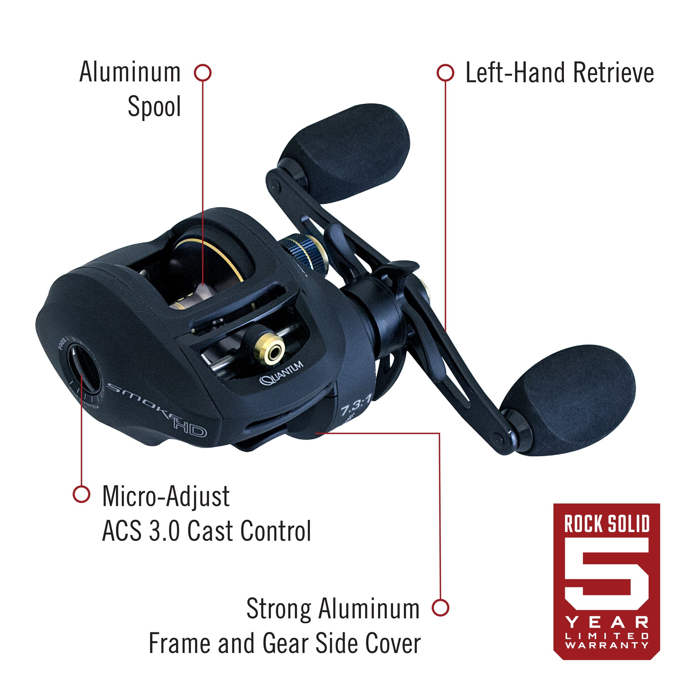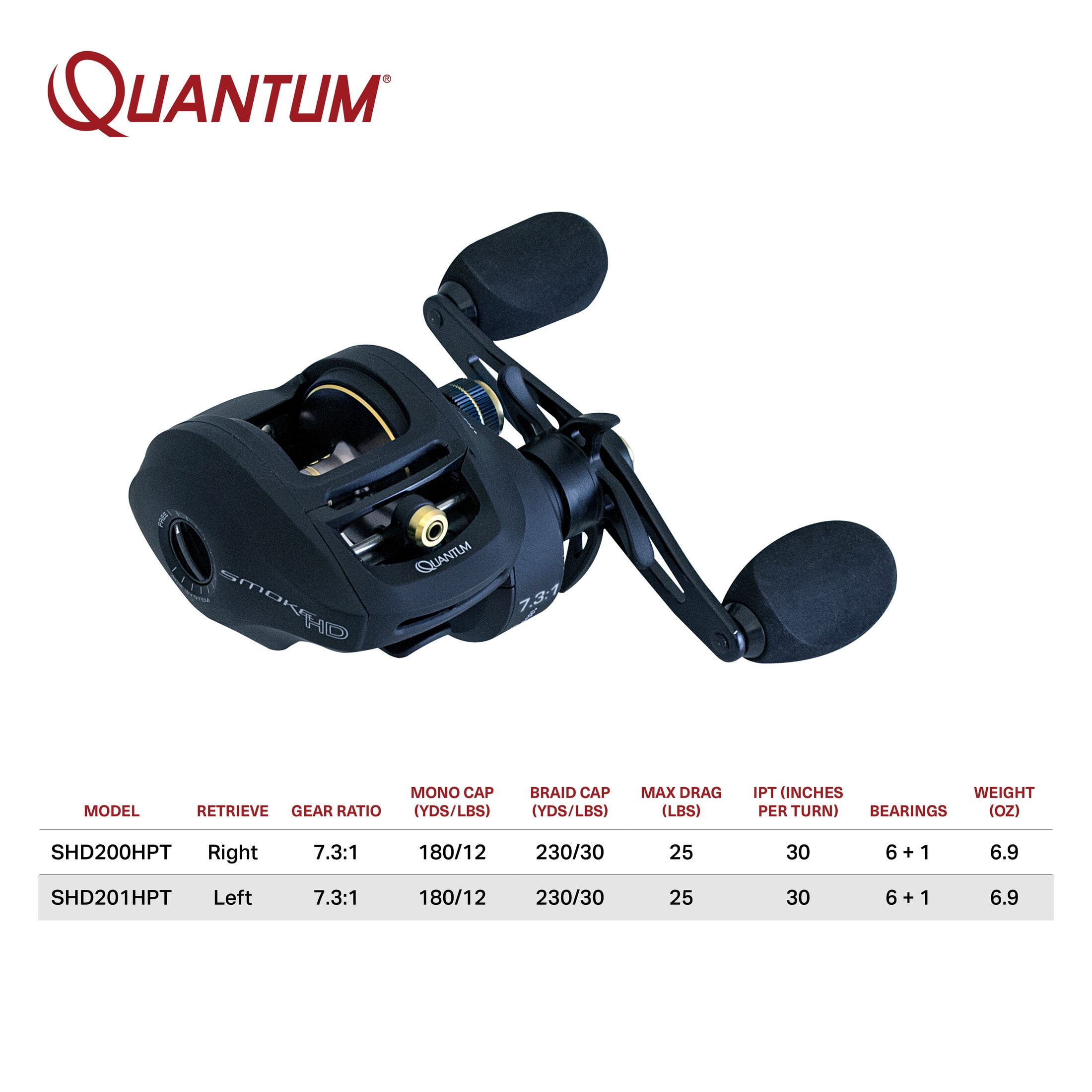 HEAVY DUTY PERFORMANCE: Quantum’s Smoke HD size 200 baitcast reel is designed with a strong aluminum frame and gear side cover, aluminum spool, zero friction spool design, and large EVA handle knobs for heavy duty, long-lasting performance EXPERT CONTROL: Smoke HD features a Continuous Anti-Reverse clutch, a left-hand retrieve, 7 bearings (6 + clutch), and PT speed bearings for heightened control in any fishing conditions DEPENDABLE OPERATION: This baitcast reel features a 7.3:1 gear ratio with a 30 IPT (inches per turn). The CSC drag system has a max drag of 25-pounds, providing the strength needed to stop your catch in its tracks DURABLE DESIGN: This baitcast reel has a mono line capacity of 180/12 (yds/lbs) and can hold up to 230-yards of 30-pound braided line so you’re ready to fish under any conditions. Smoke HD is designed to target medium to heavy species such as walleye, bass, catfish, striper, and saltwater species ROCK-SOLID PROTECTION: All Quantum gear is protected for a rock-solid 5-years from original date of purchase against defects in workmanship and/or materials. Engineered for real-world performance, your Quantum fishing rods, reels, and combos are guaranteed to work as hard as you do, year after year