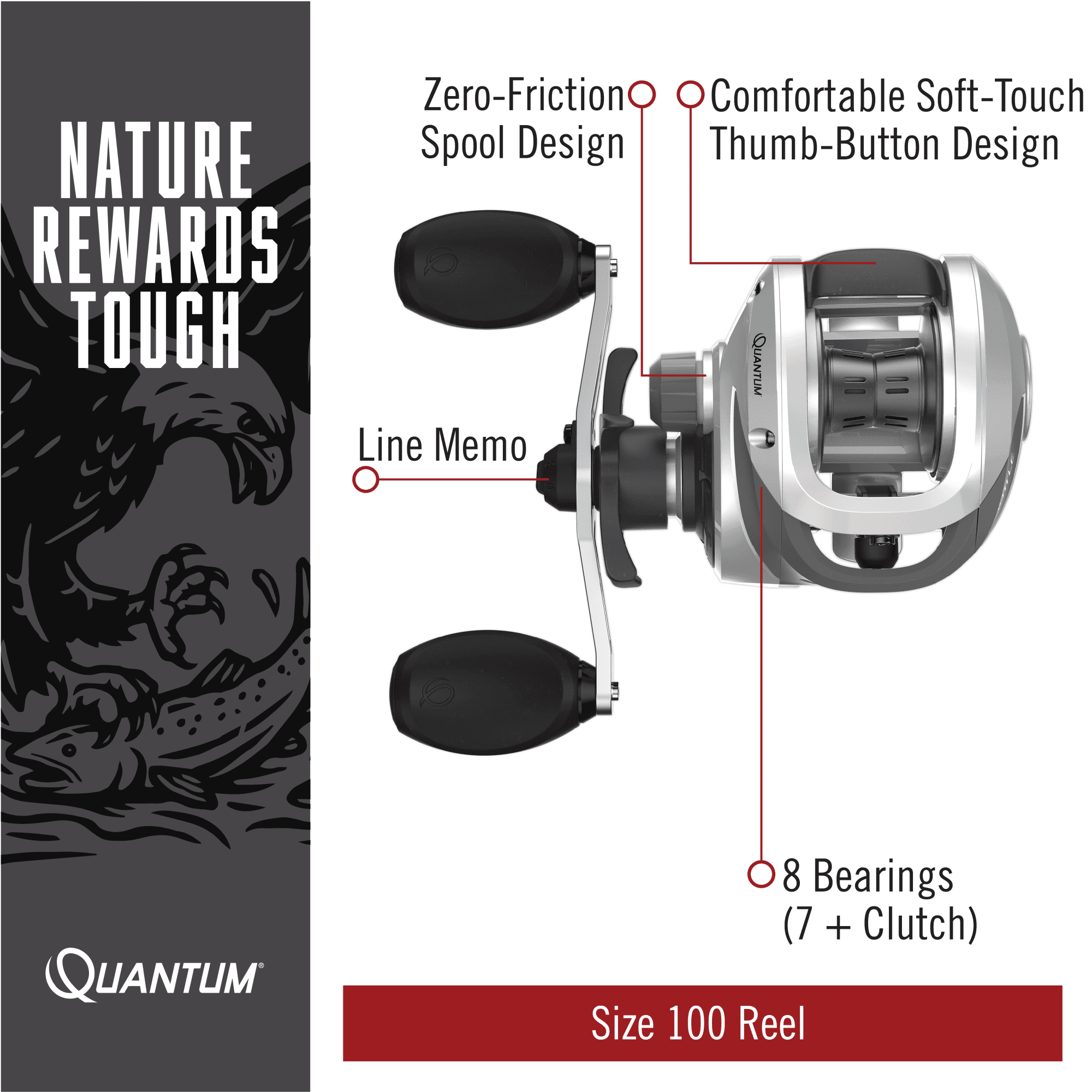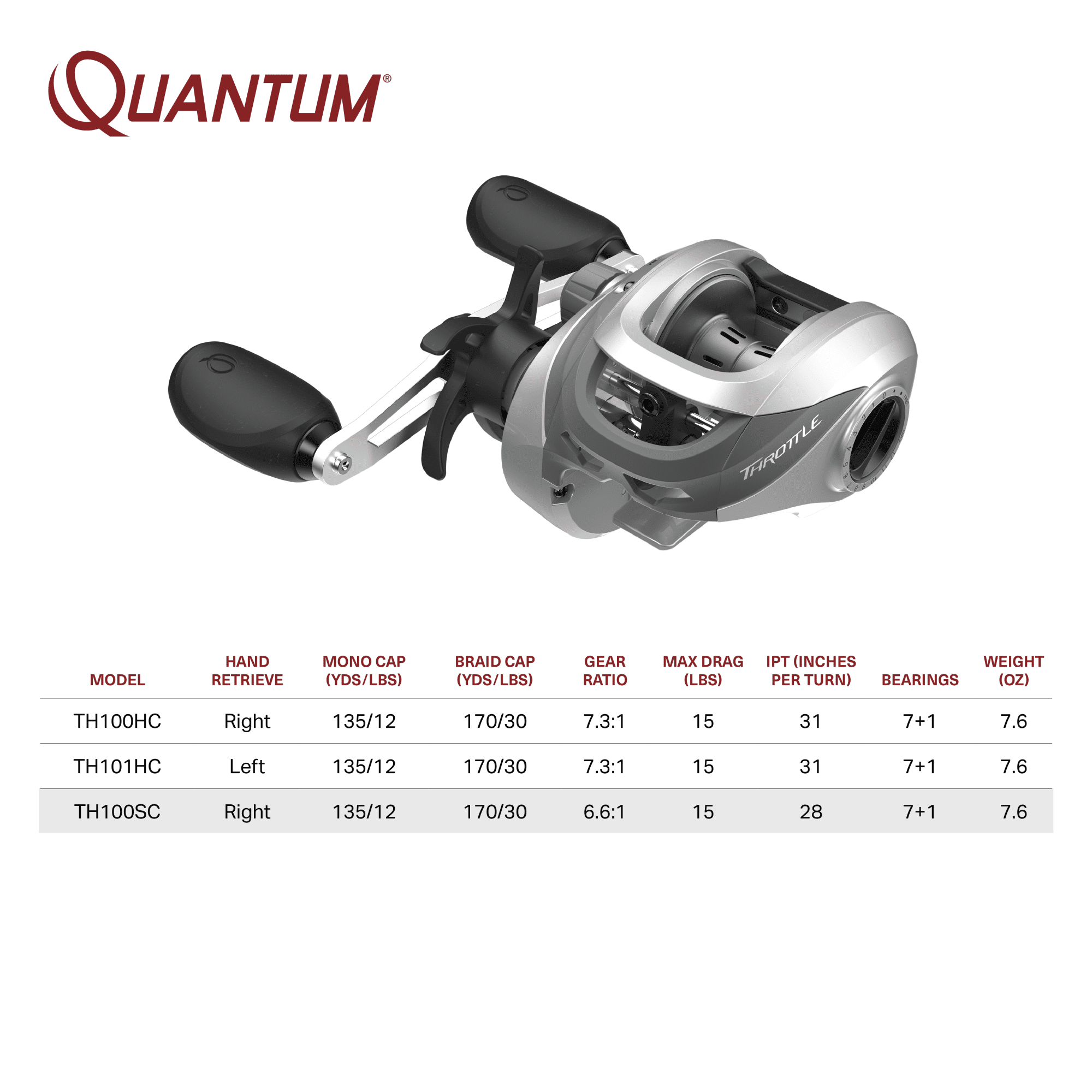 ULTRA-DURABLE DESIGN: Throttle baitcast reel is tough and up for the challenge. The lightweight, yet sturdy, graphite frame and side covers protect internal reel components and keep out dirt SMOOTH CASTS AND RETRIEVES: Quantum’s Throttle baitcast reel features a Zero Friction pinion which eliminates a touch point within the reel for friction-free performance. It also features a Continuous Anti-Reverse clutch, a right-hand retrieve, and DynaMag cast control for smooth and reliable fishing SUPERIOR DESIGN: This baitcast reel features an ultra-durable design with a 6.6:1 gear ratio and 28 inches per turn for fishing a variety of techniques. The 15-pound max drag give you the ultimate strength to reel in your huge catch VERSATILE APPLICATION: With a mono capacity of 135/12 and the ability to hold up to 17 yards of 3-pound braided line, this reel is perfect for medium to heavy species, like walleye, bass, catfish, and striper. Take on any rugged condition with the Throttle baitcast reel ROCK-SOLID PROTECTION: All Quantum gear is protected for a rock-solid 5-years from original date of purchase against defects in workmanship and/or materials. Engineered for real-world performance, your Quantum fishing rods, reels, and combos are guaranteed to work as hard as you do, year after year