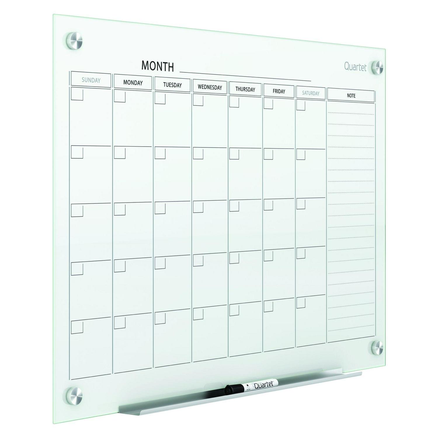 Quartet Glass Dry Erase Calendar blends versatile functionality with a modern upscale look. Elevate your office or home with this premium frosted glass dry erase calendar. This one-month calendar is ideal for personal daily use, and will help you organize your schedule with style. As this board is made with non-absorbent glass, you can write, erase and rewrite on a clean surface every time, without fear of stains or ghosting. This board is designed for long-term performance. The strong tempered glass surface resists scratches and dents, and is ideal for heavy use. Plus, the magnetic, steel-backed glass makes it easy to hang papers and documents instantly. Installation is simple with the included pass-through mounting hardware. As the screws insert through the front, you can hang the board accurately and evenly. Mount it vertically or horizontally to fit your space. Board comes with limited 15 year warranty, a removable accessory tray, one marker and two high power glass board magnets.