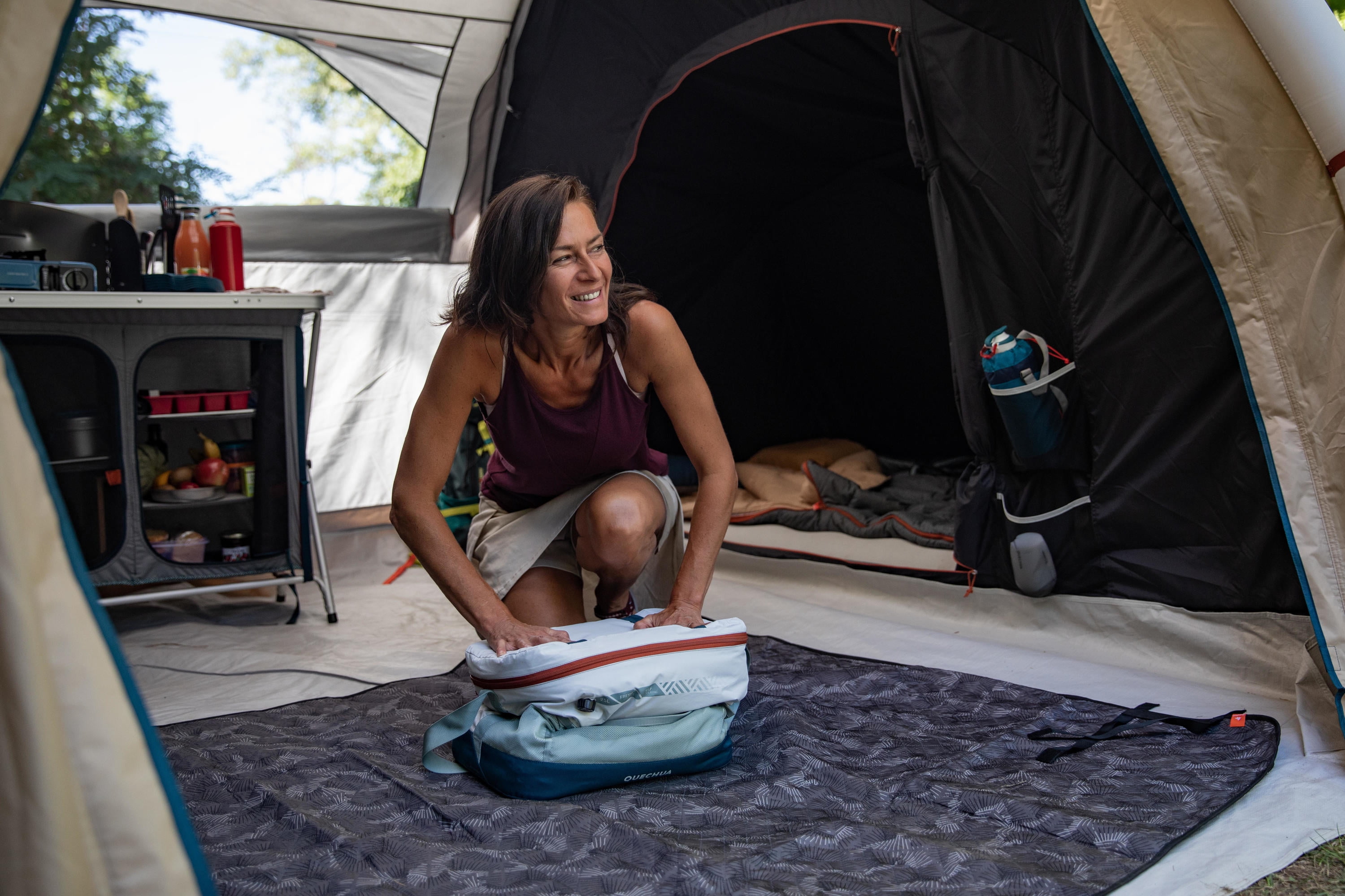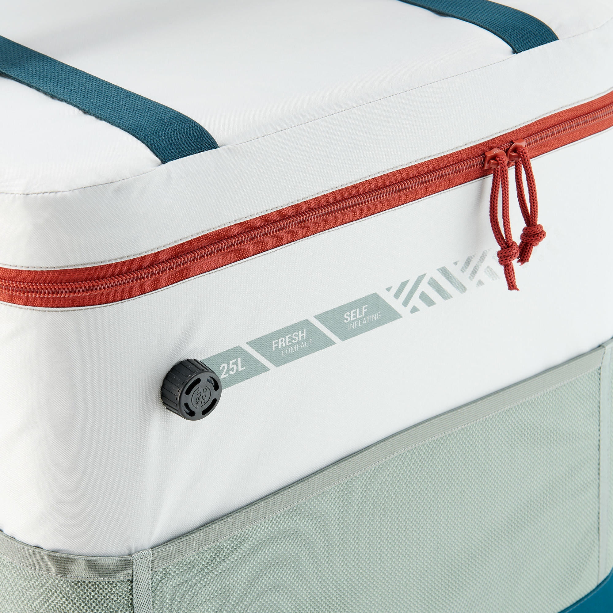 Decathlon Quechua Camping Soft Cooler, 25 L, White Insulated Keeps food fresh for 14 hours without needing ice blocks Standard: EN 12546-2 Product Compartment Large zipped opening, 3 storage pockets, Outer netting, and 1 separator. Two outer storage pockets of elastic netting. Inner band to hold bottles and 2 net pockets for ice blocks. Thanks to its separator, place it horizontally, you cans keep the food on the lower level cool for longer. You cans also place it vertically to organize your ice box. Compact design No more unnecessary clutter when storing. Easy to transport Lightweight at 2.8 lbs. Adjustable shoulder strap and foam patch to relieve shoulders. 2 handles. Straps on the top of the ice box so that you cans carry your picnic blanket. Once unfolded, the ice box measures 15.7″ in height, 11.8″ in depth, and 15.7″ in width. When folded, the ice box is even more compact and measures 8.2″ in height, 11.8″ in depth, and 15.7″ in width. Product Advice Warning! This ice box is not watertight. It’s normal for moisture or water inside the cooler (through condensation, for example) to seep through seams. This avoids unwanted water or moisture building up inside of the ice box. To improve the thermal performance of the cooler, we recommend finishing inflating it with your mouth using the valve, using ice blocks, leaving your ice box in the shade, only opening it when necessary, and quickly closing it.