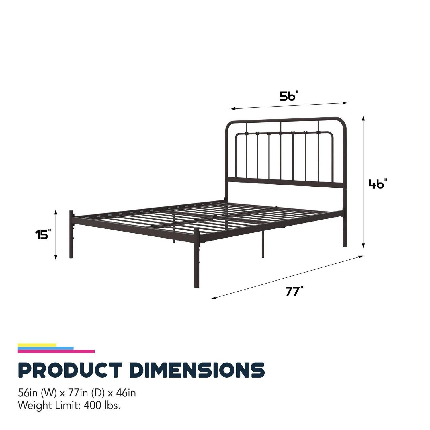 – Full size bed dimensions: 77″L x 56″W x 46″H. Net weight: 49 lbs. Weight limit: 400 lbs.