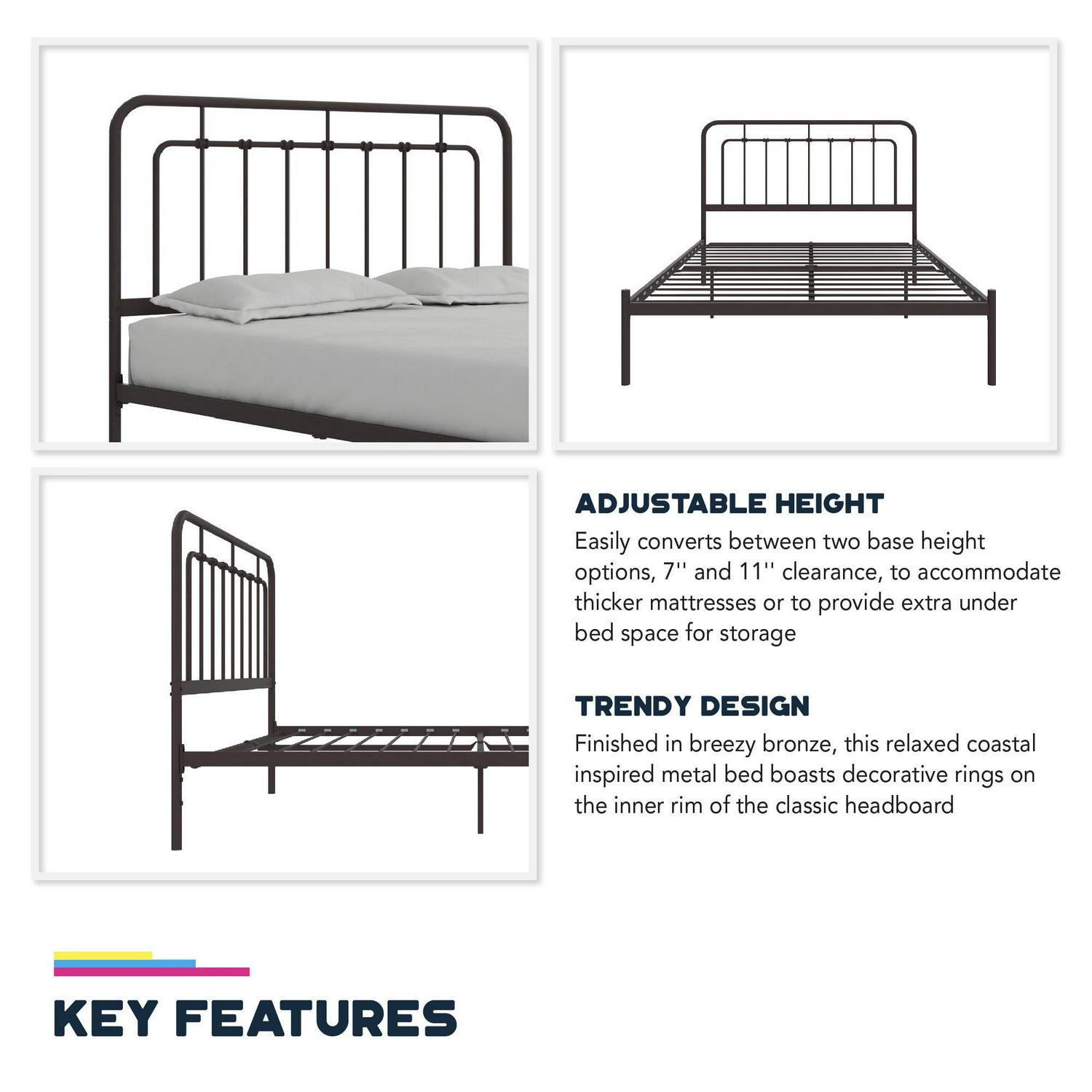 – Available in a classic bronze finish, no additional box spring or foundation is required to let you save more money in your wallet Plus, its space saving silhouette works well in a small space guestroom