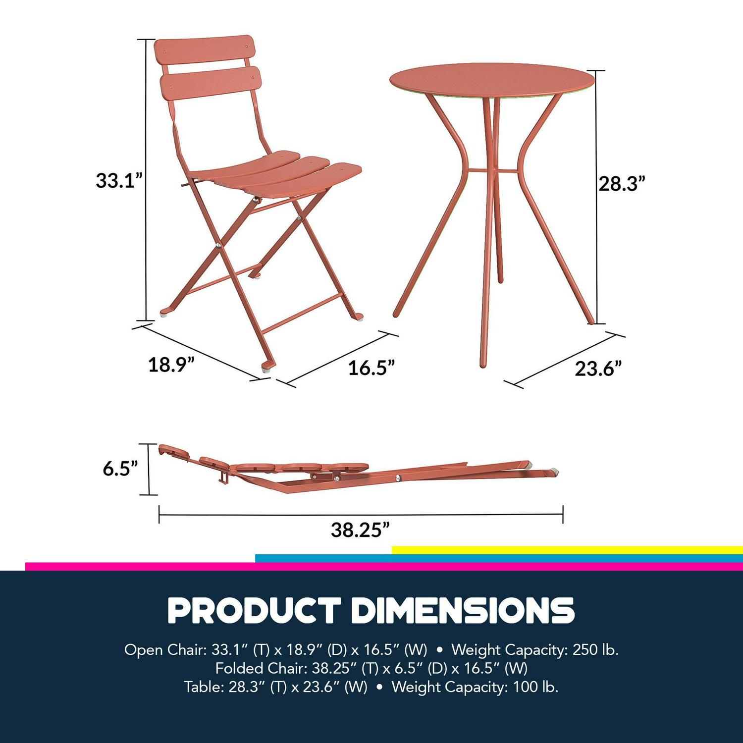 – Chair open dimensions: 16.5″ W x 18.9″ D x 33.1″ H. Chair folded dimensions: 16.5″ W x 6.5″ D x 38.3″ H. Table dimensions: 23.6″ diameter x 28.4 ” H. Weight Capacity of 250 lbs. per chair, 100 lbs. for table