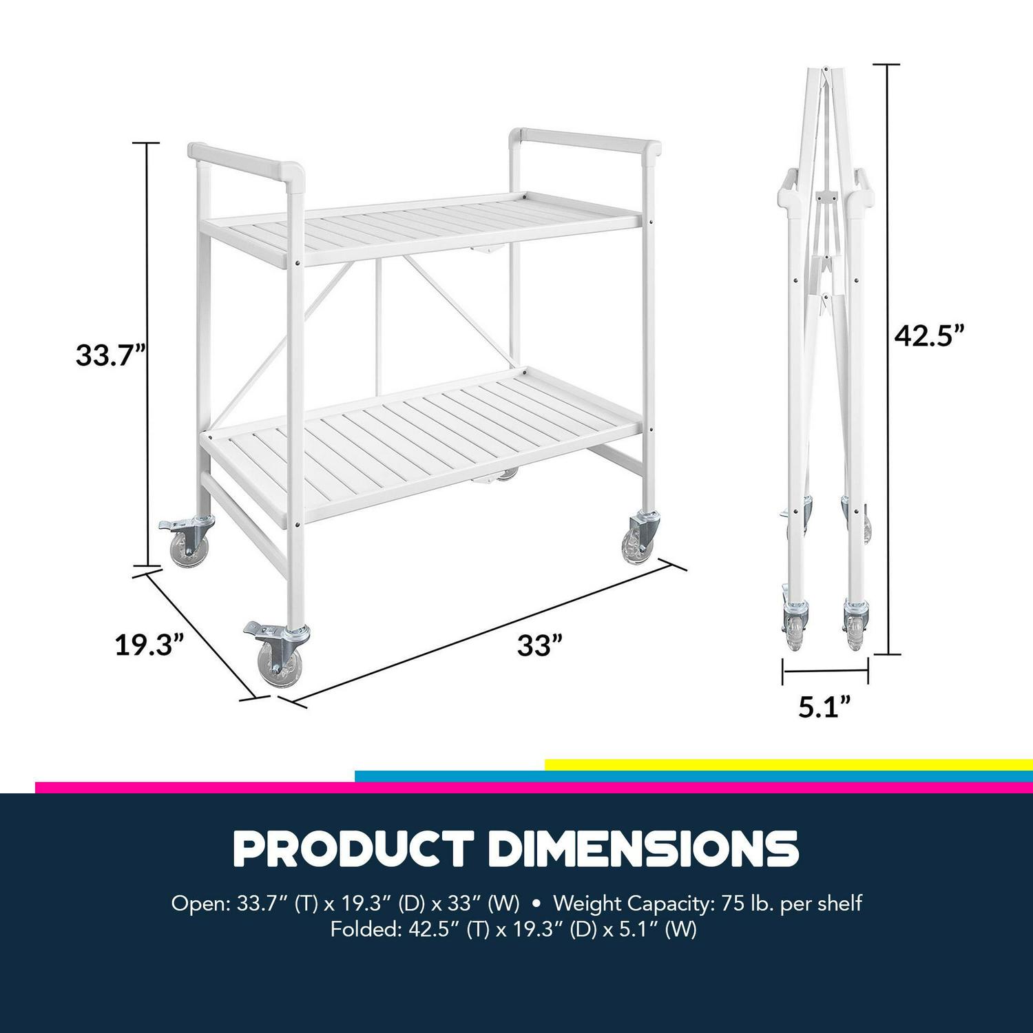 – Open dimensions: 33.0″ W x 19.3″ D x 33.7″ H. Folded dimensions: 19.3″ W x 5.1″ D x 42.5″ H. Weight capacity of 75 lbs per shelf