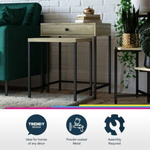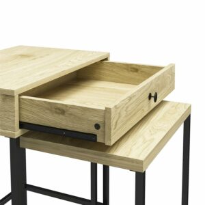 It’s time to embrace your space, big or small, with the Queer Eye Tamlin Nesting Side Tables. Toss your basic end tables out and double your real estate with the 2-table set. The Tamlin Nesting tables adjust from 1 simple table to 2 in just seconds – that’s double the drink and snack space! Don’t worry about clutter, we’ve got your back. The drawer can quickly hide your remotes and coasters to always be ready for unexpected guests. Made from durable engineered wood in a natural pine grain finish and black powder coated metal, the Tamlin collection features fashion forward statement pieces at an affordable price. Say yes to the Tamlin collection by Queer Eye. (each sold separately)
