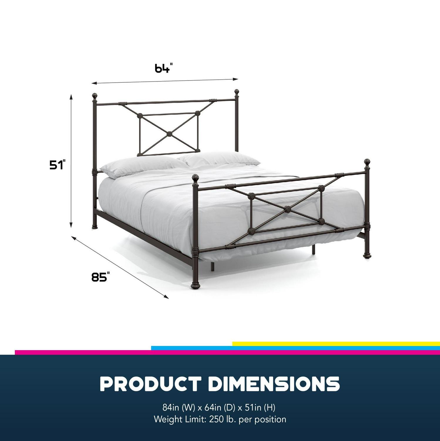 – Accommodates a standard queen size mattress (sold separately)