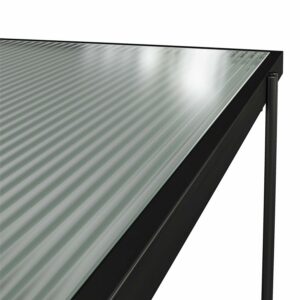 – Made of laminated particleboard, the black oak woodgrain finish pairs with the fluted glass top shelf and sturdy metal frame for a gorgeous statement piece