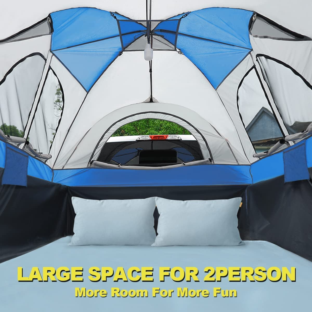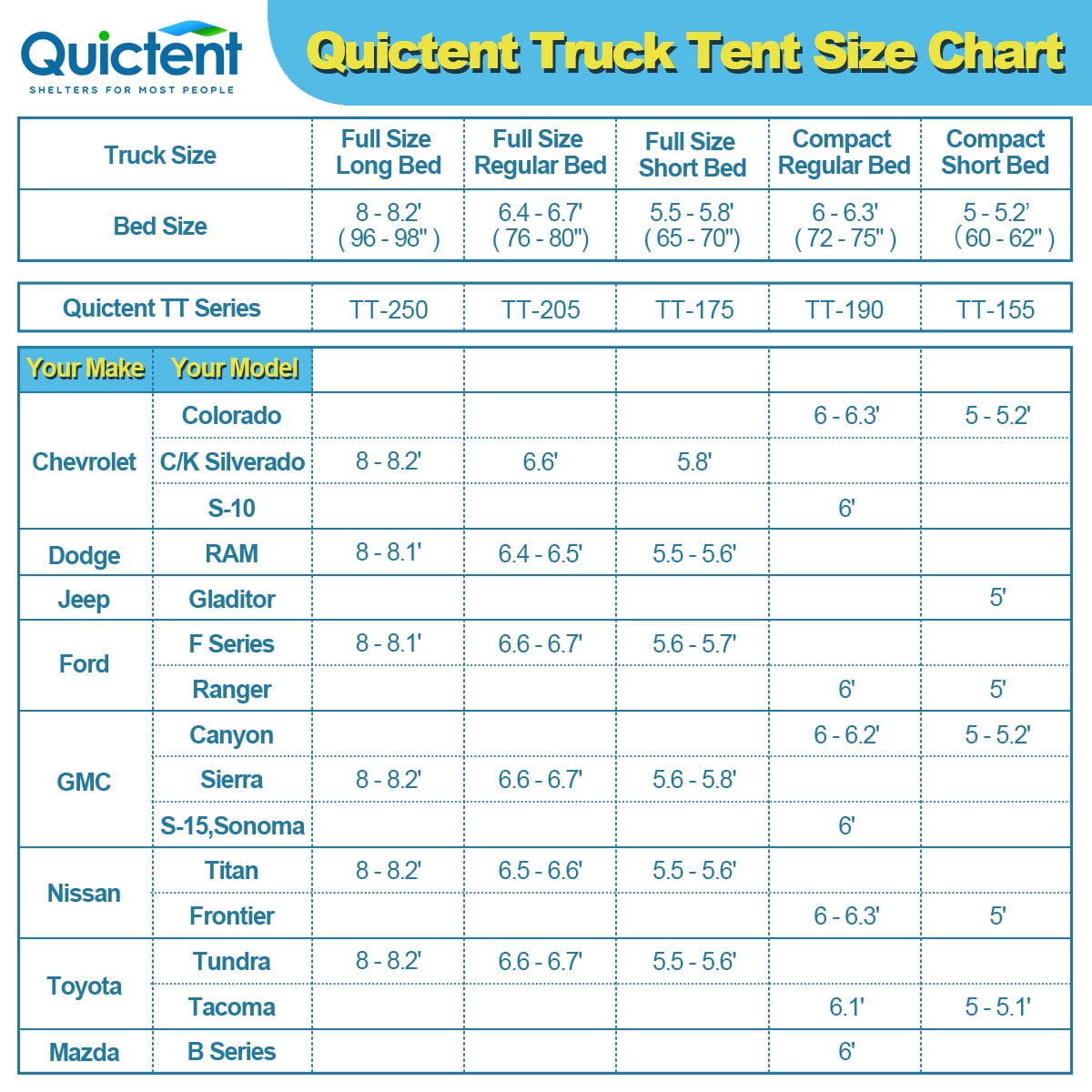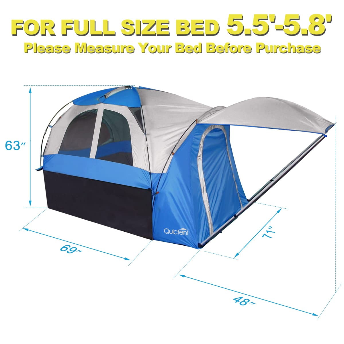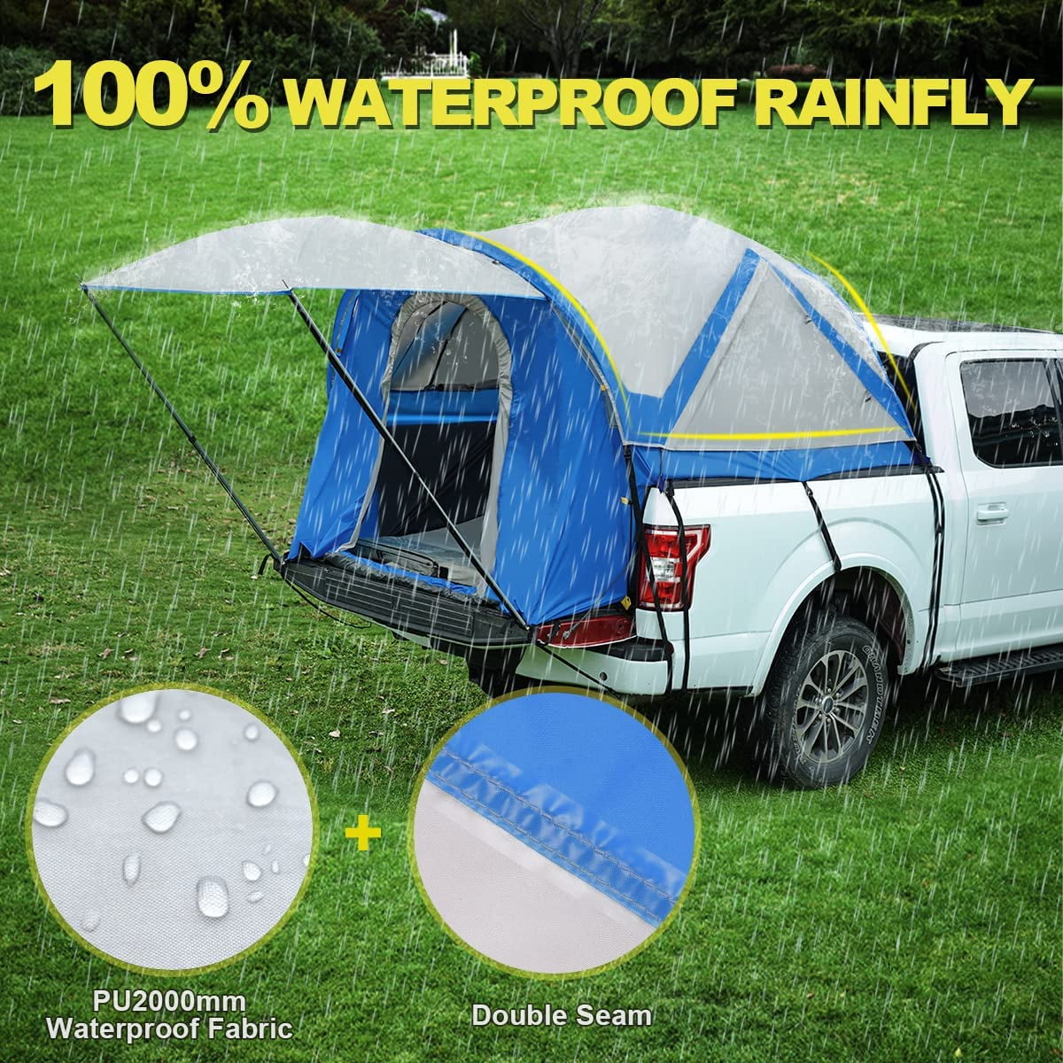 The Rainfly will allow you to camp in extreme weather and quickly build or remove. The awning can be stored on the front door when not in use. The waterproof floor keeps you from getting wet and dirty and allows you to sleep comfortably. Quickly access your truck’s interior for storage and a connection to power outlets. Use to place lights, small fans, or other gear to create a more comfortable interior. There is 1 storage bag on both sides for convenient storage of sundries. The more adjustable Pole Pockets with double holes make your installation easier and more suitable for your bed. The color of each pole and pocket corresponds to each other, allowing you to locate the pole quickly. This bag allows you to pack all the parts in for easy storage and portability.Quictent 2-Person Truck Tent: Fabric Material: 190T Polyester Frame Material: Fiberglass and Steel Ground Material: 150D Oxford Waterproof index: 2000MM-4000MM Window cover: 3000MM Waterproof PU-Coated Polyester Capacity: 2 Person Net weight: 13lb Package Includes: 1 x Tent 1 x Rainfly 1 x Carry Bag 1 x instruction 8 x Fiberglass poles and 2 Steel poles