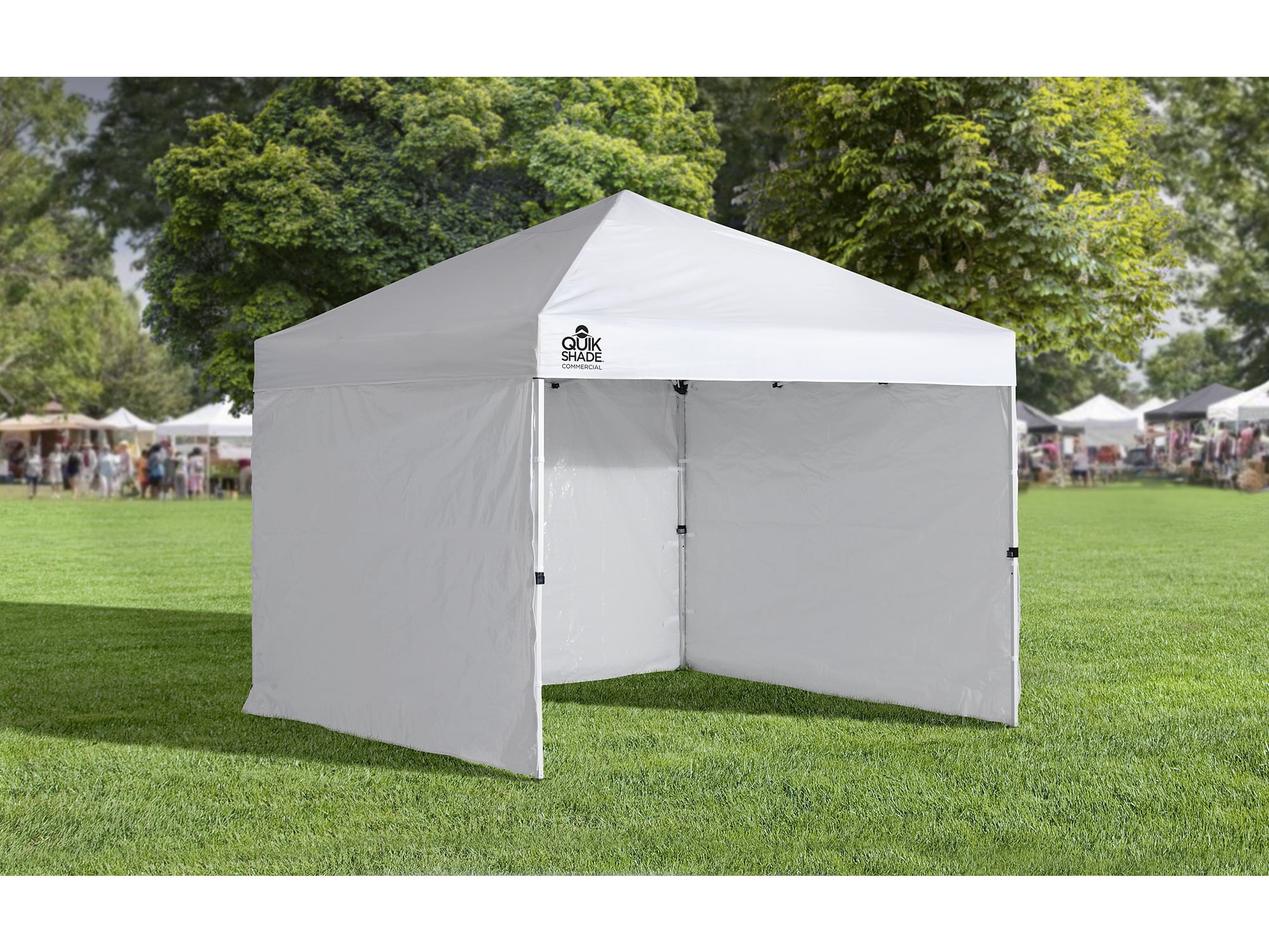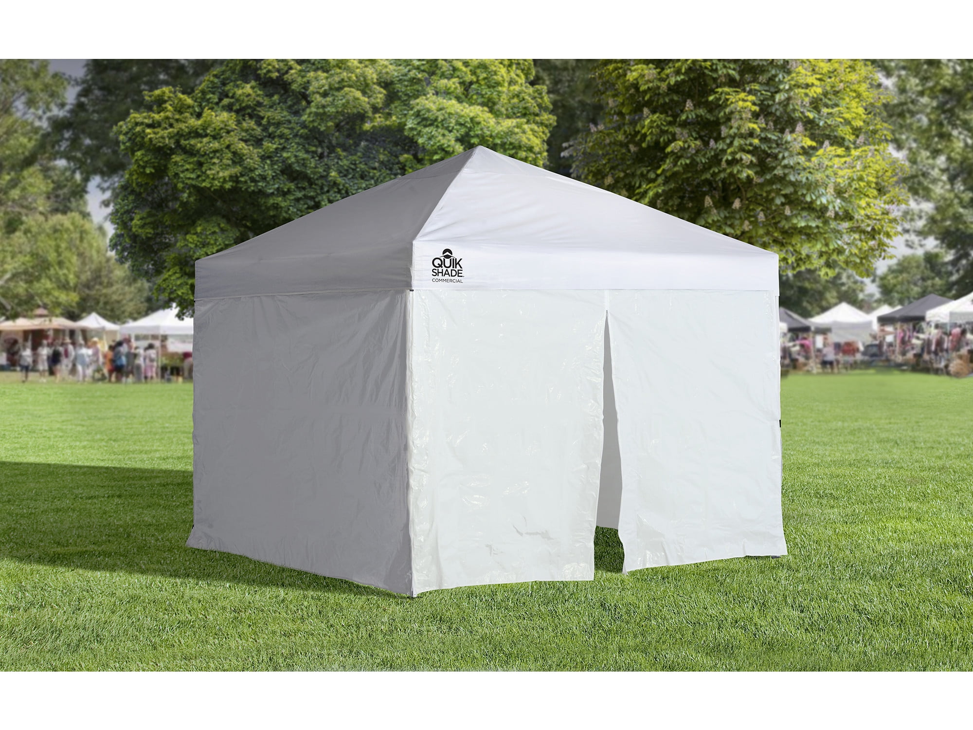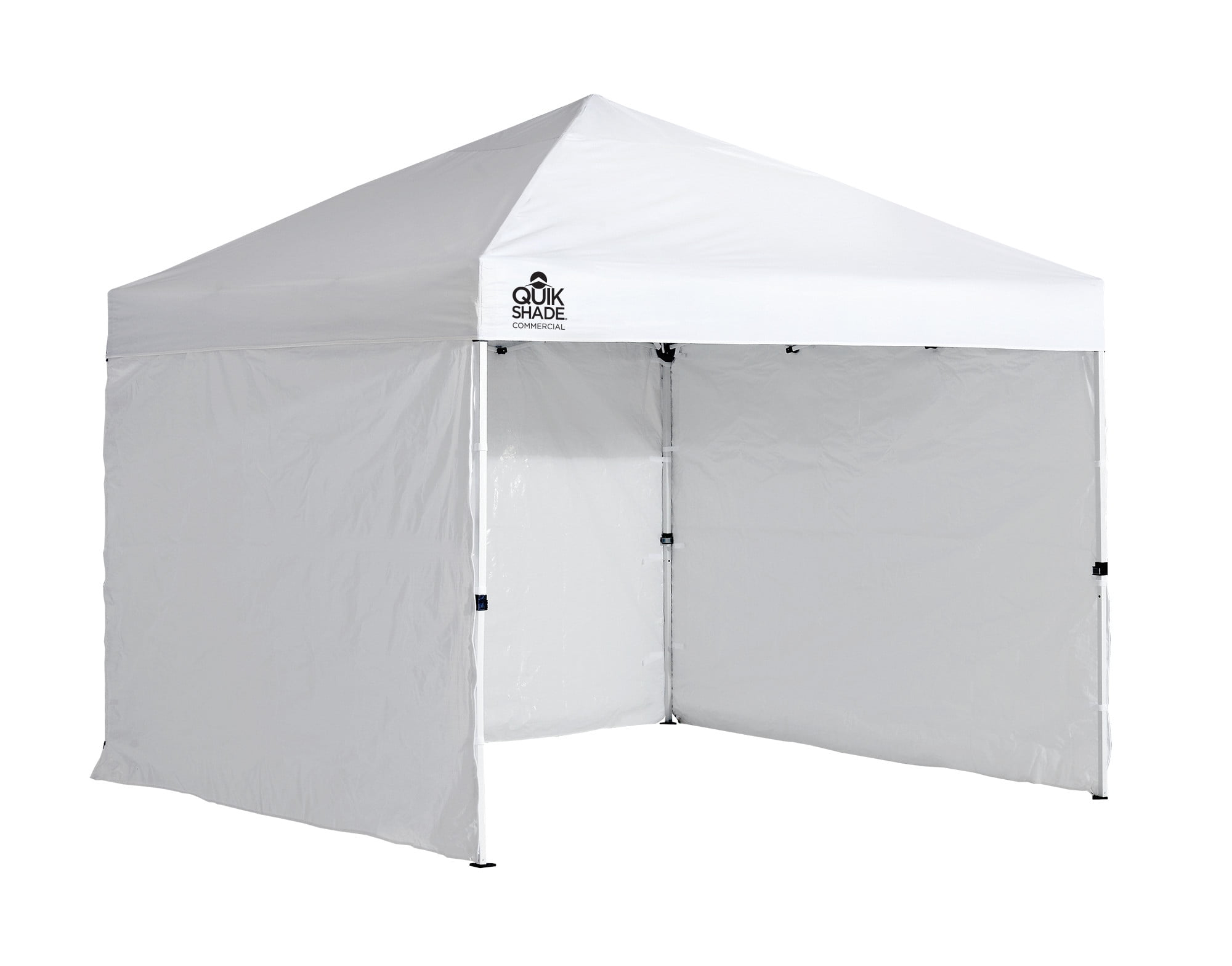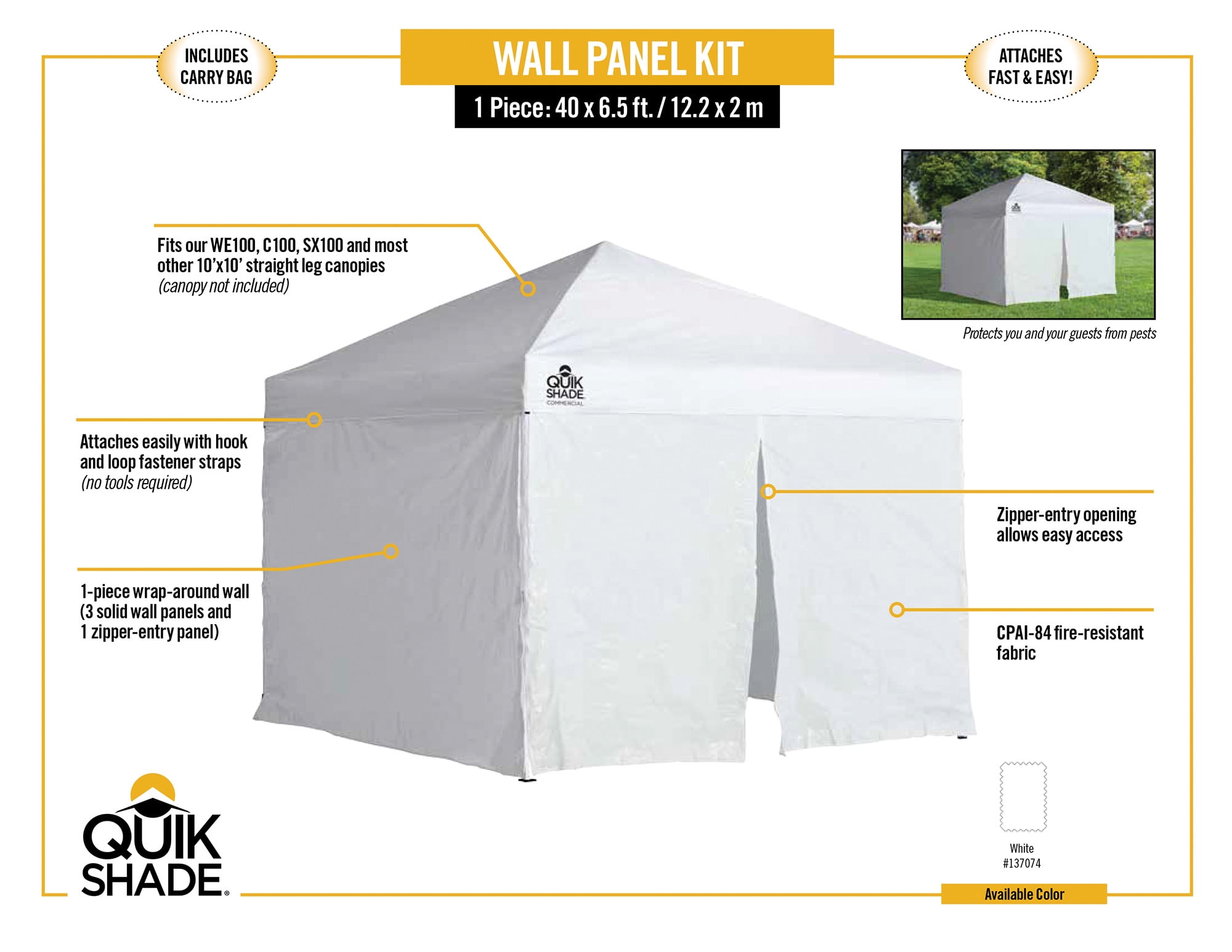 New Quik Shade 10′ x 10′ Instant Canopy Wall Panel Accessory Set in White Get wind protection or added privacy with the wrap-around wall panel from Quik Shade. This convenient added wall panel provides a private zippered entry into your canopy unit, converting it from a standard canopy into an attractive tent or enclosed temporary buildings. Attaches easily to your canopy frame with hook and loop fastener straps – no tools required. Adapted for W100, C100, SX100 and most other Quik Shade 10 x 10 ft. straight leg canopies. Features Wrap around 1-piece wall with 3-solid panels and 1-zippered entry panel Protects you and guests from wind gusts, pests 1-year limited warranty CPAI-84 fire resistant fabric N/A N/A N/A N/A N/A N/A