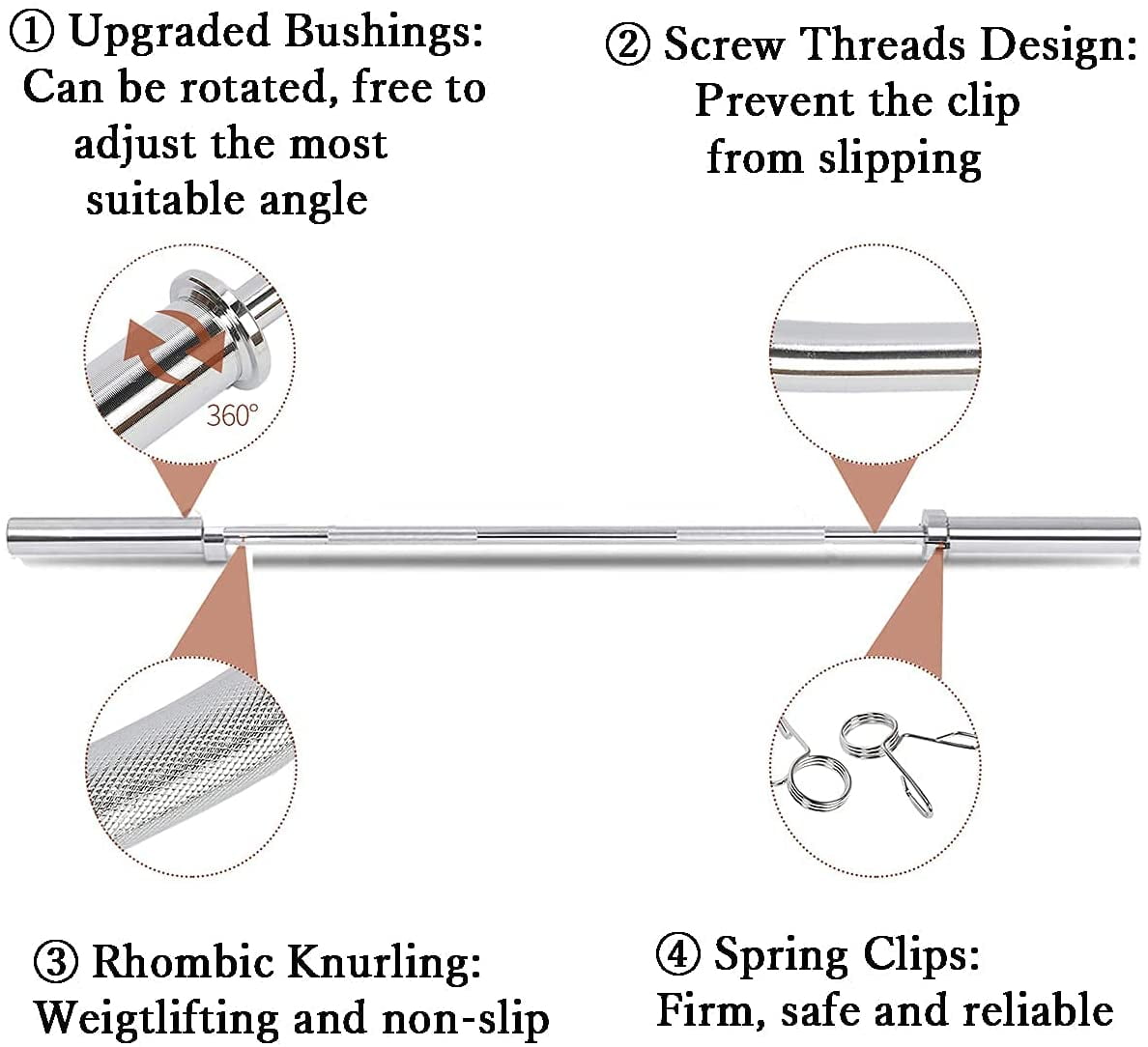 Superior Material: Qunbio weightlifting bar is made of high-grade steel and hard chrome treatment, multi-layer electroplating, it has the characteristics of non-slip and wear-resistant, no rust, good toughness, good resilience, and durability, which makes it have a longer service life Knurled Handle Design: The weight barbell bar adopts a knurled handle design, which increases the friction force, and also has non-slip performance to improve the grip. It can also effectively reduce the tension of the wrist and forearm, increase the safety of exercise, and ensure your comfort when exercising Sufficient Length and Weight: Our barbell is heavy enough and it’s 47.2 inches long. Sufficient length allows you to do more movements, and a certain weight can help you build muscle, which is a great option for you to do strength training Wide Application: Our barbell can meet all your training needs, especially your arms, legs, back, and hips. You can use it at home or take it to the gym for exercise to exercise muscles and relieve stress Compatible with Standard Weight Plates: 1.97-inch bar end diameter to ensure bars fit all standard plates with holes 2 inches. It comes with 2 pieces of spring clips. Weight plates are secured with spring clips to prevent them from sliding off during the exercise