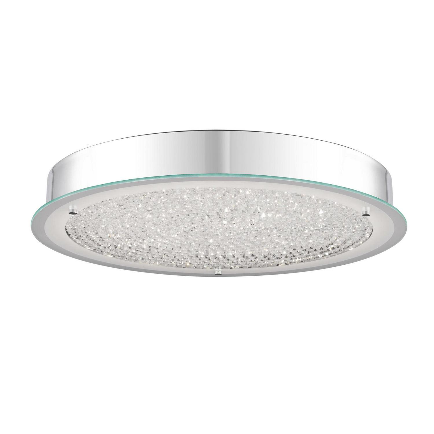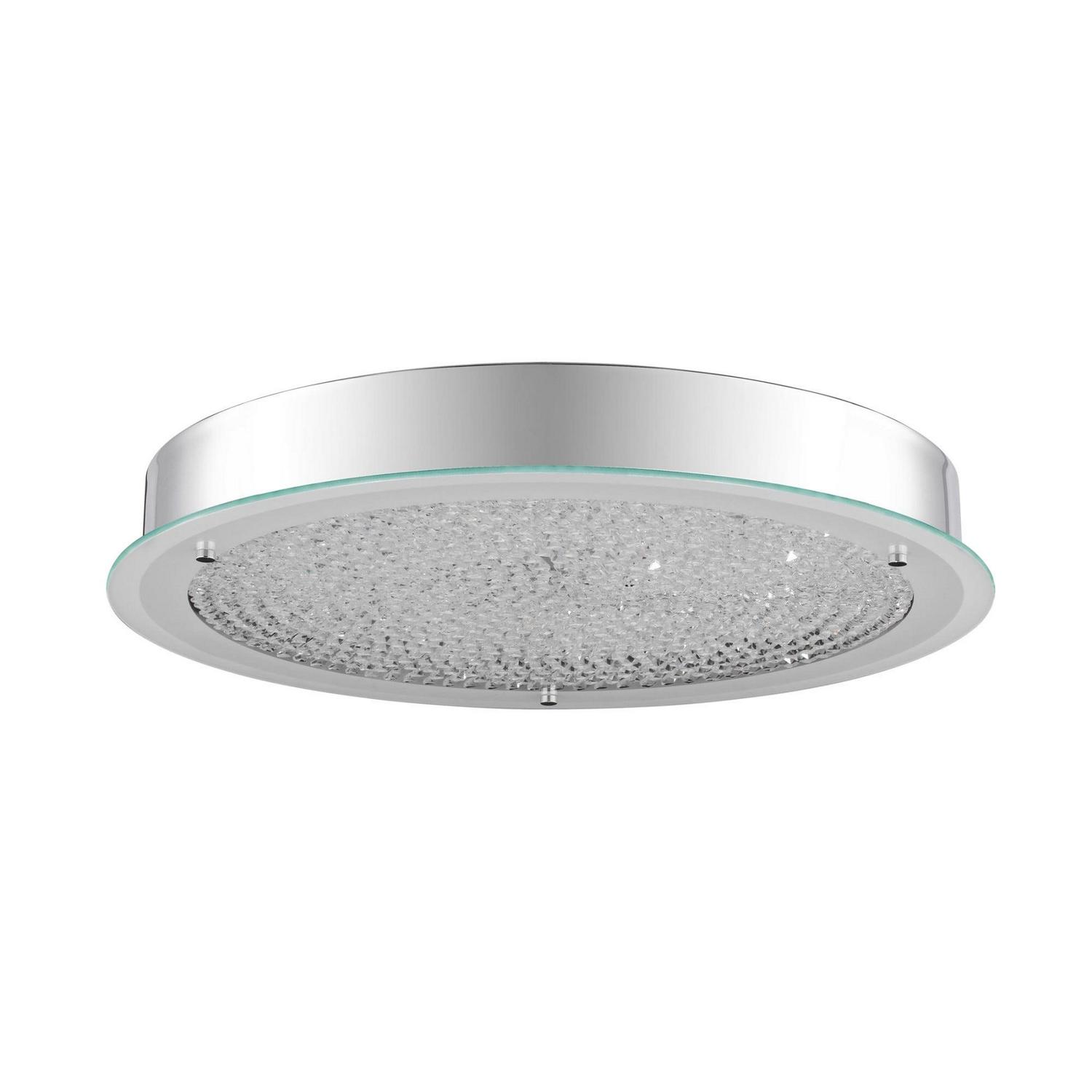 A simple yet stunning flush mount, the Blaze series is modern and sleek. The shimmering crystals â floatâ on a disk on glass that is frosted on the perimeter to enhance the striking design. The Polished Chrome finish on the base and accents add the perfect finishing touch.