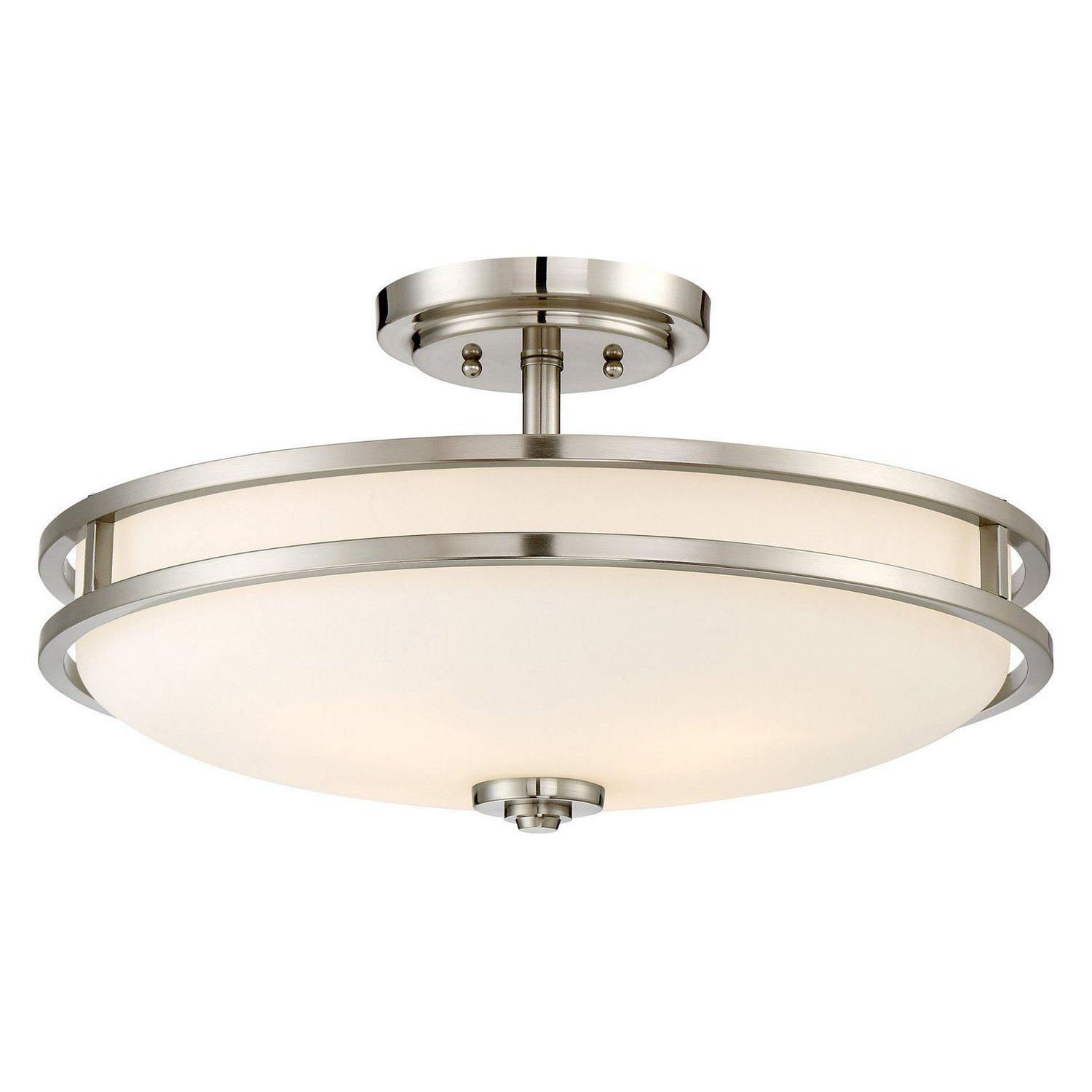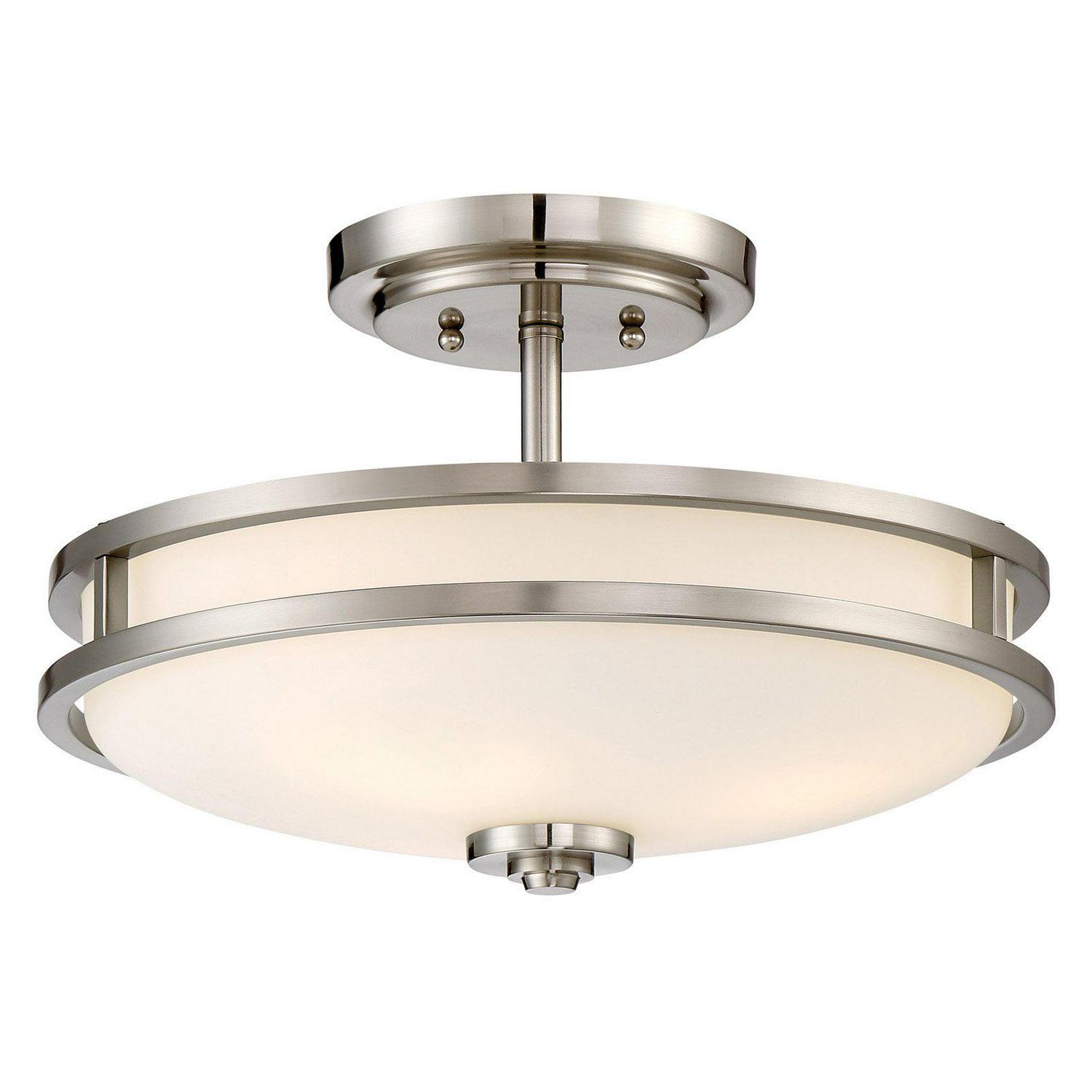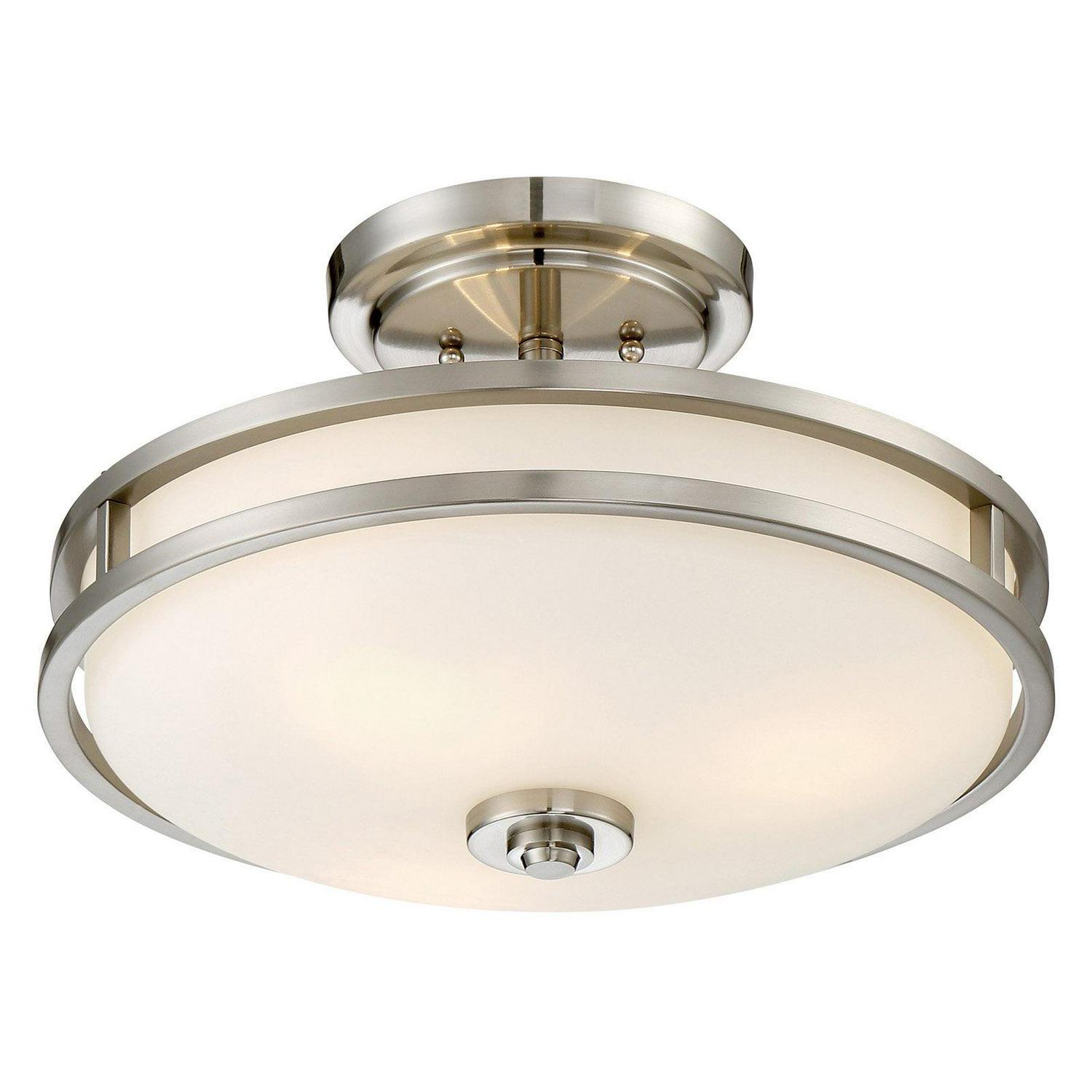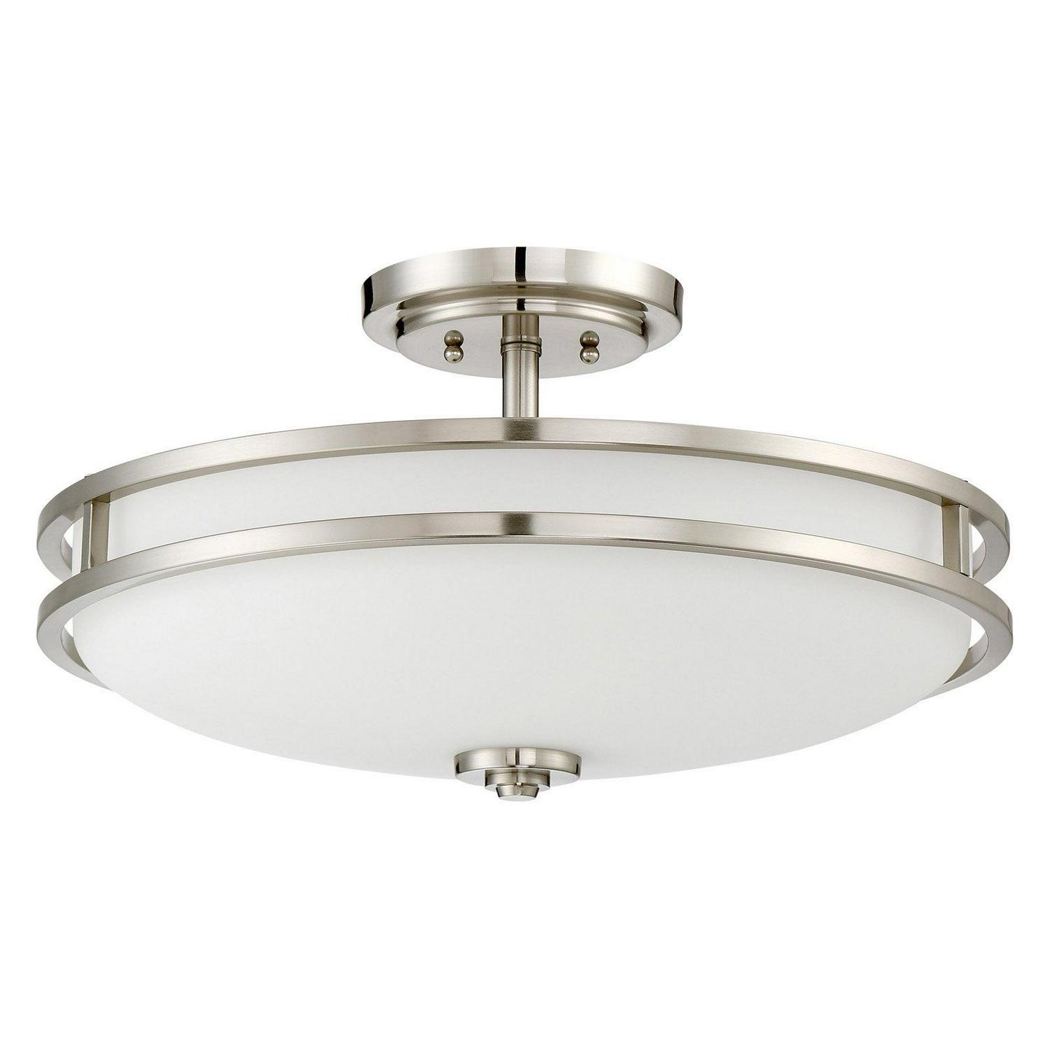Mount the Quoizel Cadet CDT1715 Semi Flush Mount Light on your ceiling to bring soft light and modern style to your interior. The design includes a round frame composed of two steel rings connected by short vertical supports. Etched glass surrounds the lamps and diffuses their illumination to eliminate glare, and it also distributes the light more evenly below. You can select your preferred finish and size from the available options when you purchase this semi flush mount light.