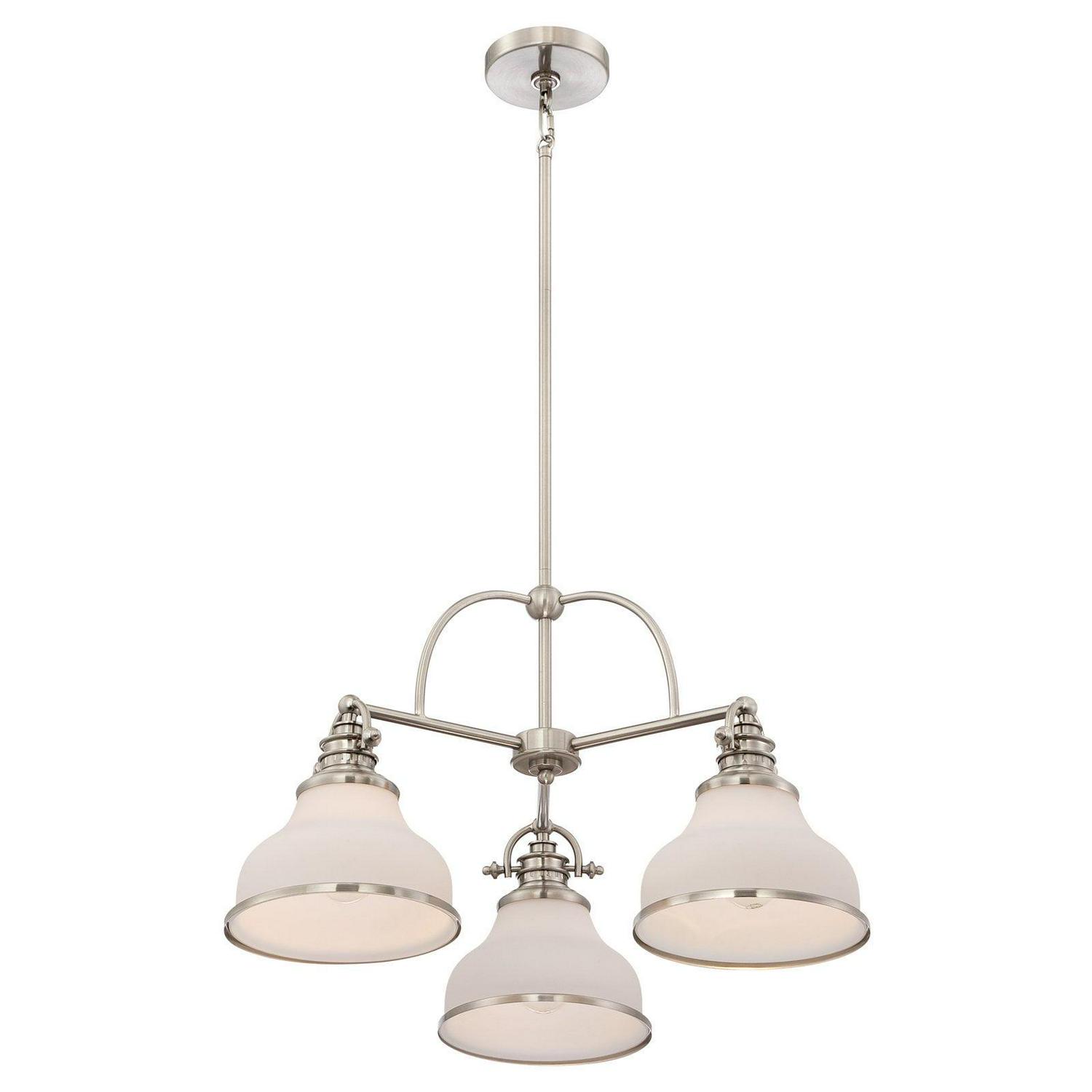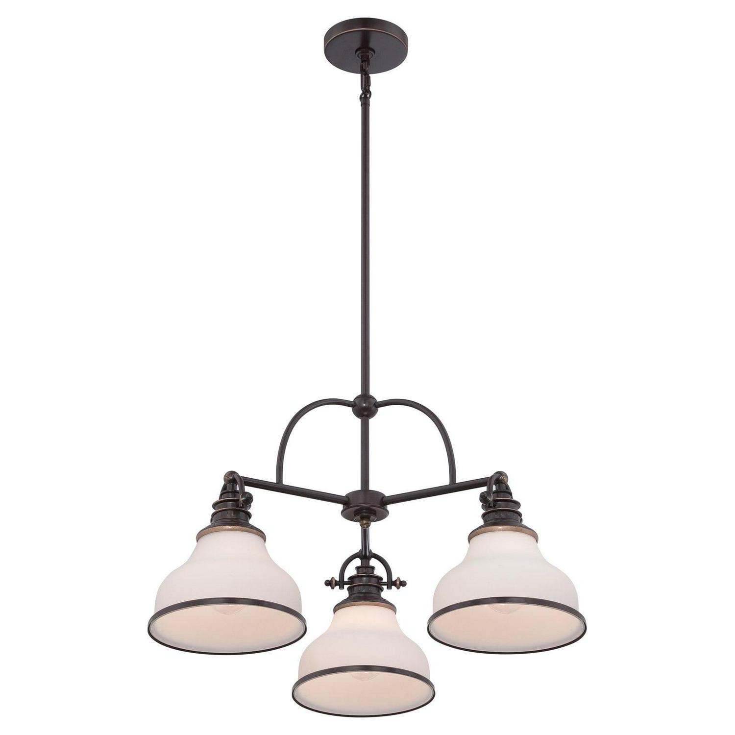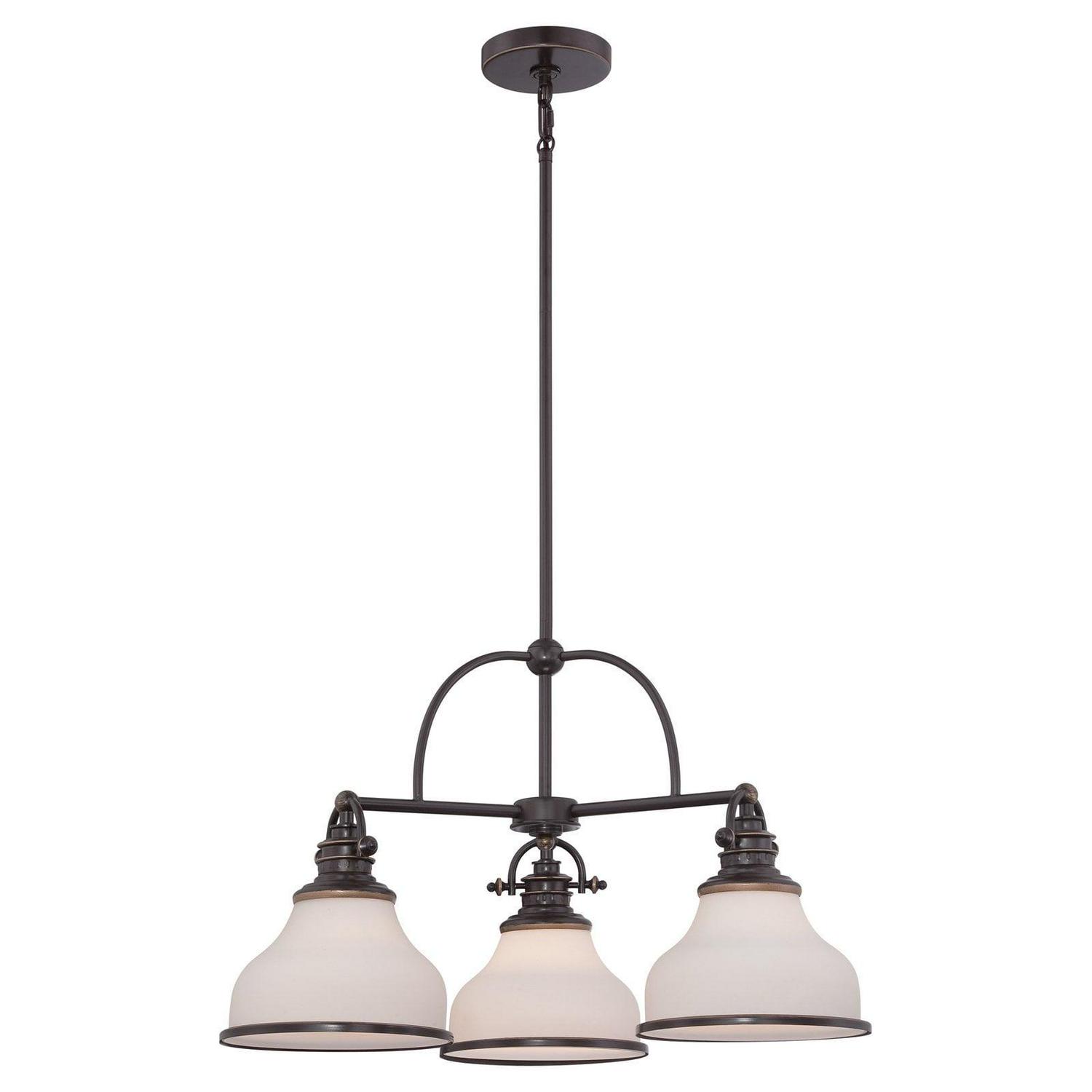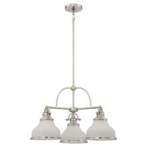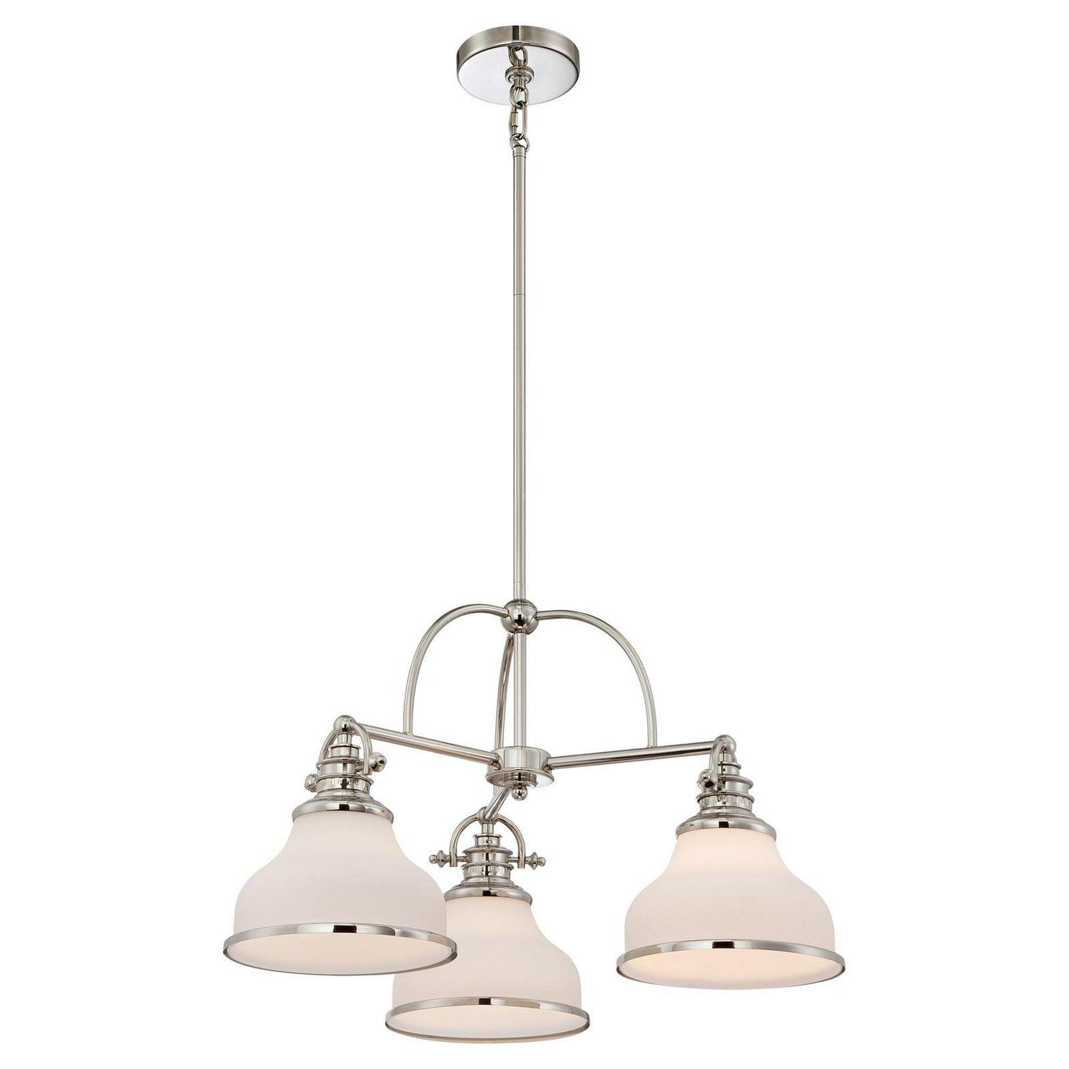 With its industrial fixture in select finish options and trio of etched opal glass shades, the Quoizel Grant GRT5103 Chandelier brings industrial chic lighting your kitchen or dining room. This chandelier requires three 100-watt bulbs, not included.
