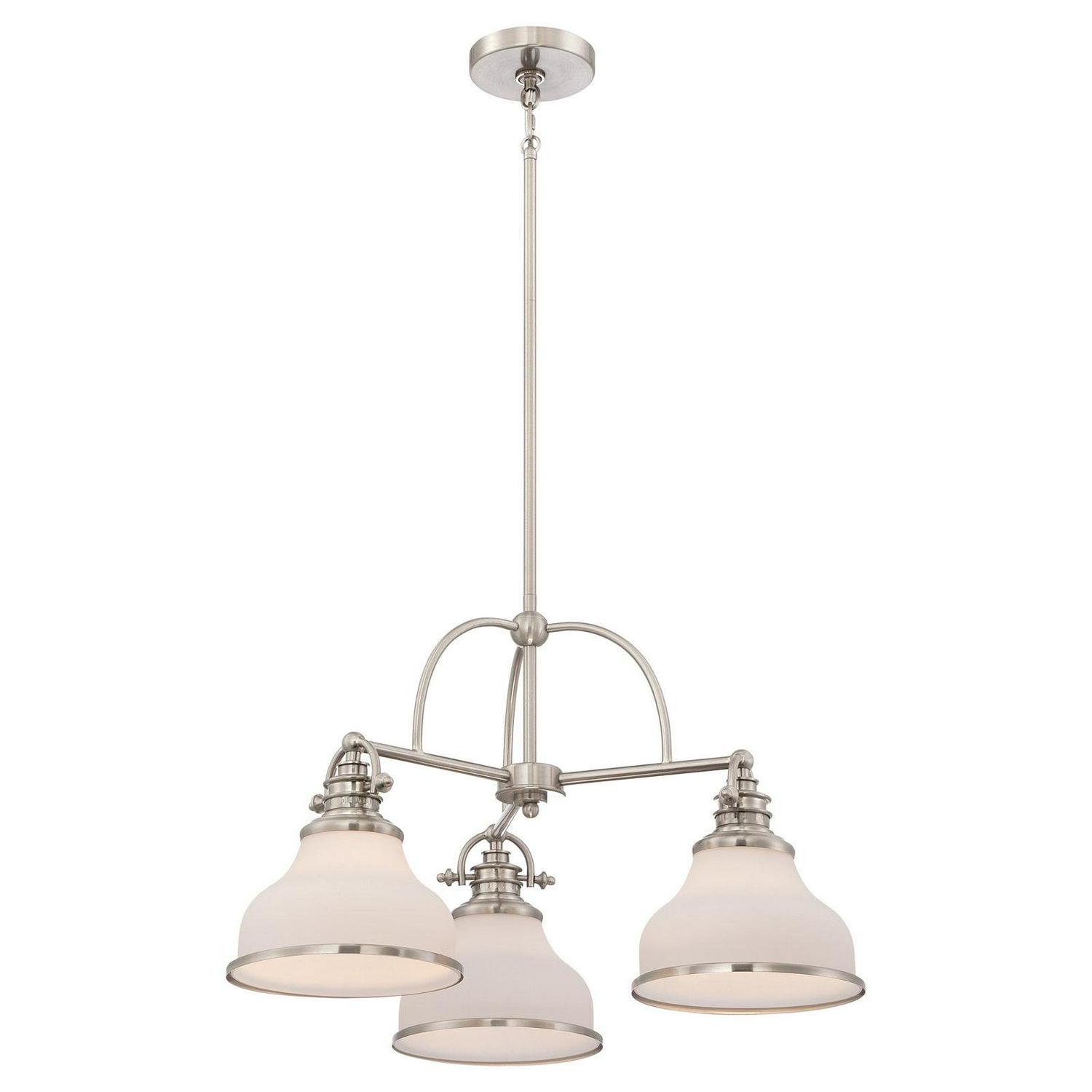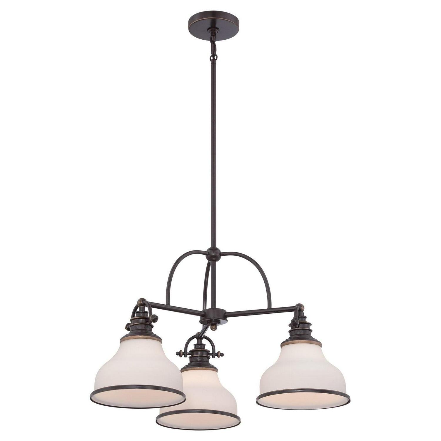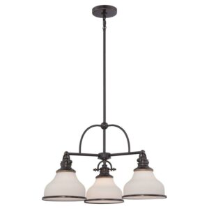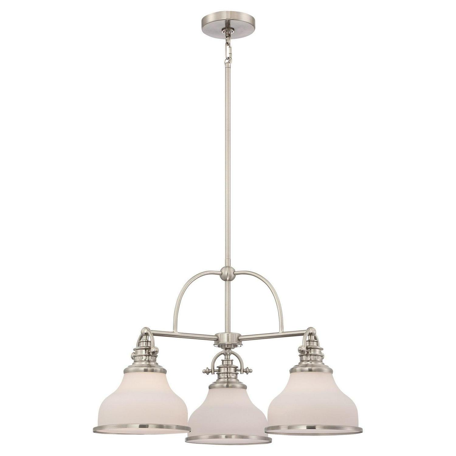 With its industrial fixture in select finish options and trio of etched opal glass shades, the Quoizel Grant GRT5103 Chandelier brings industrial chic lighting your kitchen or dining room. This chandelier requires three 100-watt bulbs, not included.