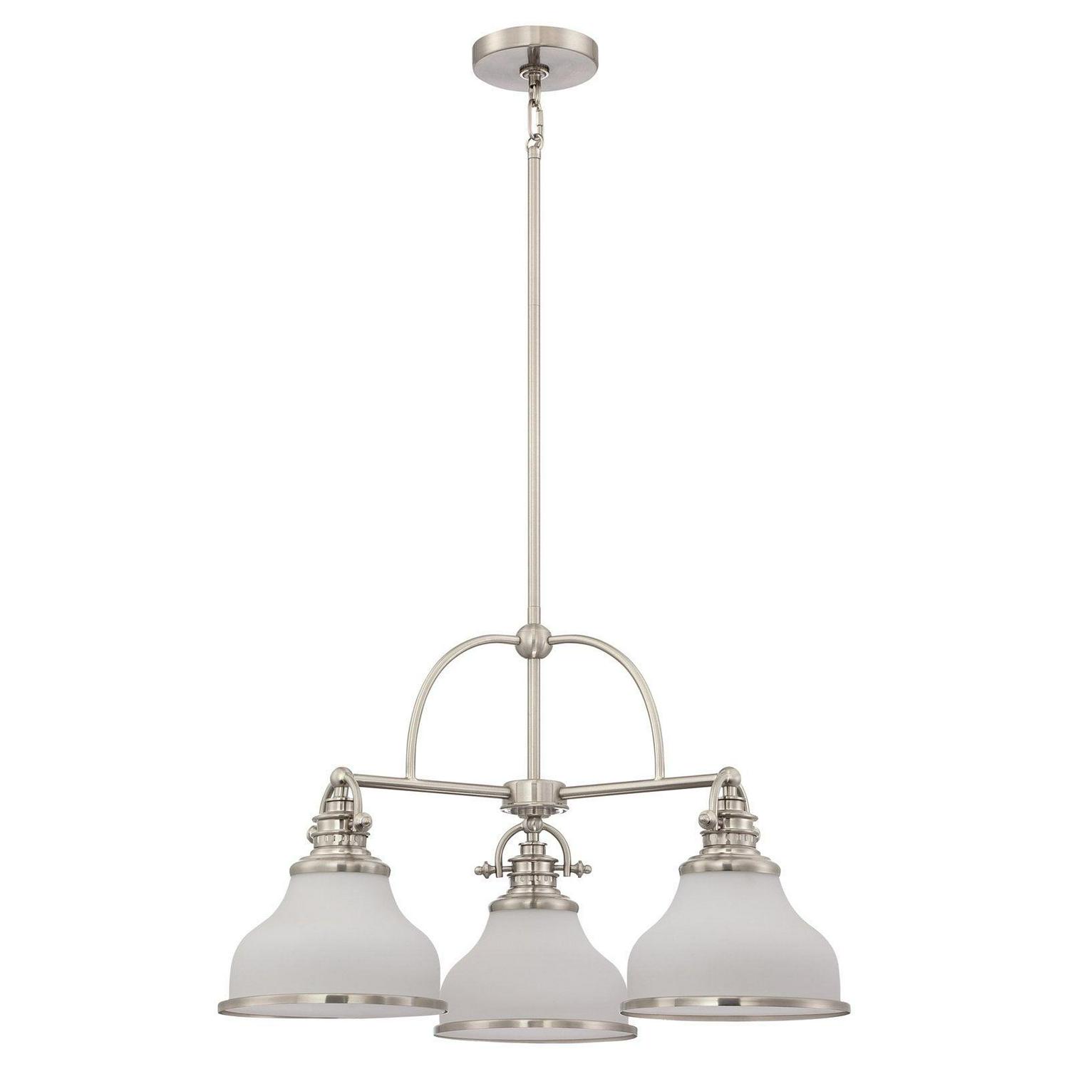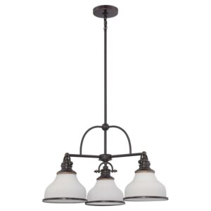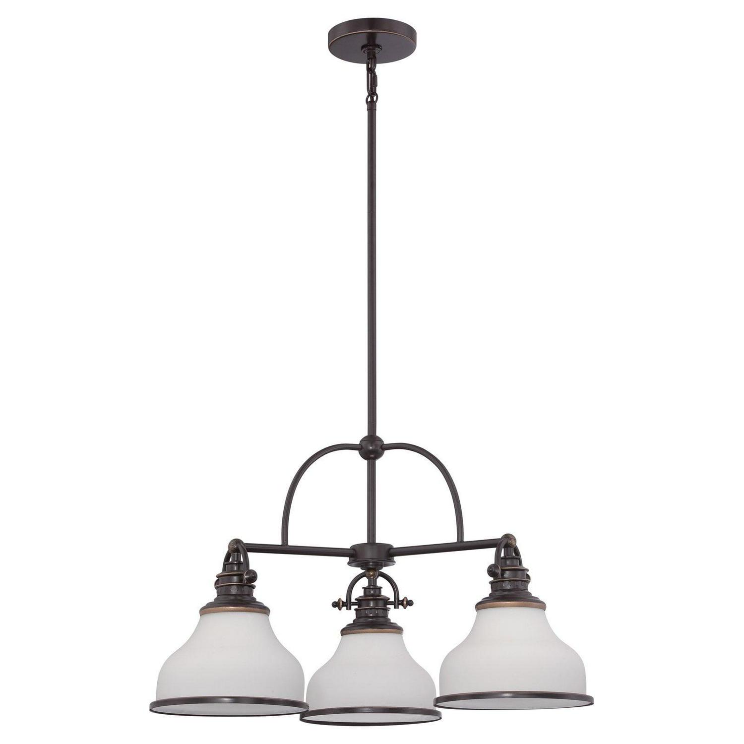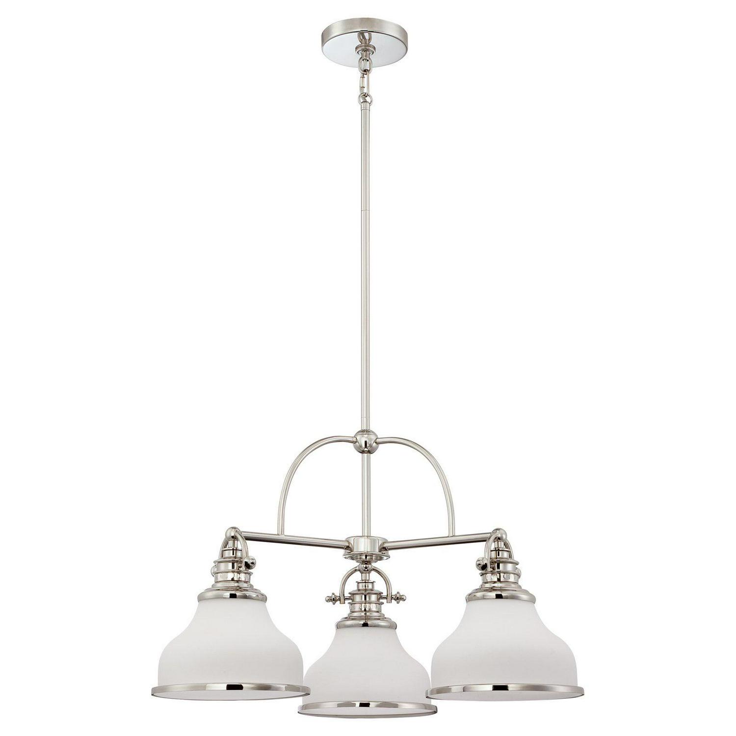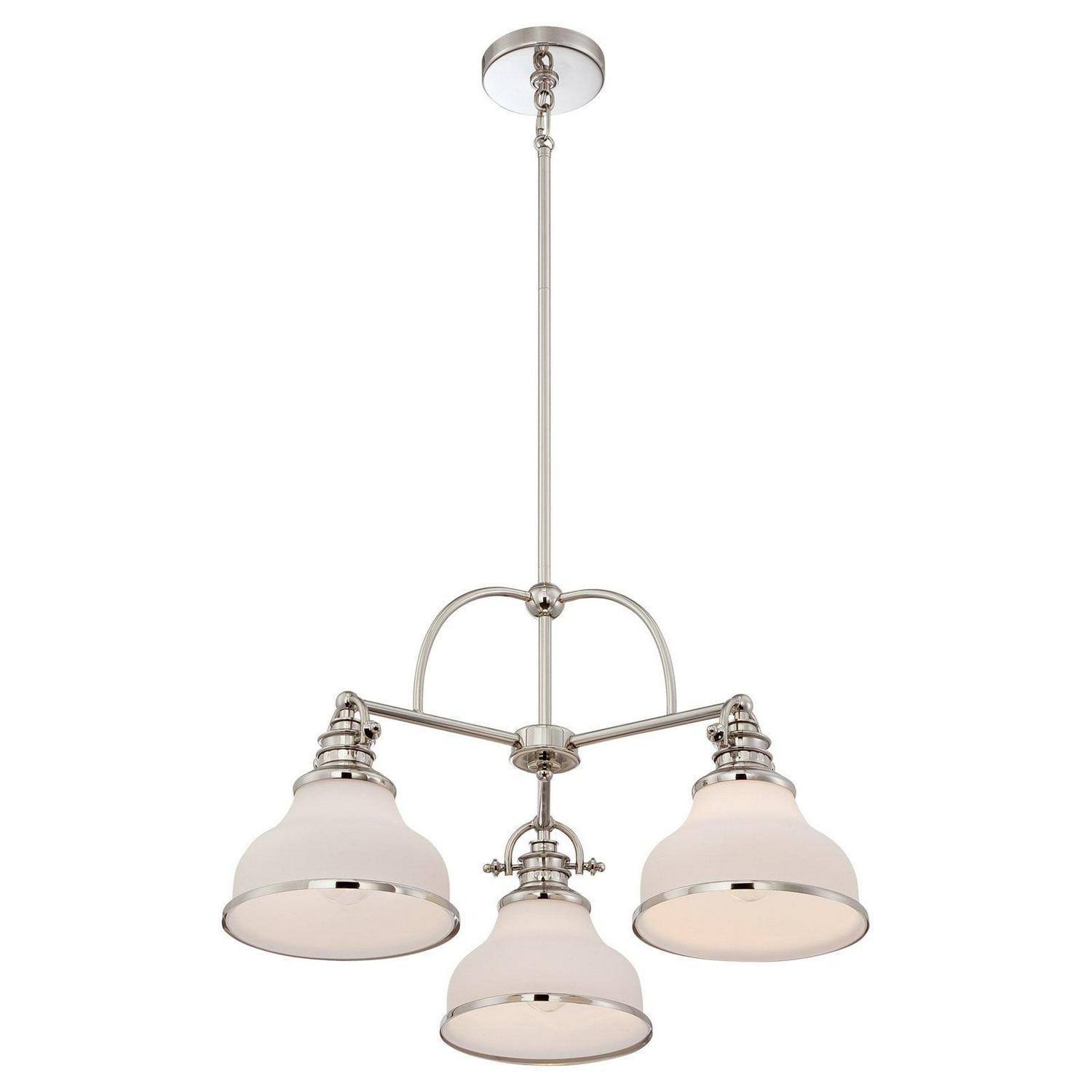 With its industrial fixture in select finish options and trio of etched opal glass shades, the Quoizel Grant GRT5103 Chandelier brings industrial chic lighting your kitchen or dining room. This chandelier requires three 100-watt bulbs, not included.