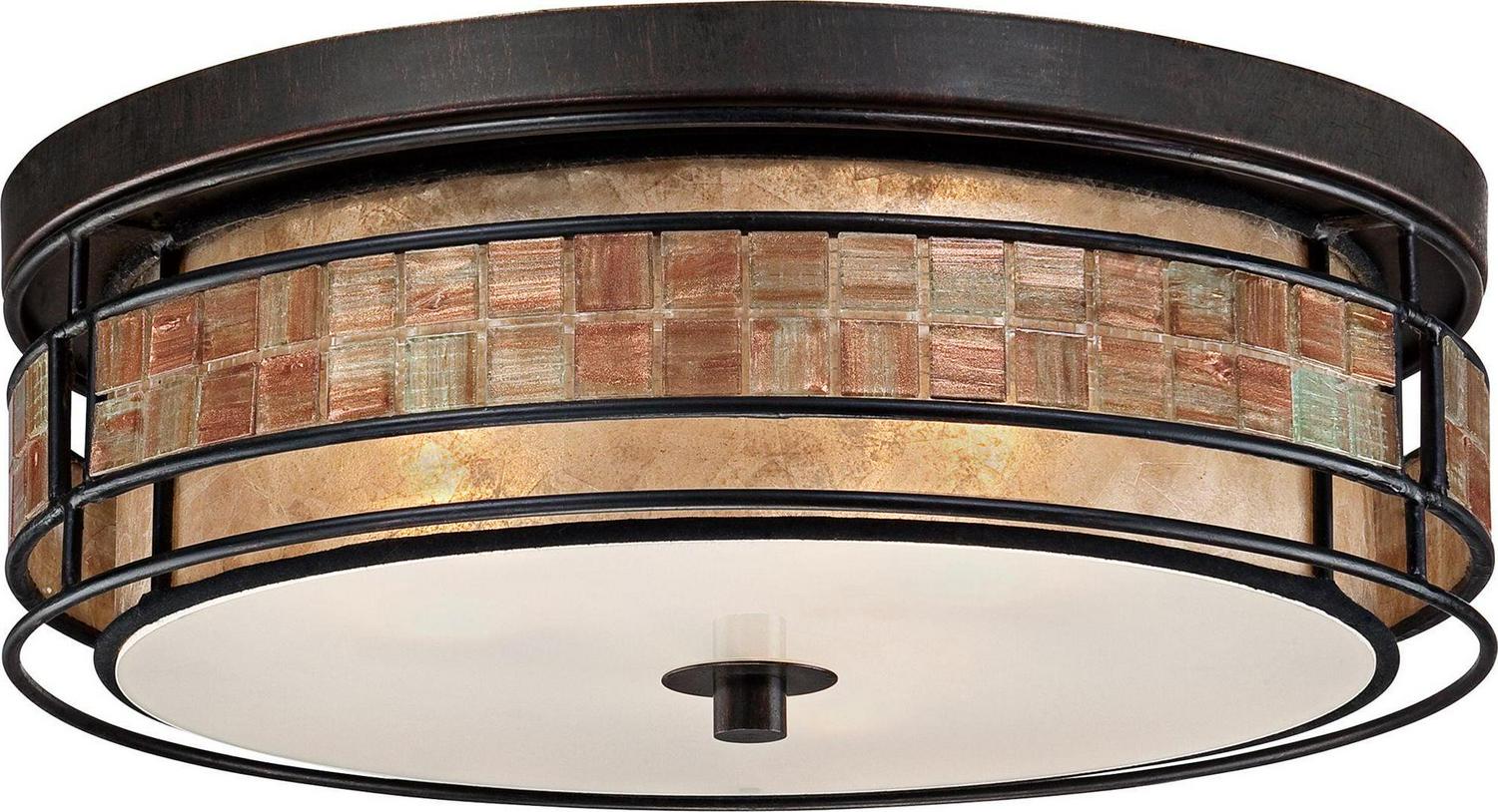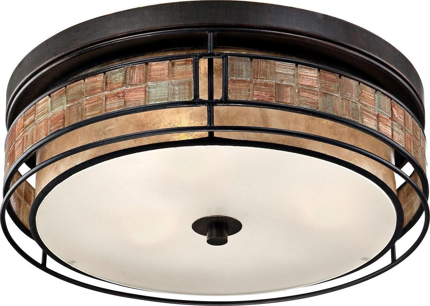 Add fresh style to a bedroom, foyer or hallway with this large, contemporary drum flush mount ceiling light. With a warm Renaissance Copper finish frame and a mosaic tile stripe that appears to float around the taupe mica shade, this fixture exudes elegance. The shimmery copper-tone tiles add a touch of dazzle to this chic look. From the Quoizel Naturals Laguna collection by Quoizel Lighting.
