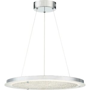 A simple yet stunning pendant, the Blaze series is modern and sleek. The shimmering crystals float on a disk on glass that is frosted on the perimeter to enhance the striking design. The Polished Chrome finish on the base and accents add the perfect finishing touch. Matching flush mount available.