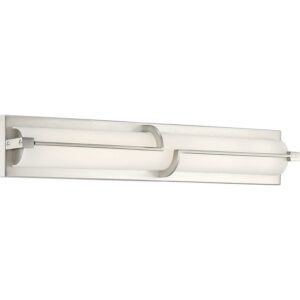 The Lateral smashes the stereotype of symmetry in bath lighting. Thin modern braces secure the etched glass shade from opposite directions and attach to the brushed nickel backplate. The crisp lines and modern aesthetic of this collection for Platinum by Quoizel instantly updates even the plainest of spaces.