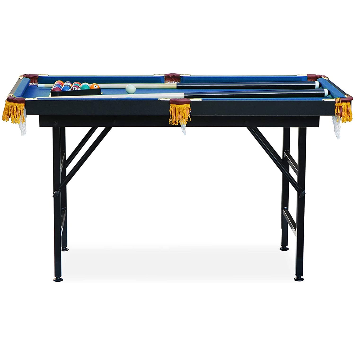 4-foot classically designed billiard/pool table is great for the game room, family room, or garage 1/2-inch MDF bed with green regulation grade velvet felt for smooth ball rolls Features L88 rubber bumper cushions that help ensure consistent bounce and better playability Cotton net ball pockets effectively catch billiard balls Includes (2) 42-inch billiard cues, (16) 1.5-inch resin billiard balls, (2) pool cue chalks, authentic triangle rack, and premium wooden brush Game table is great for kids, teens and adults Material: Engineered Wood Color: Green Dimensions (L x W x H): 47 x 25 x 27 inches Weight: 35 pounds Manufacturer warranty: Lifetime warranty