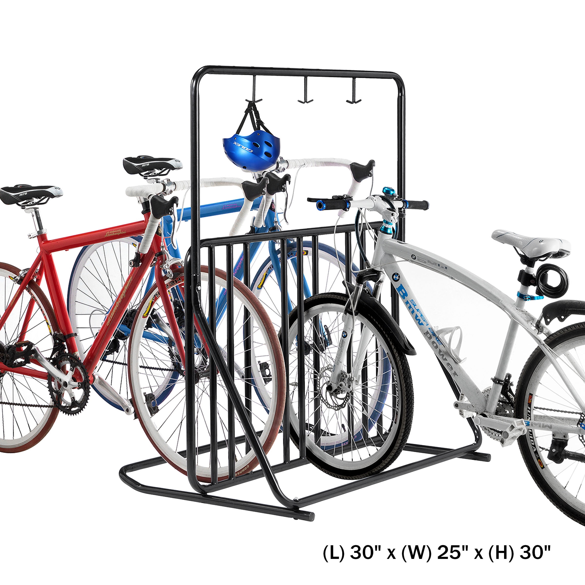 VERTICAL BIKE RACK – Park any mountain, BMX, road, kids’, or beach cruiser bicycle on this 6-place bike storage rack and hang safety helmets from its conveniently placed hooks. FREESTANDING – Simply drive your front tire into the wheel holder of the freestanding bike stand for a sturdy hold and upright parking. 2-SIDED BIKE RACK – The dual-sided bicycle rack offers flexibility in parking for a variety of bike sizes and styles placed next to or opposite each other. DURABLE AND STABLE – Made of durable tubular steel with a black powder-coated finish, this bike storage rack can hold up against outdoor elements and support heavy bicycles. MATERIALS – Powder-Coated Tubular Alloy Steel. DIMENSIONS – (L) 30″ x (W) 25″ x (H) 30″. COLOR – Black.