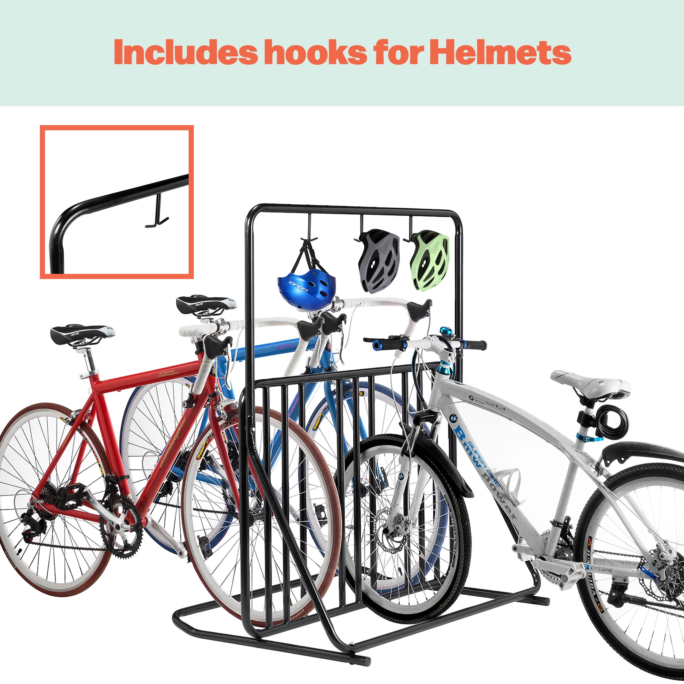 Park your bicycle without scuffing walls or damaging its components with the 6-place Freestanding Bike Rack by RAD Cycle. This floor bike rack is great for mountain, BMX, road, and kids’ bikes, as well as beach cruiser bicycles and bikes without kickstands. The dual sided bike storage stand offers hooks for helmets and parking for a variety of bike sizes and styles placed side-by-side or opposite each other.