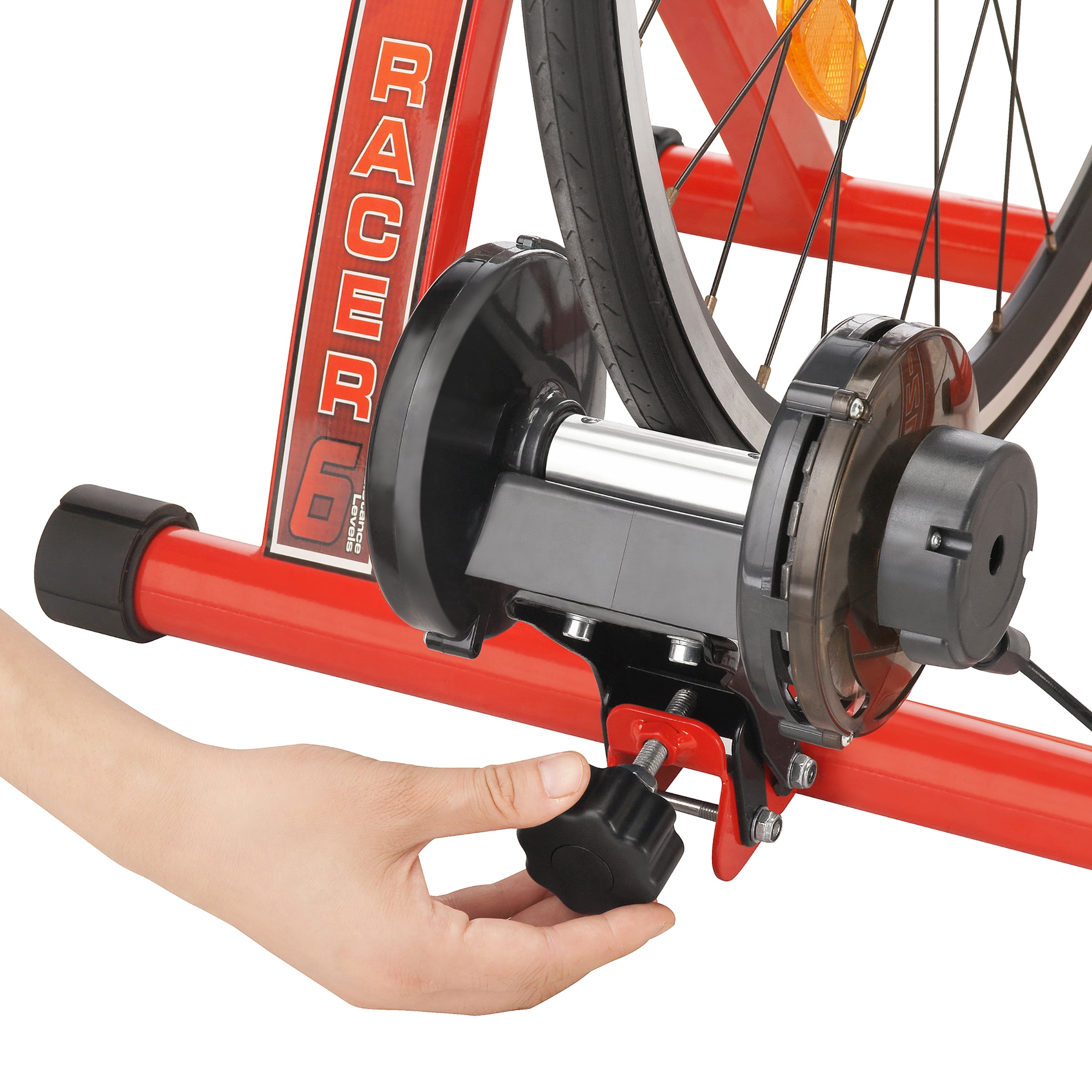 Designed for bikes with quick release rear axle. 7 powerful magnetic resistance levels simulate road conditions. Wide base design for extra stability and a smooth, quiet ride. EZ change resistance controller clamps to your handlebars. Customize your workout with resistance levels and gear changes. Train safely away from traffic areas year around. No-slip floor grip stabilizes front wheel. Trainer folds for easy storage. Riser Block Included! Accommodates 26-28″ and700cc tires. Brand – RAD Cycle Products. Model – 1113 RAD MAX Racer. Shipping Weight – 15. Item Dimensions – H 18″ x L15″ x W 21.25″.