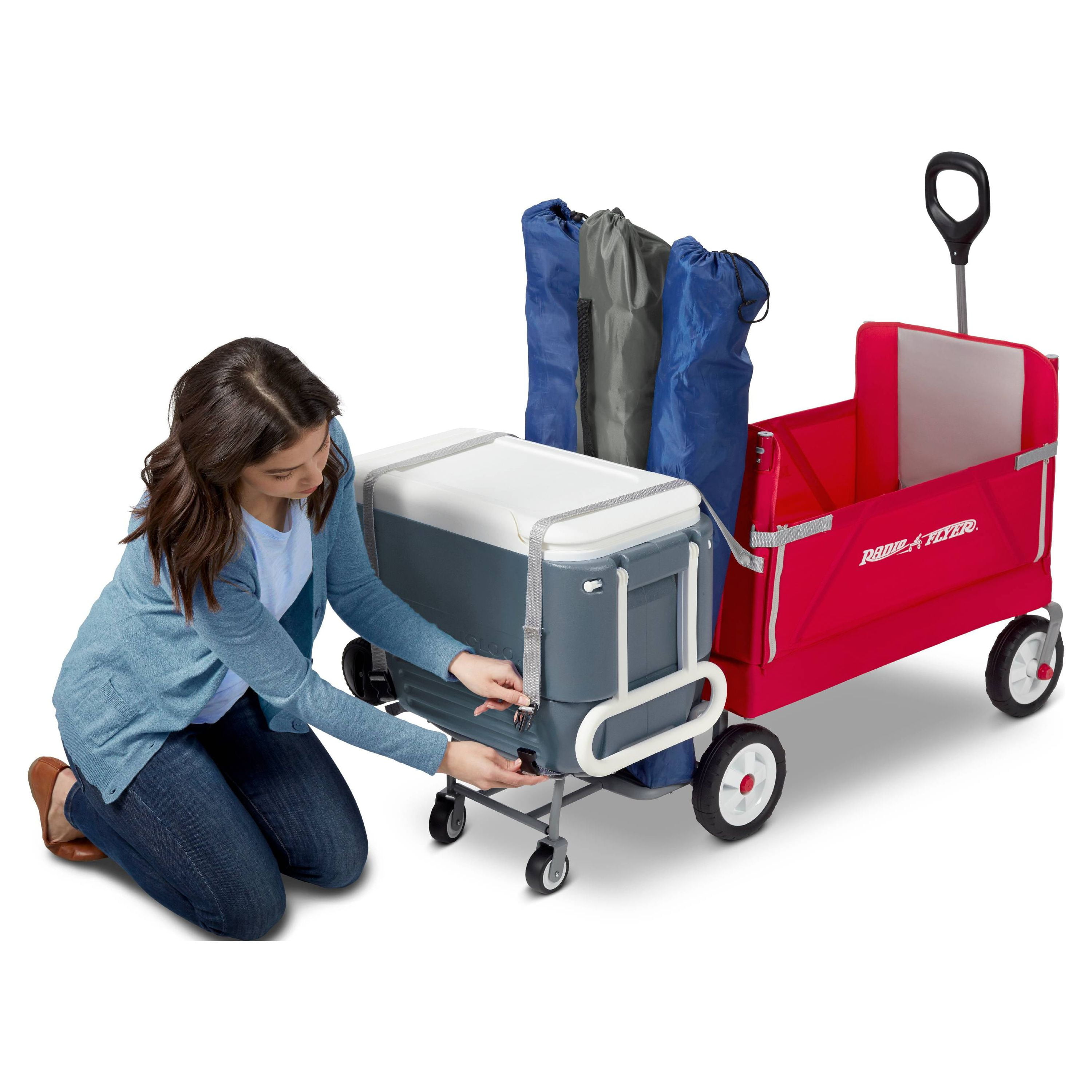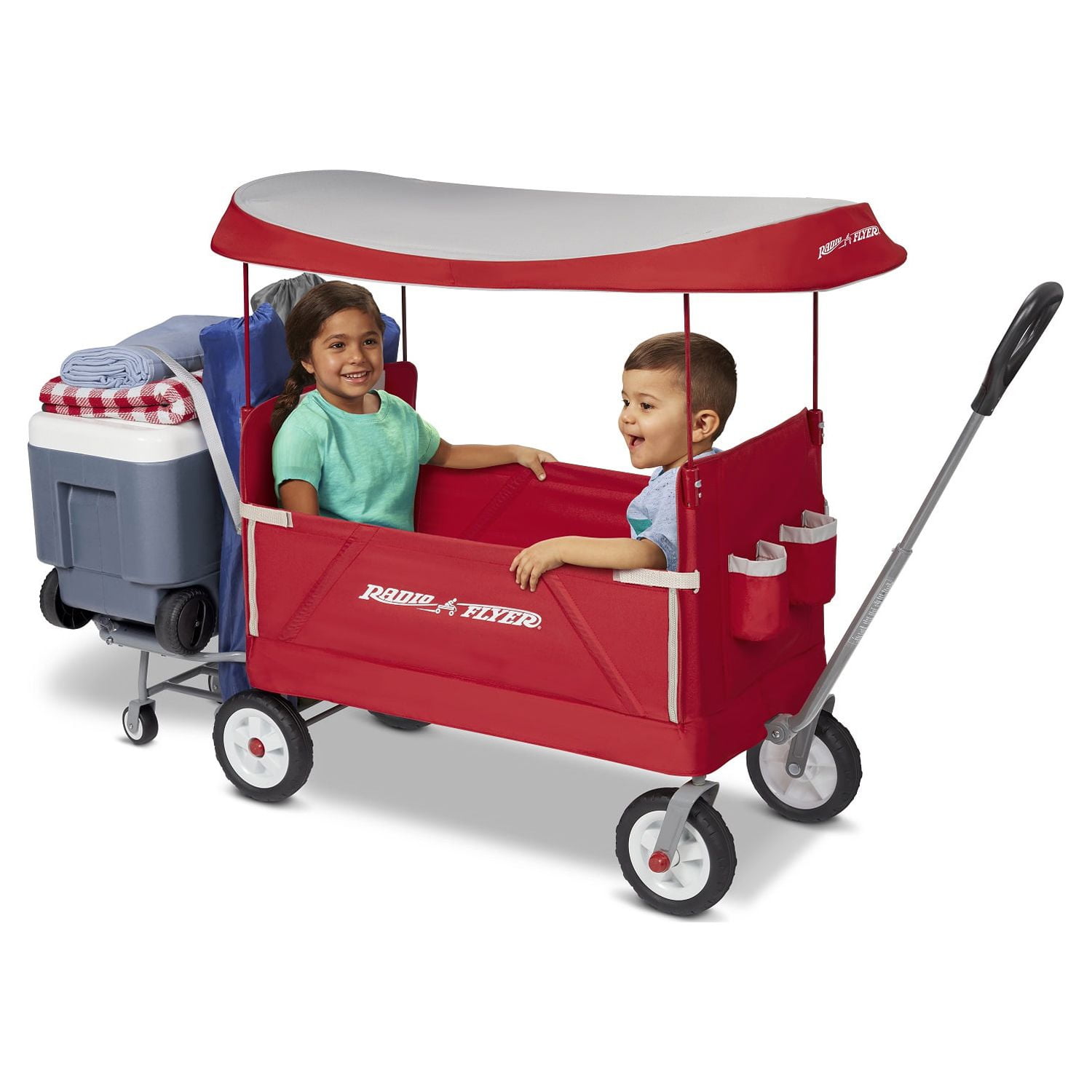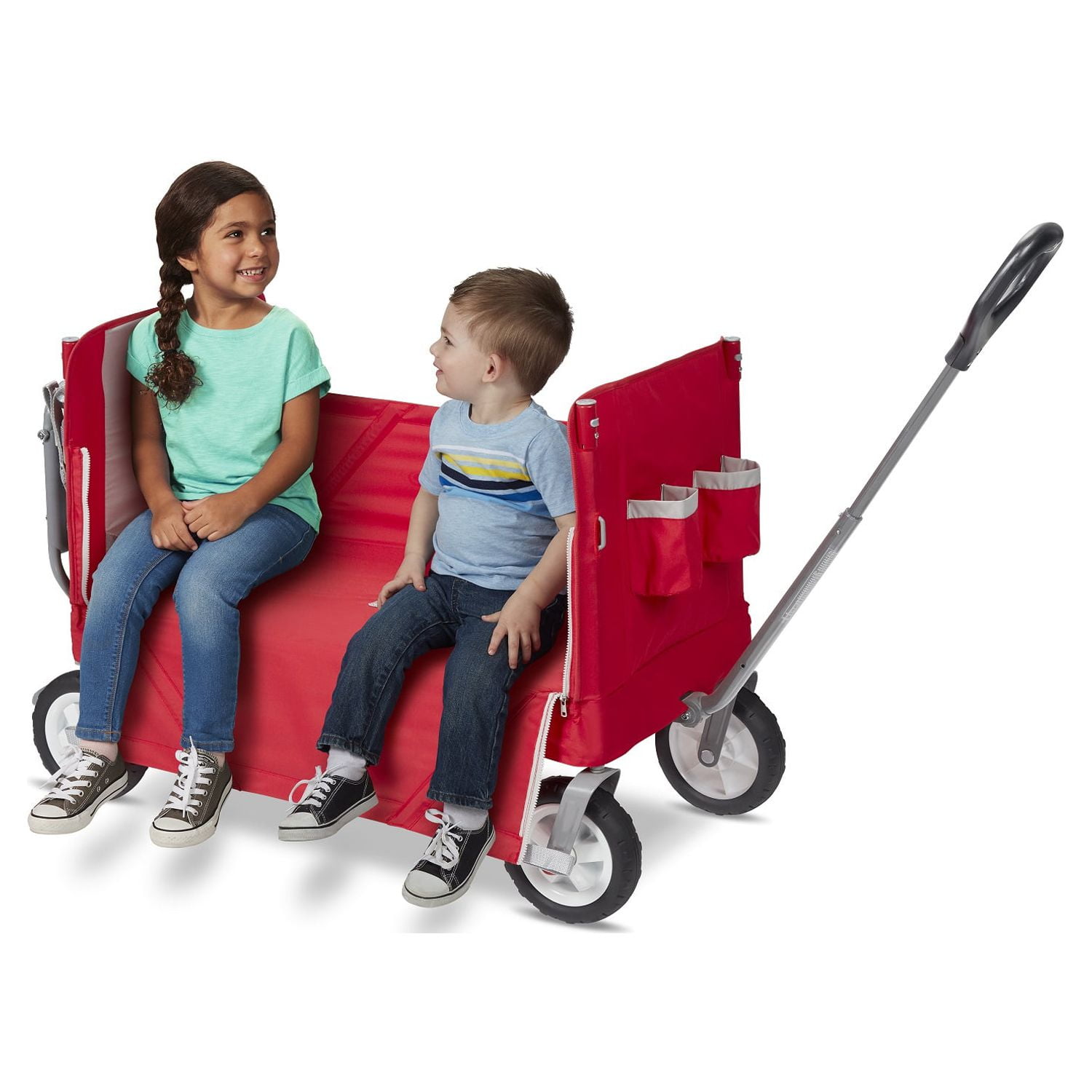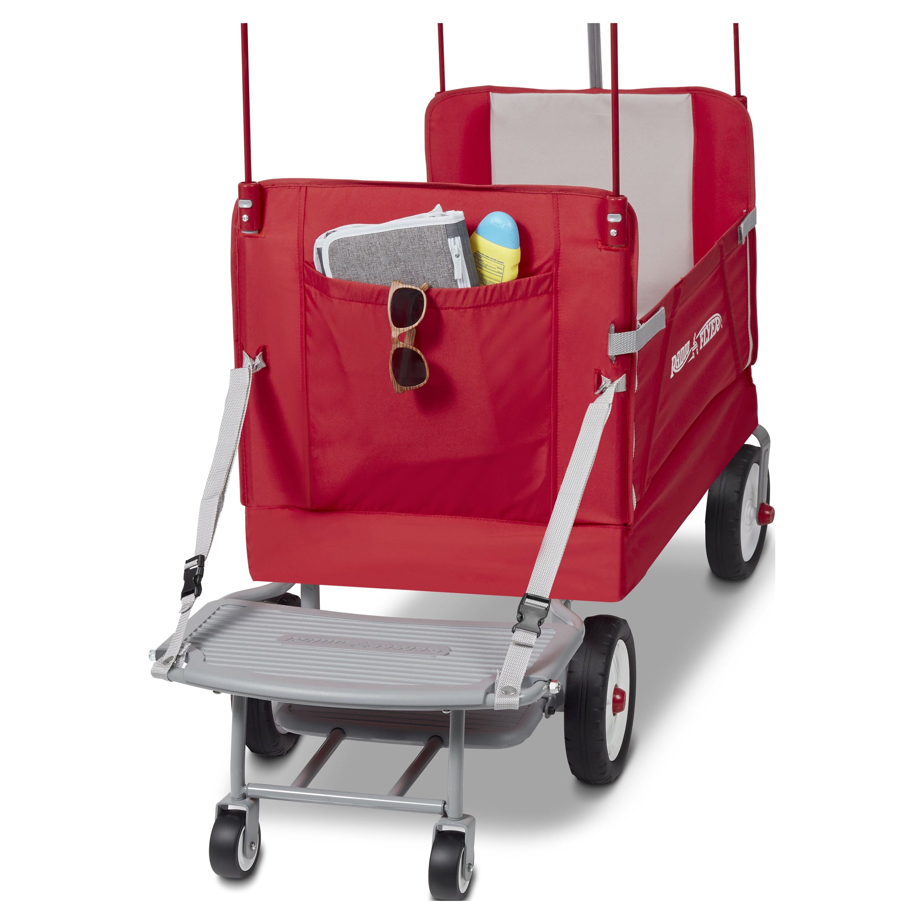 3 wagons in 1: hauling, 2 rider seating, bench seating Radio Flyer wagons pass ASTM F963-23 Toy Safety Standard Stow away cooler caddy holds extra cargo Easy one hand fold, folds flat for easy storage Seat belts for added safety UV canopy protects from the sun 2 front cup holders DuraClean fabric that wipes clean Maximum weight capacity in wagon: 150 lbs. Maximum weight capacity on cooler caddy: 50 lbs. Assembled product height: 40 in. Assembled product width: 20 in. For 1½+ years