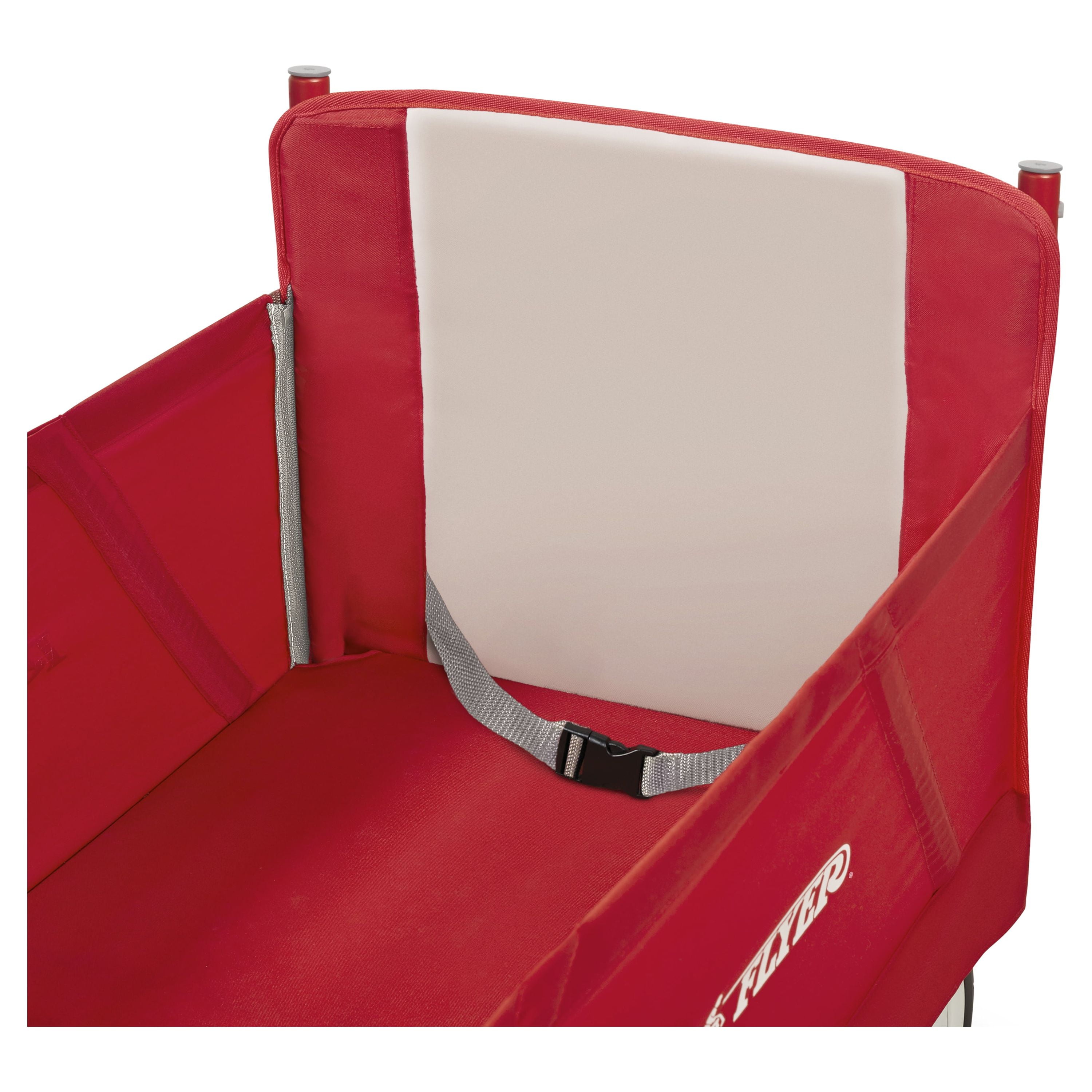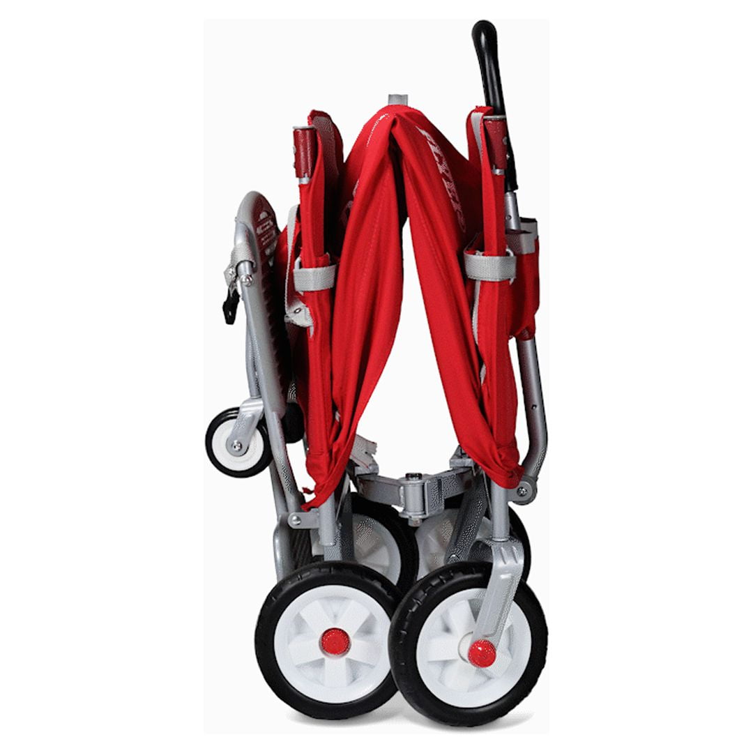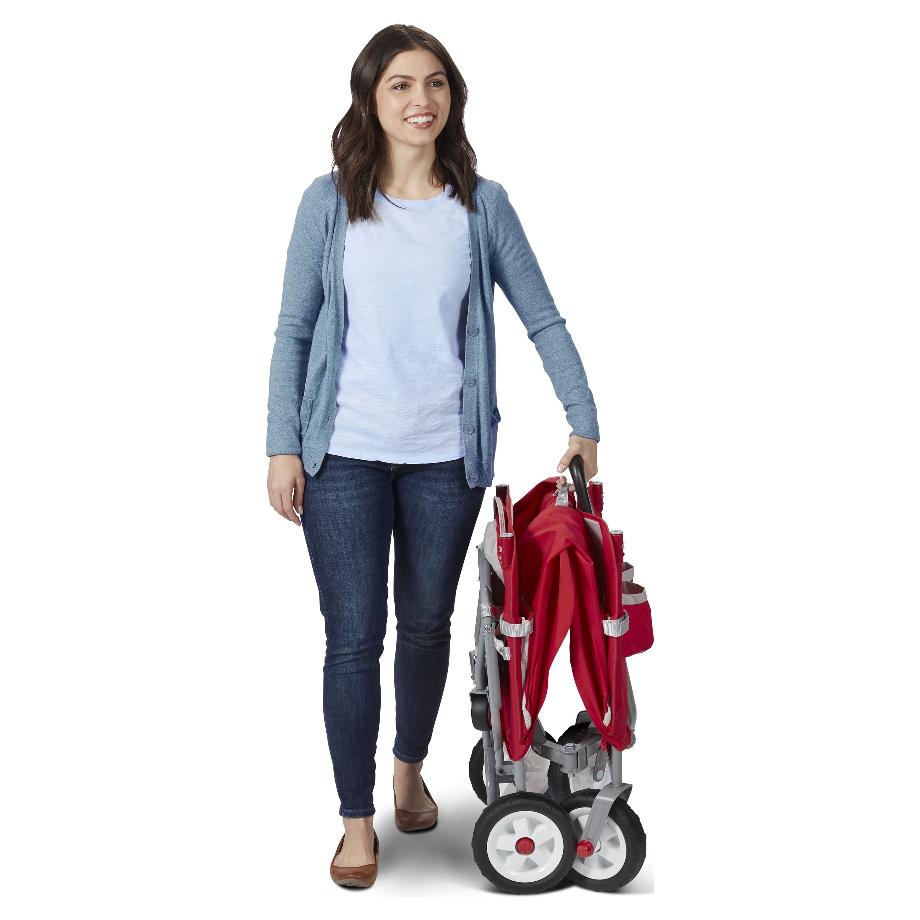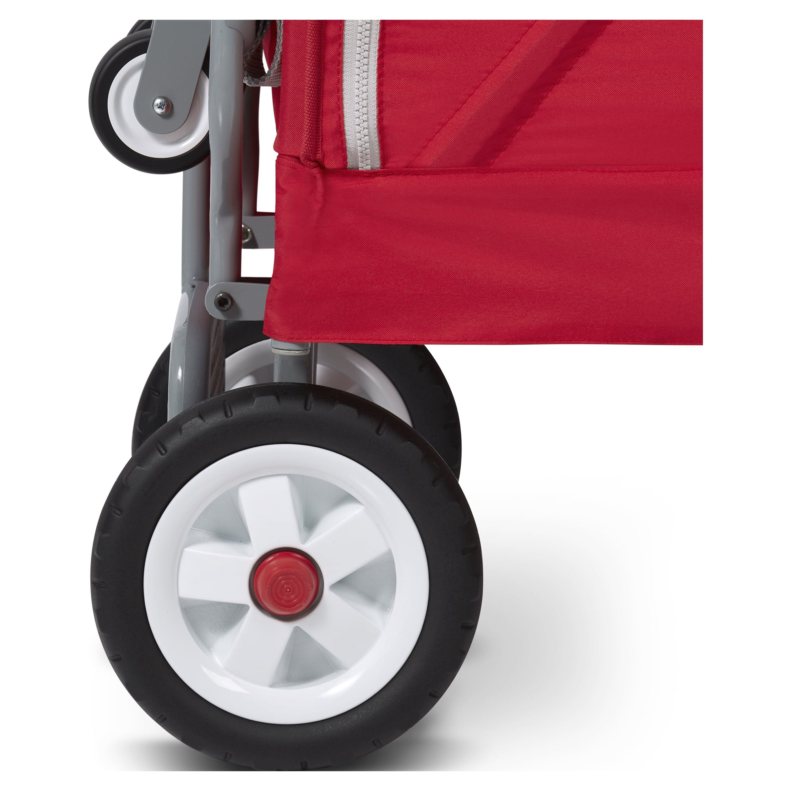 3 wagons in 1: hauling, 2 rider seating, bench seating Radio Flyer wagons pass ASTM F963-23 Toy Safety Standard Stow away cooler caddy holds extra cargo Easy one hand fold, folds flat for easy storage Seat belts for added safety UV canopy protects from the sun 2 front cup holders DuraClean fabric that wipes clean Maximum weight capacity in wagon: 150 lbs. Maximum weight capacity on cooler caddy: 50 lbs. Assembled product height: 40 in. Assembled product width: 20 in. For 1½+ years