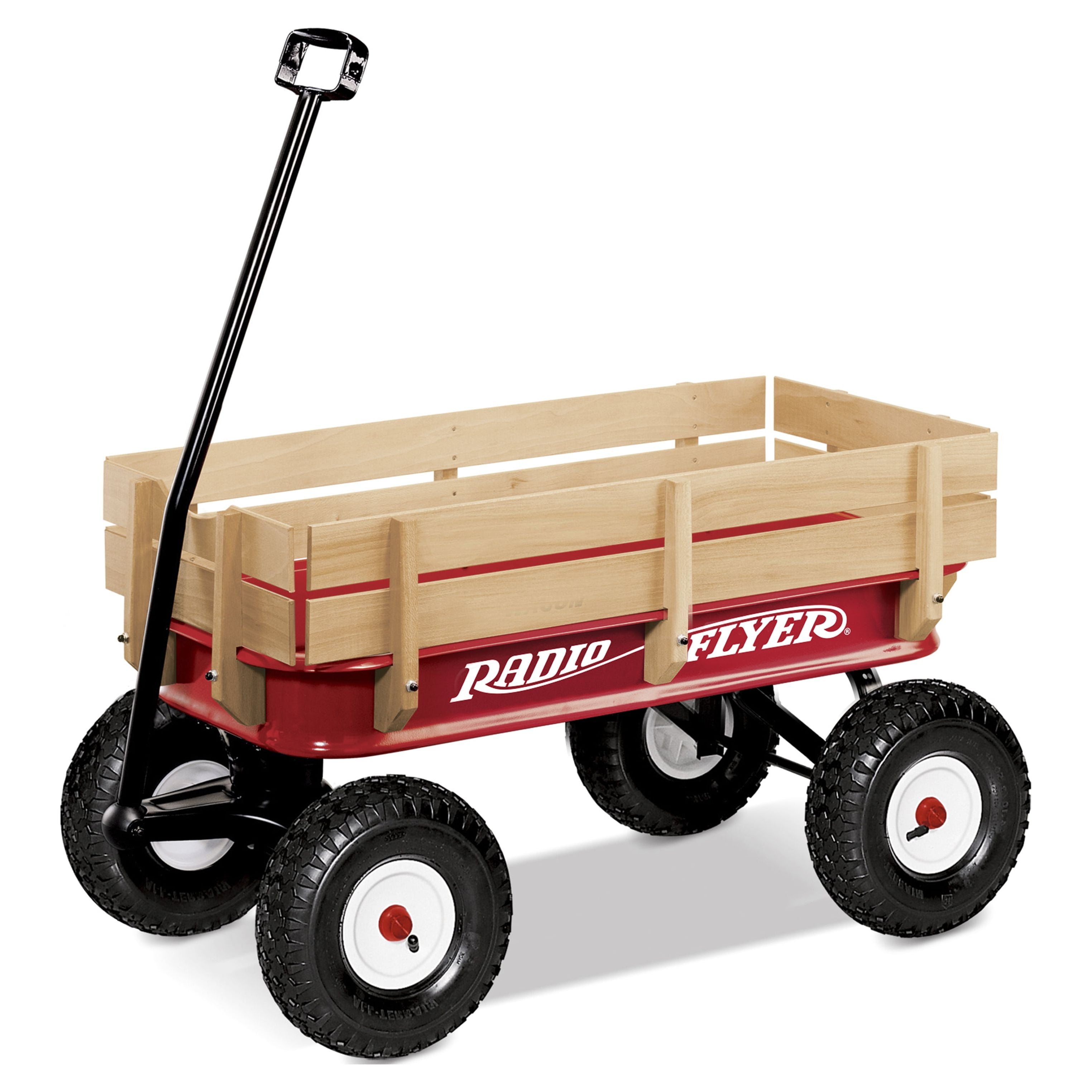 With sturdy all-steel construction rugged air tires and wooden stake sides this classic red wagon is built to handle adventures both on and off road. Radio Flyer’s All Terrain Wagon combines a classic design with the added benefit of 10? rugged air tires. These all-terrain air tires are designed to provide a smooth ride on any terrain! This wagon also features an extra-long handle that folds under for storage when not in use and has a no-pinch ball joint to keep fingers safe. Maximum weight capacity 200 lbs. Recommended for children ages 1 ½+ years.