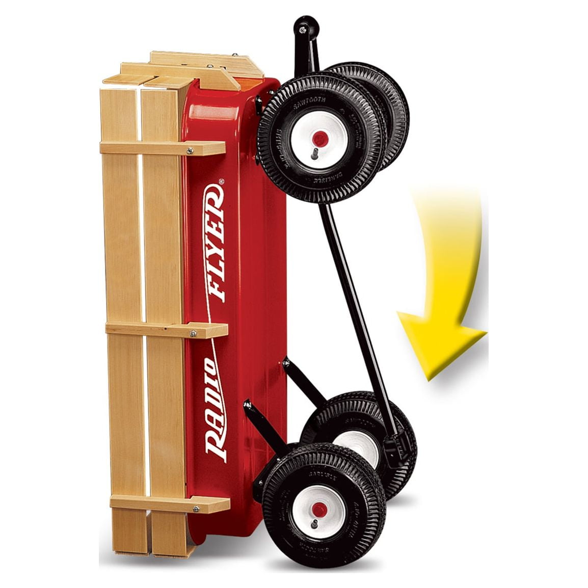 Rugged 10 inch air tires for a smooth ride on any terrain All-steel seamless body with no-scratch edges Wooden stake sides Extra-long handle folds under for easy storage when not in use Controlled turning radius prevents tipping to keep your child safe No-pinch ball joint keeps fingers safe Assembled dimensions: 40.55 in. x 20.5 in. x 39.5 in. Maximum weight capacity: 200 lbs. For 1 ½+ years