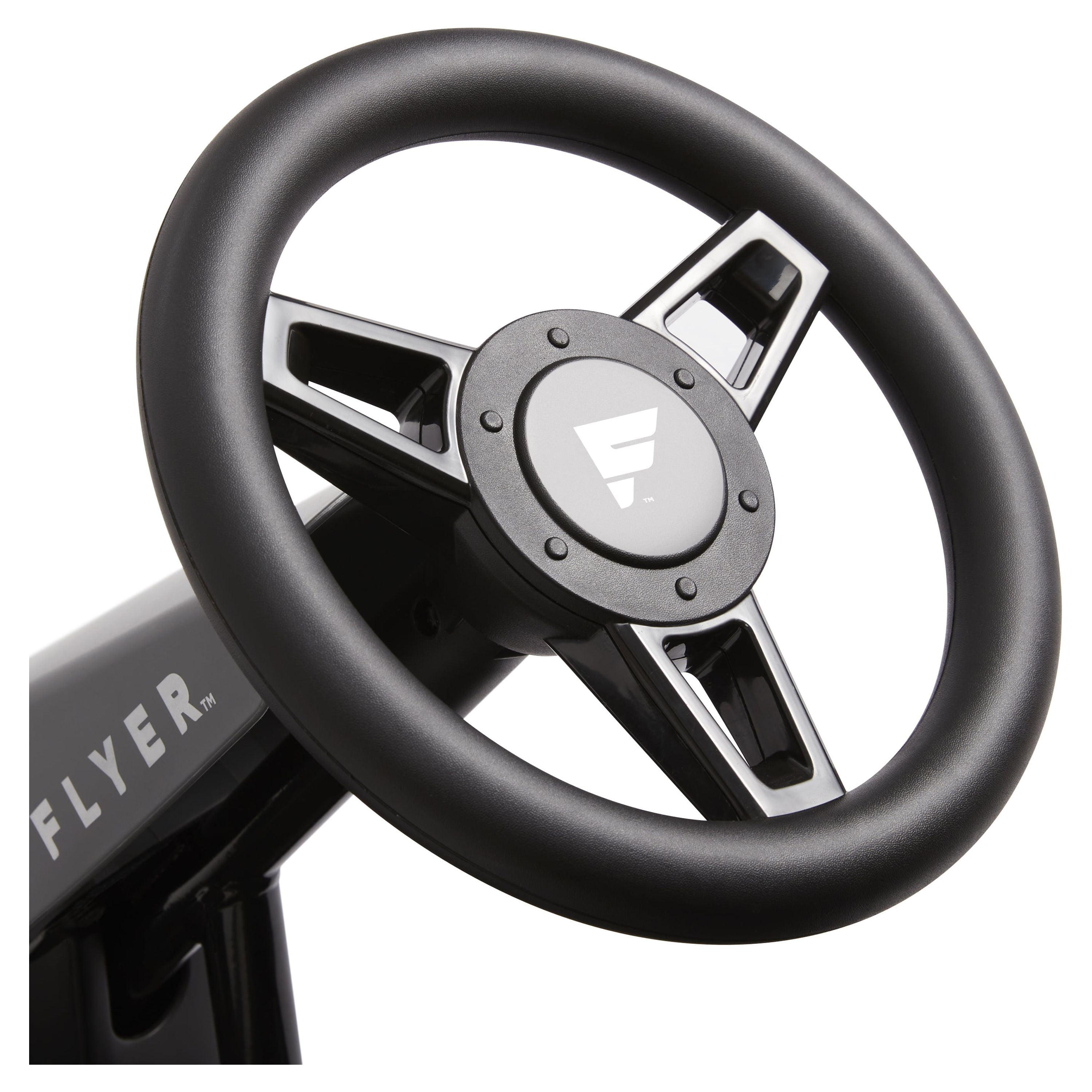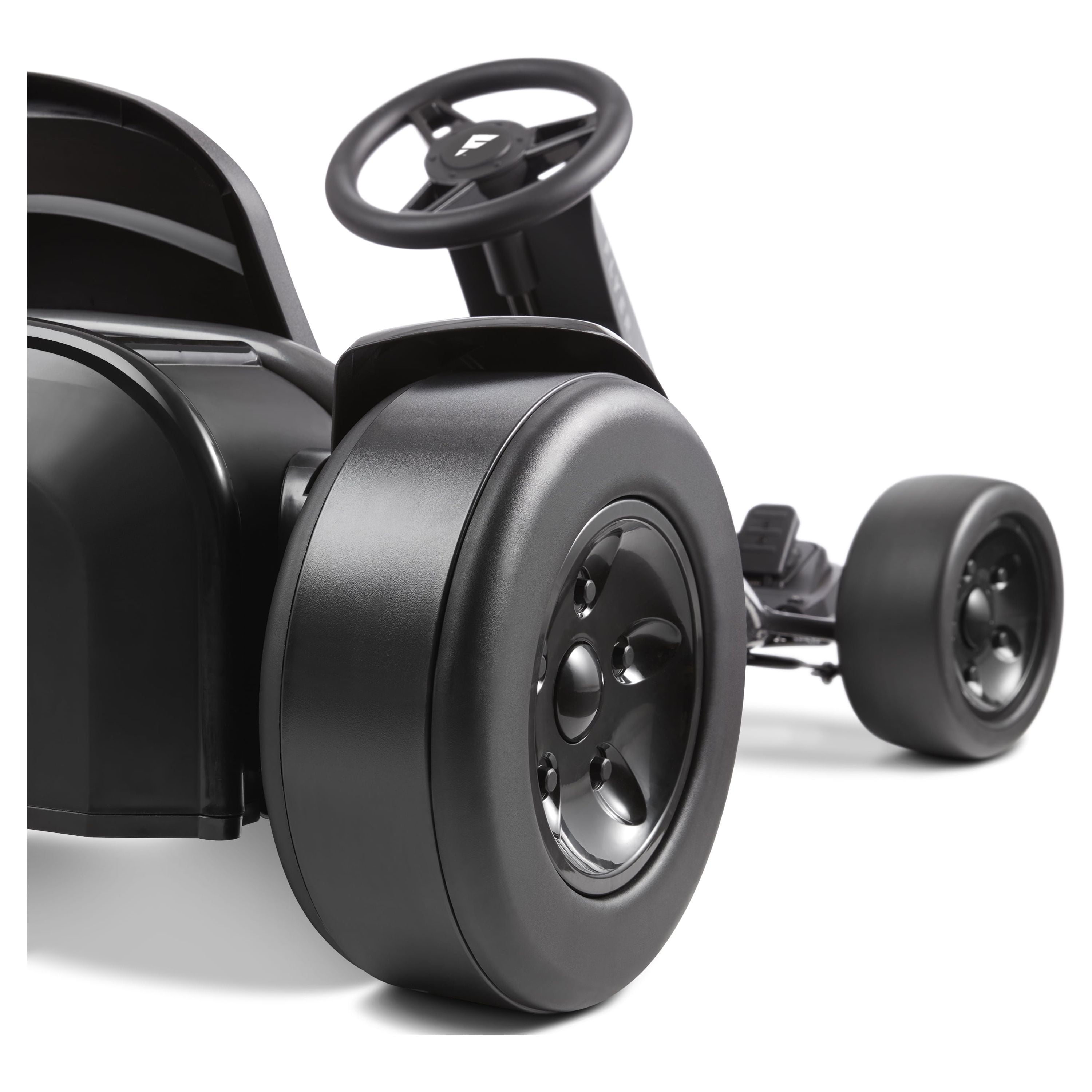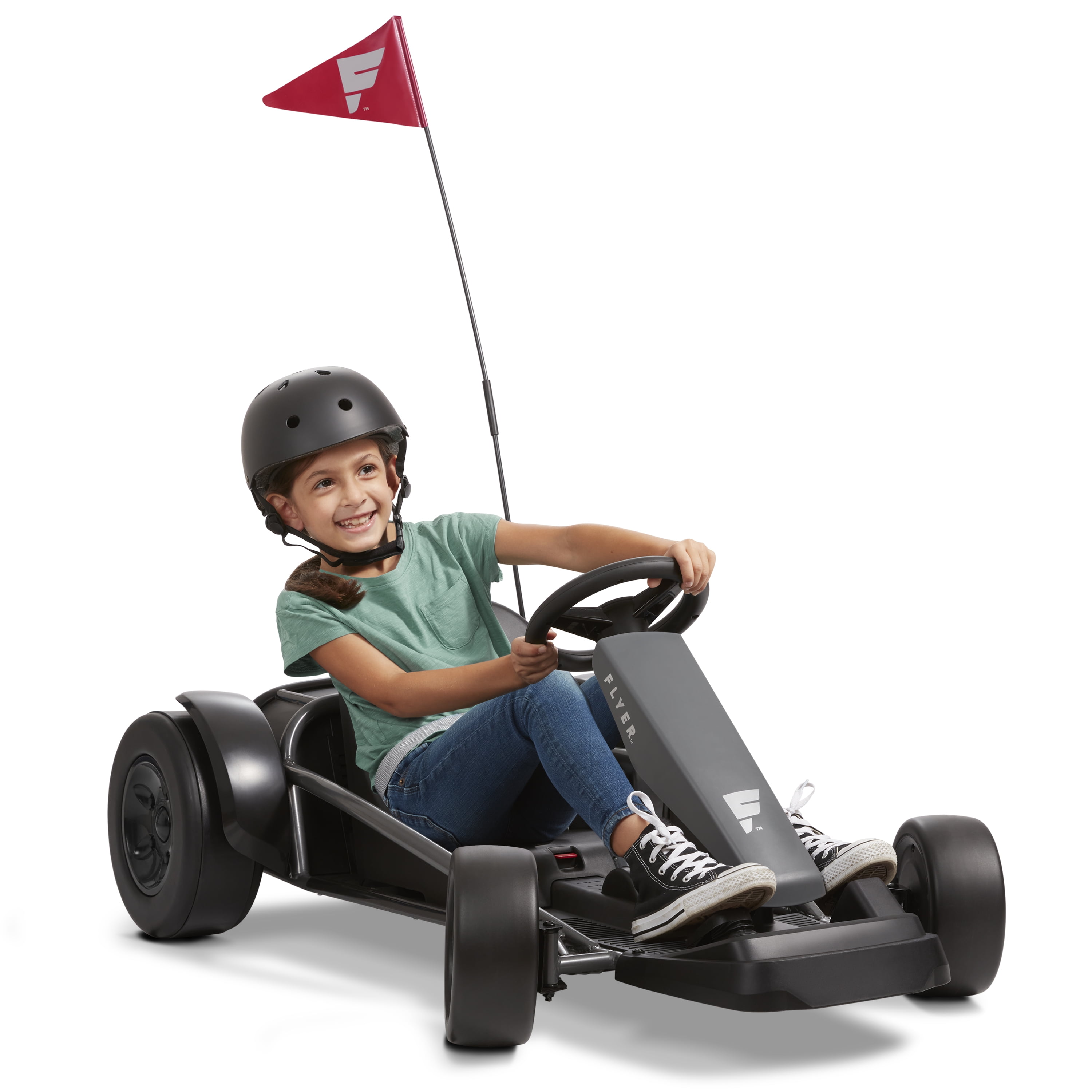 Experience the thrill of racing right at home with Flyer’s Extreme Drift Go-Kart. This 36-volt battery powered car is designed with a low center of gravity, high grip front tires, and slick rear wheels for ultimate drifting action. With three forward speed settings and a top speed of 11 MPH, this go-kart is Radio Flyer’s fastest yet. The throttle pedal allows better control. Enjoy single speed reverse and automatic braking. The seat is easily adjusted to grow with your child. You’ll also have a battery capacity indicator, so you’re always prepared for a recharge. For added safety, the go-kart automatically stops once the pedal is released, with a racing flag for added visibility, a seat belt, and a parent-controlled speed lock. 36V battery and charger included. Maximum weight capacity 130 lbs. Speeds 1 &2: Ages 5+. Speed 3: Ages 13+.