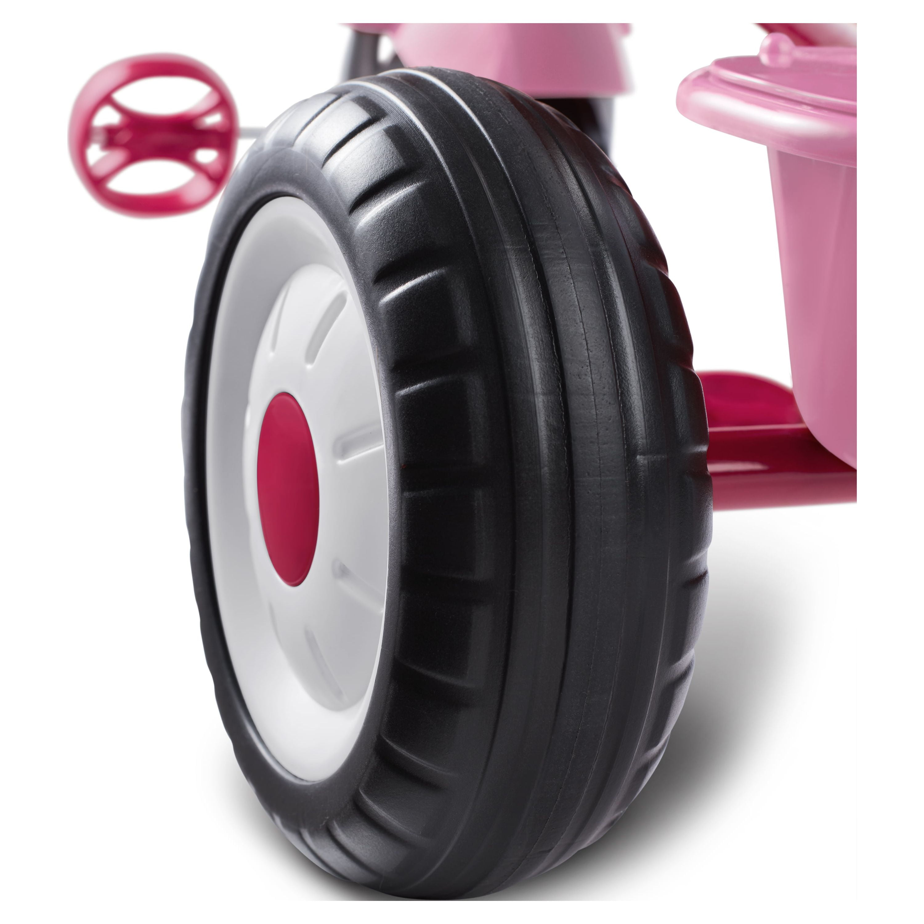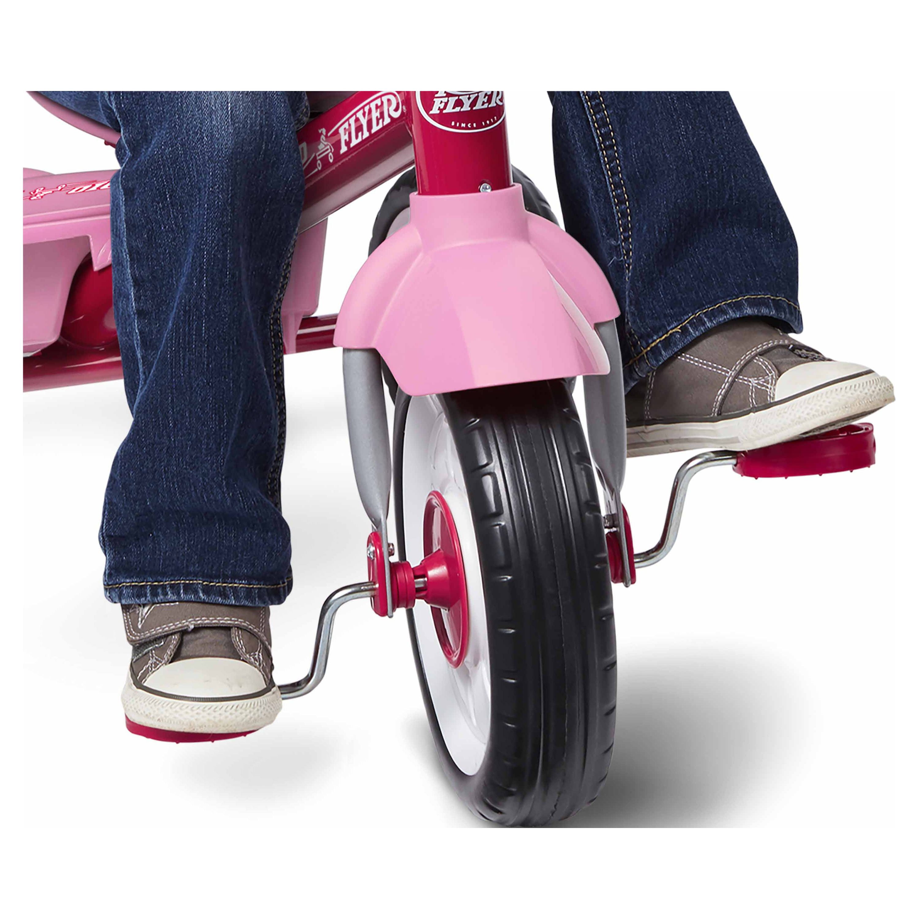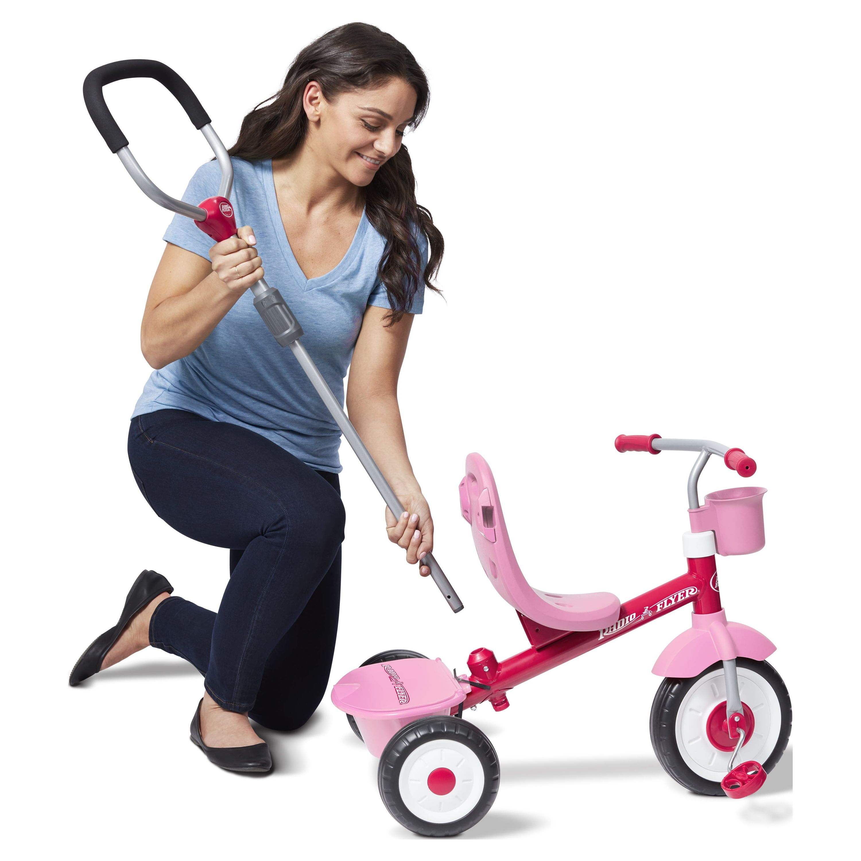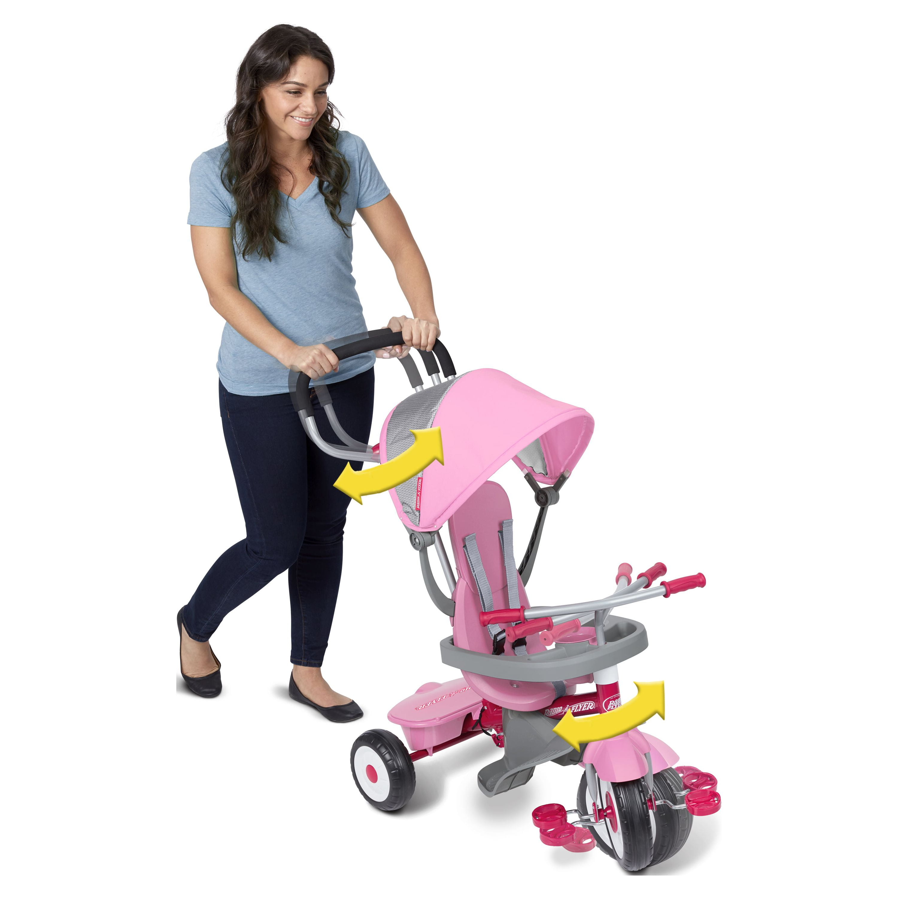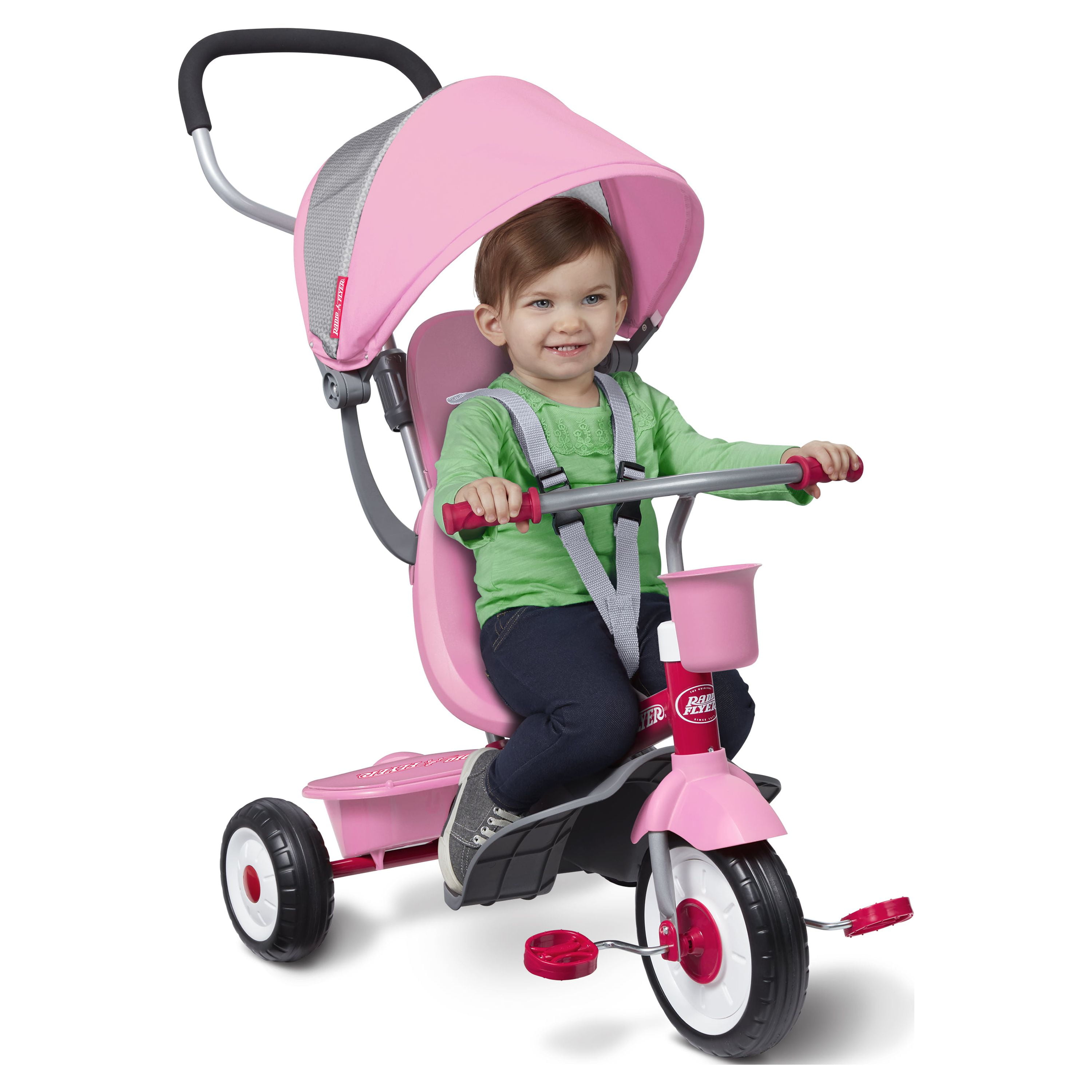 Radio Flyer 4-in-1 Stroll ‘N Trike: 4 ways to ride: infant trike, steering trike, learn-to-ride trike and classic trike Secure 3-point harness and high back seat for infant safety Adjustable seat grows with your child Adult Steer & Stroll® adjustable push handle with foam grip Removable footrest for younger riders Maximum weight capacity 49 lbs. For 1 to 5 years If you have any questions regarding your product, please contact Radio Flyer Customer Service at 1 (800) 621-7613 or email us at [email protected].